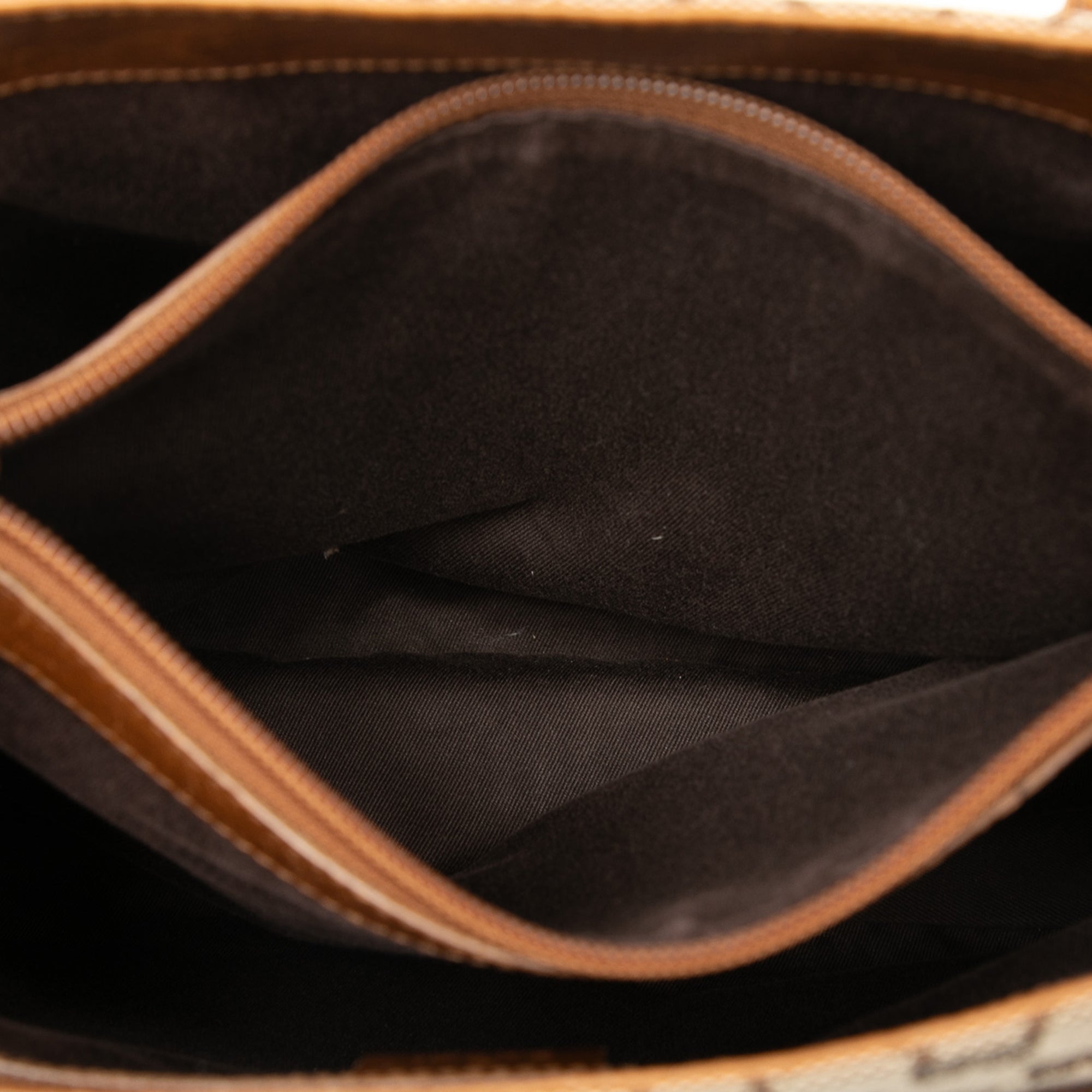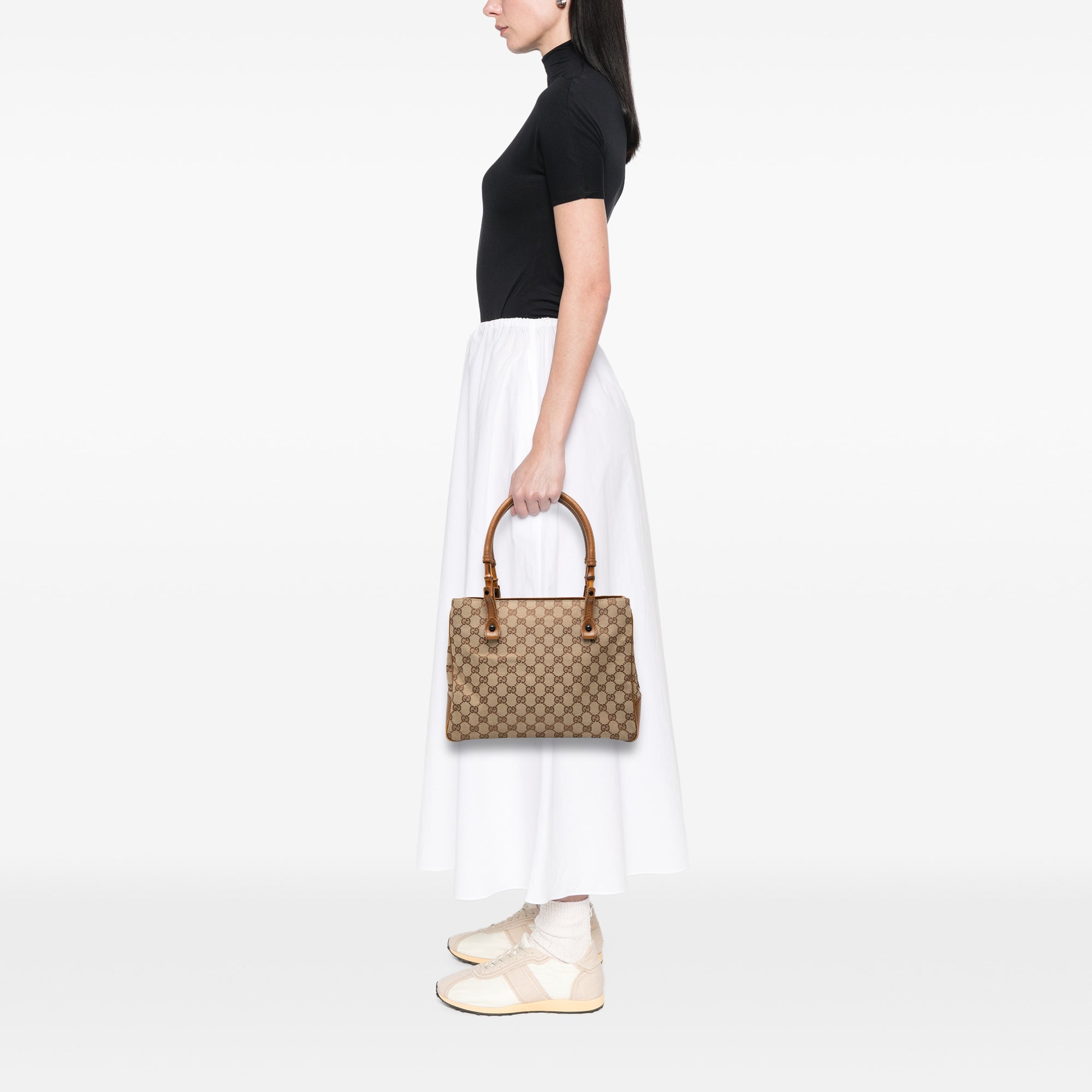 This tote bag features a canvas body with leather trim, rolled leather handles with bamboo details, an open top, and interior zip pockets. Retail Price: 800.00
