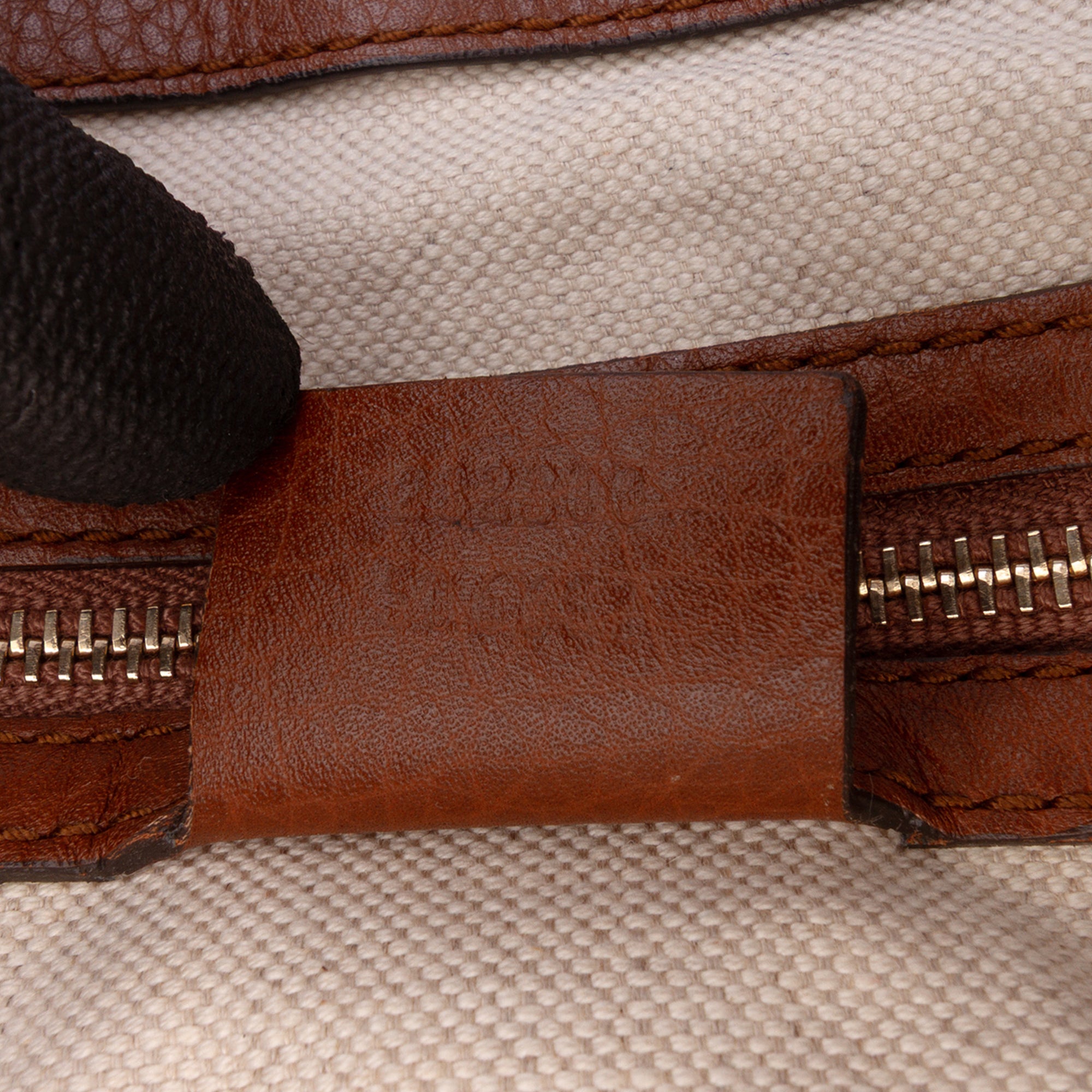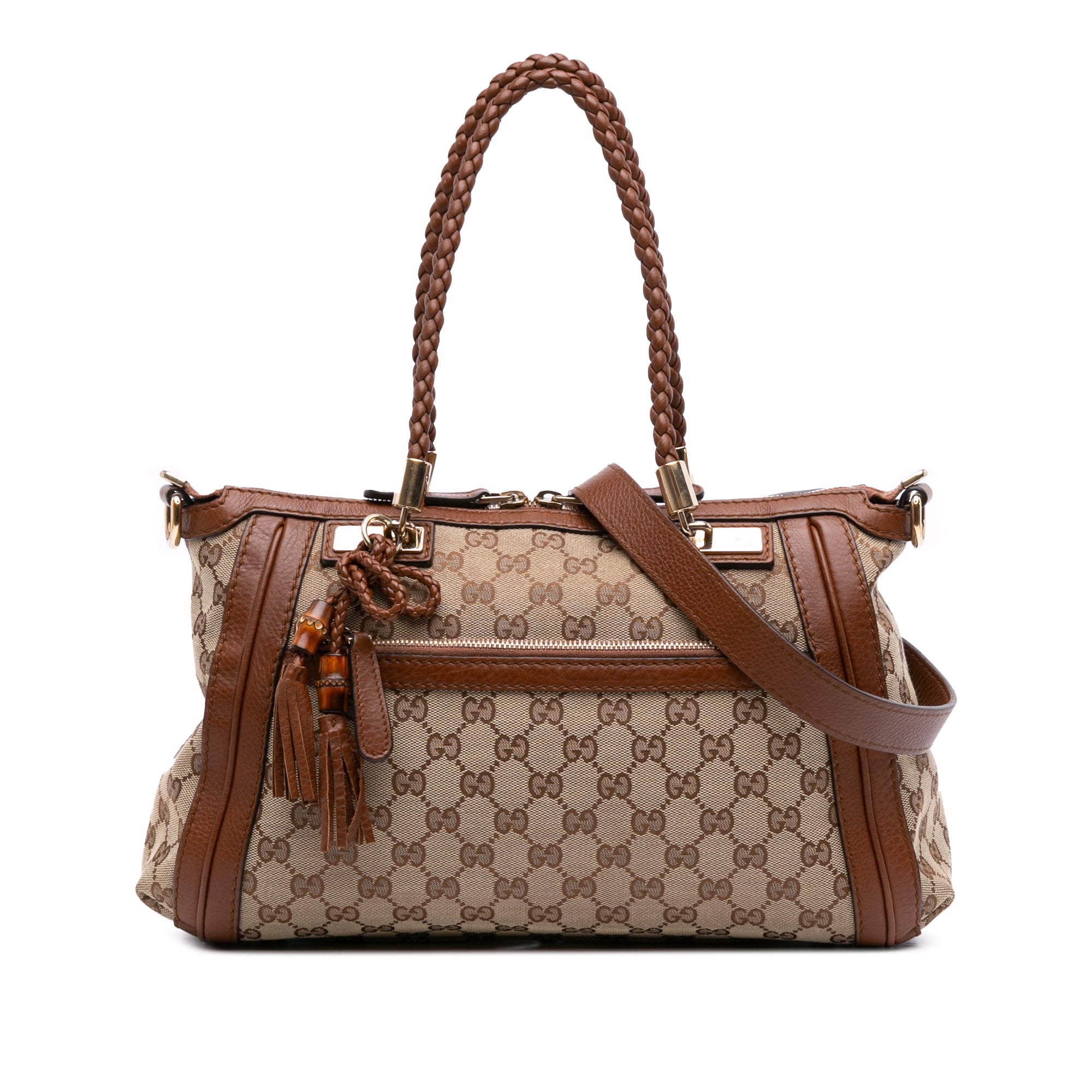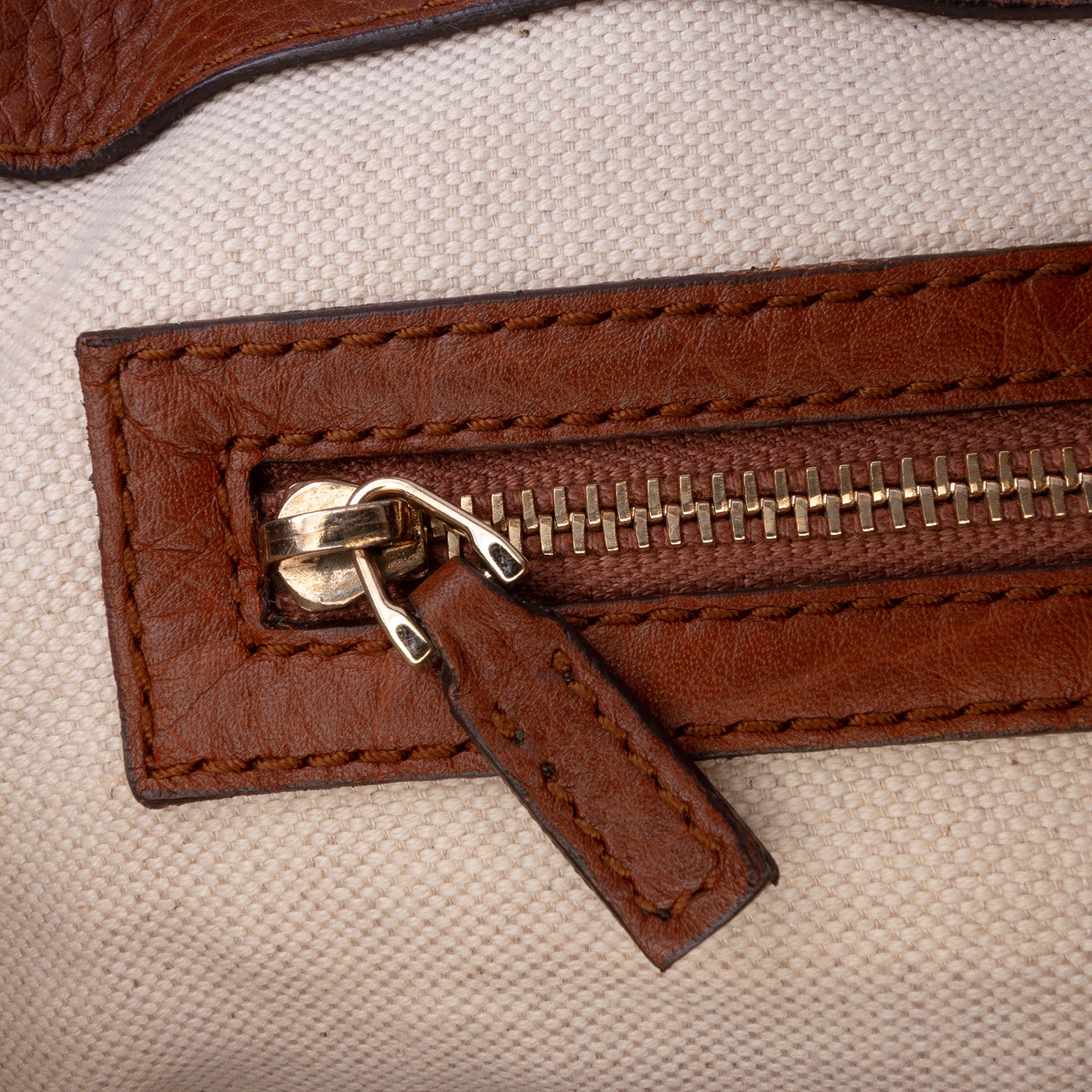 The Bella features a canvas body with leather trim, a tassel charm, braided leather handles, a detachable flat leather shoulder strap, a top zip closure, an exterior front zip pocket, and interior zip and slip pockets. Retail Price: 1650.00