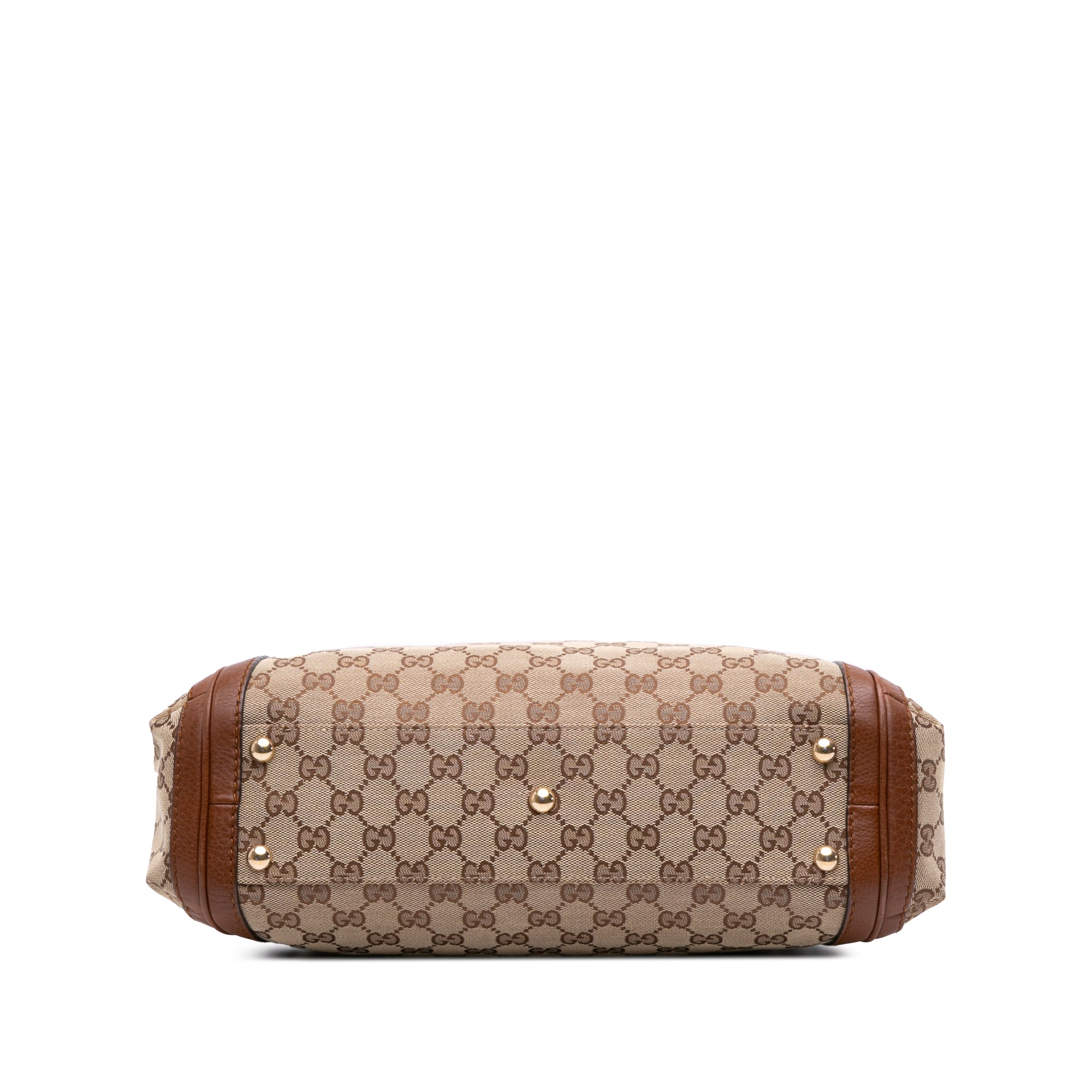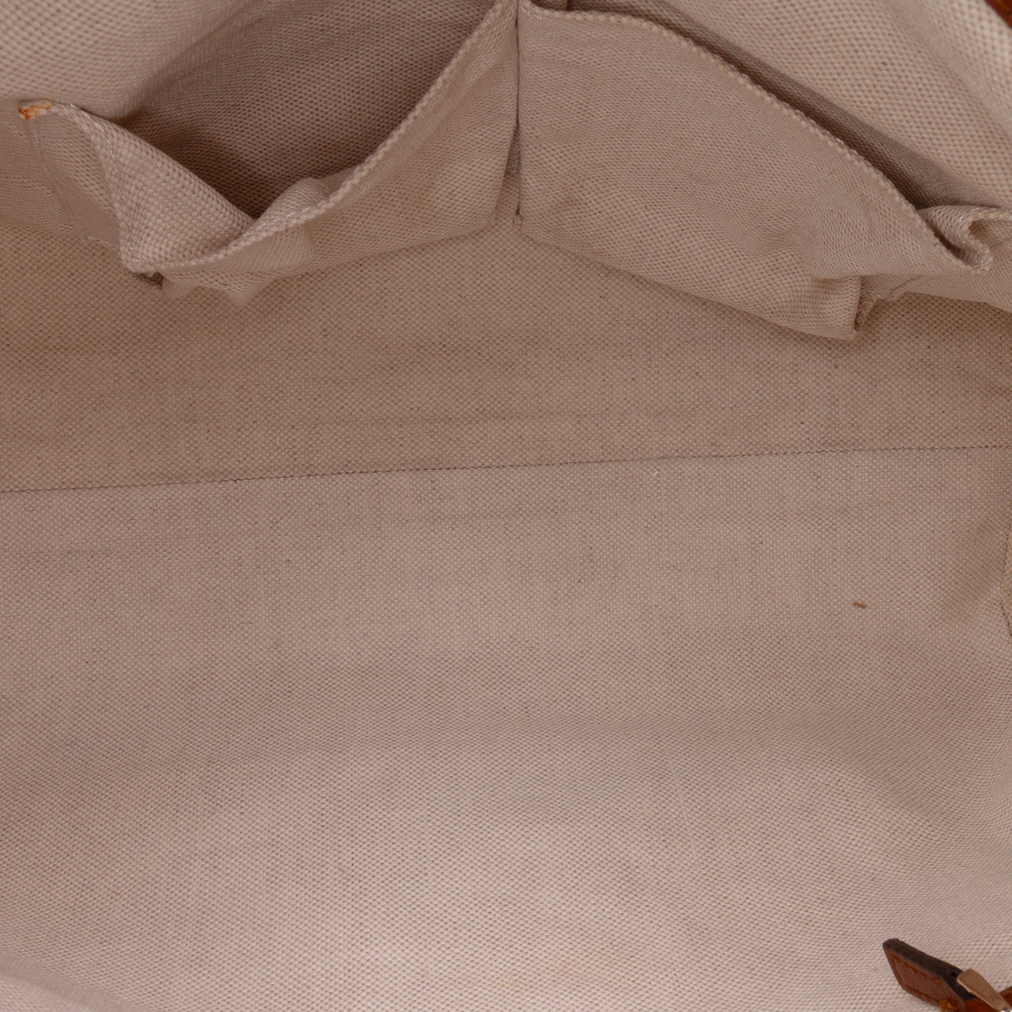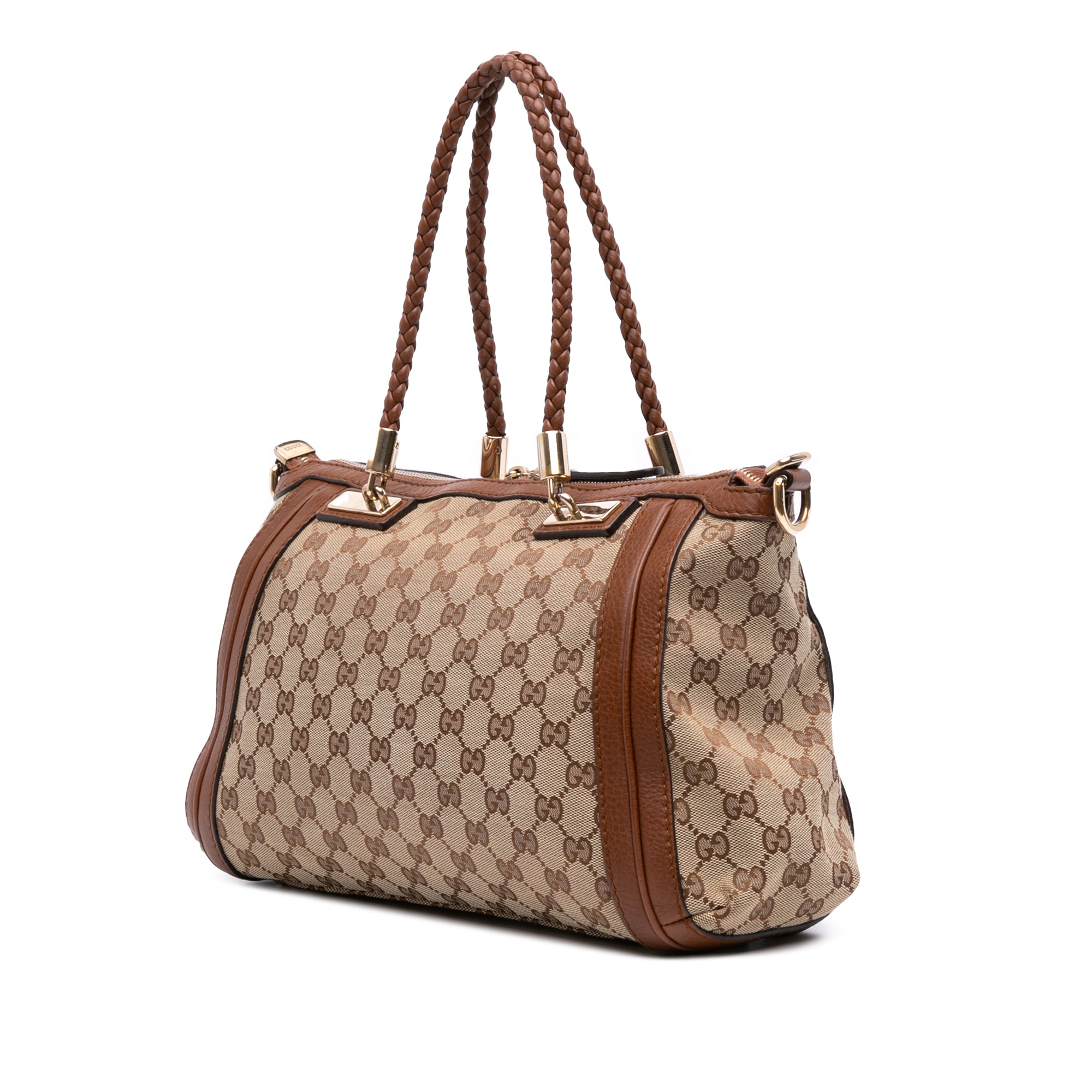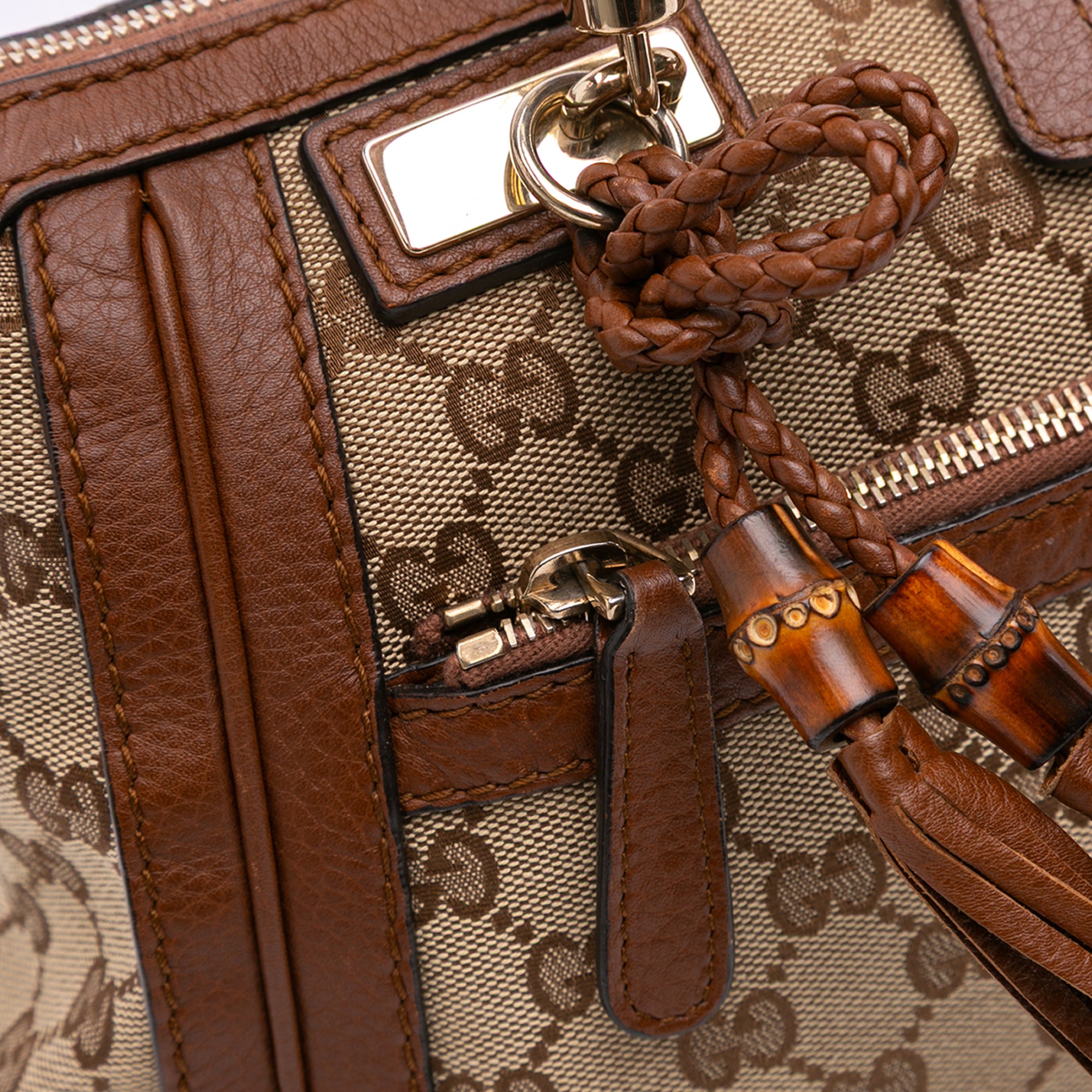 The Bella features a canvas body with leather trim, a tassel charm, braided leather handles, a detachable flat leather shoulder strap, a top zip closure, an exterior front zip pocket, and interior zip and slip pockets. Retail Price: 1650.00
