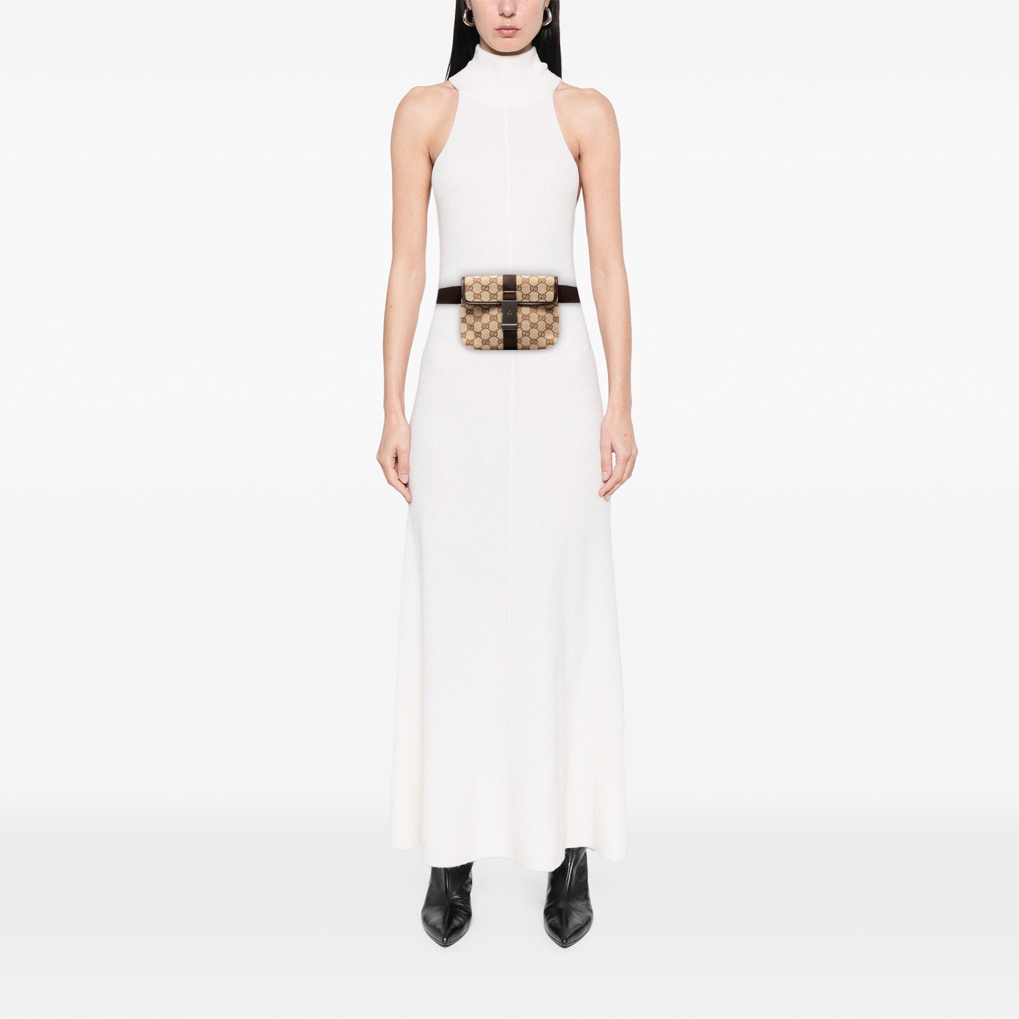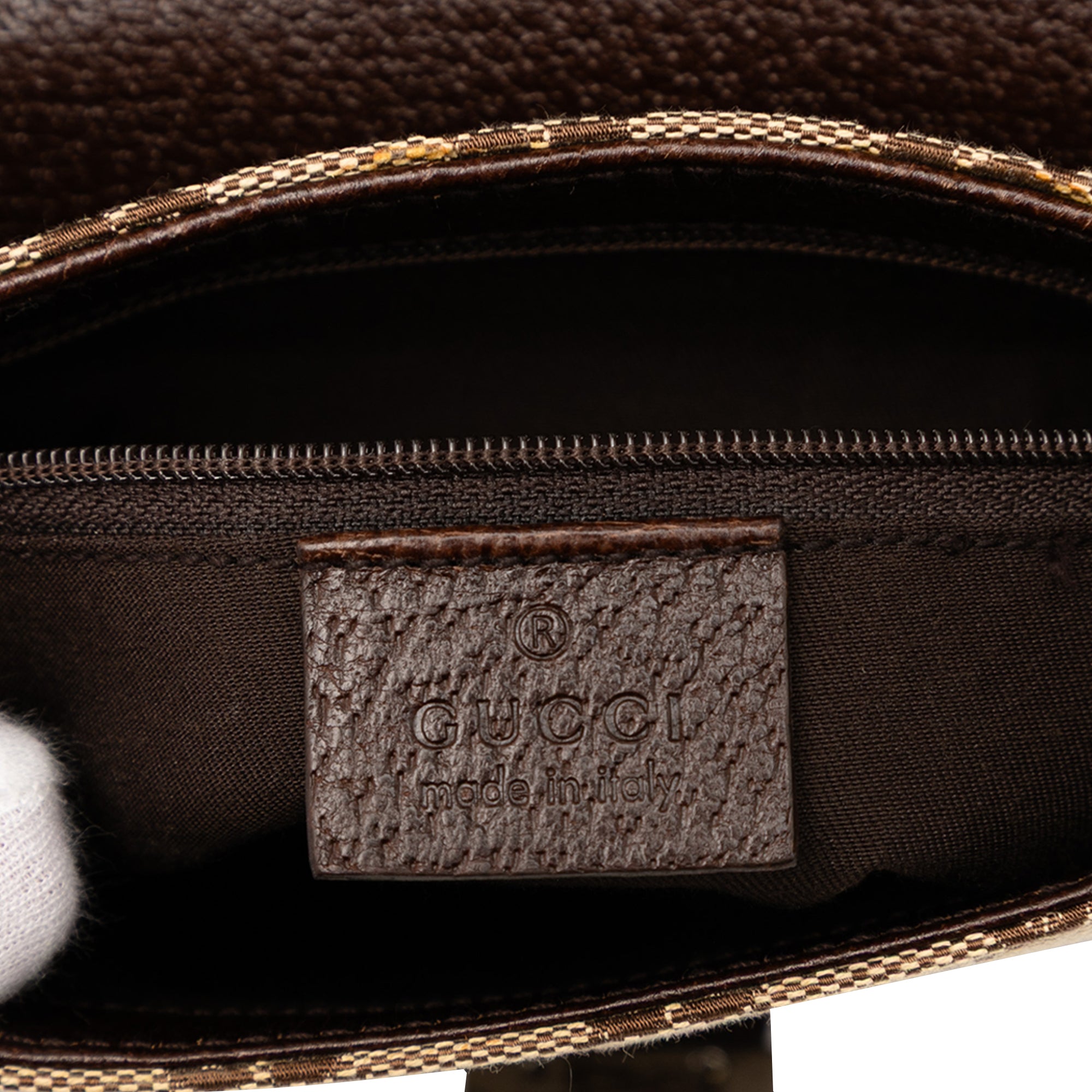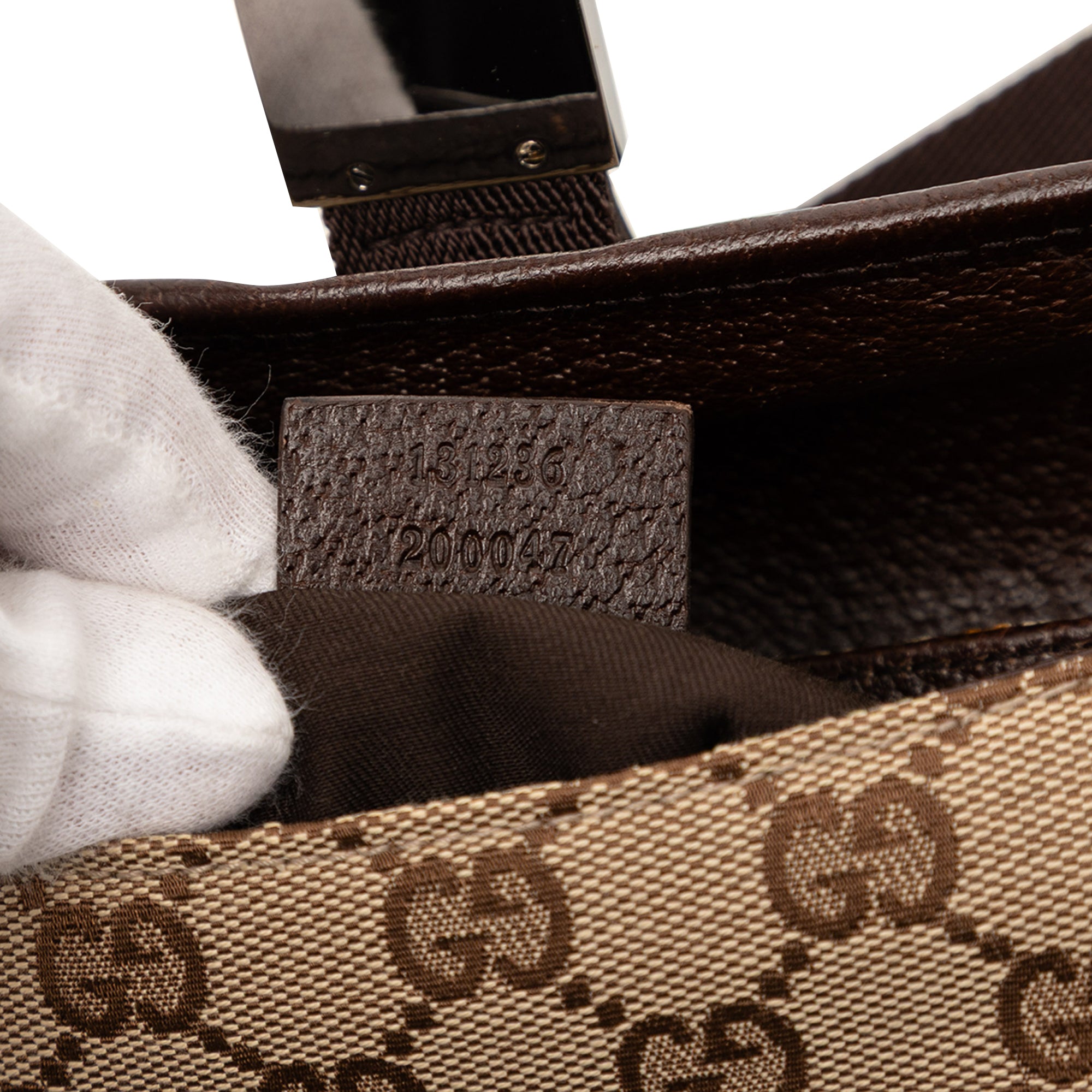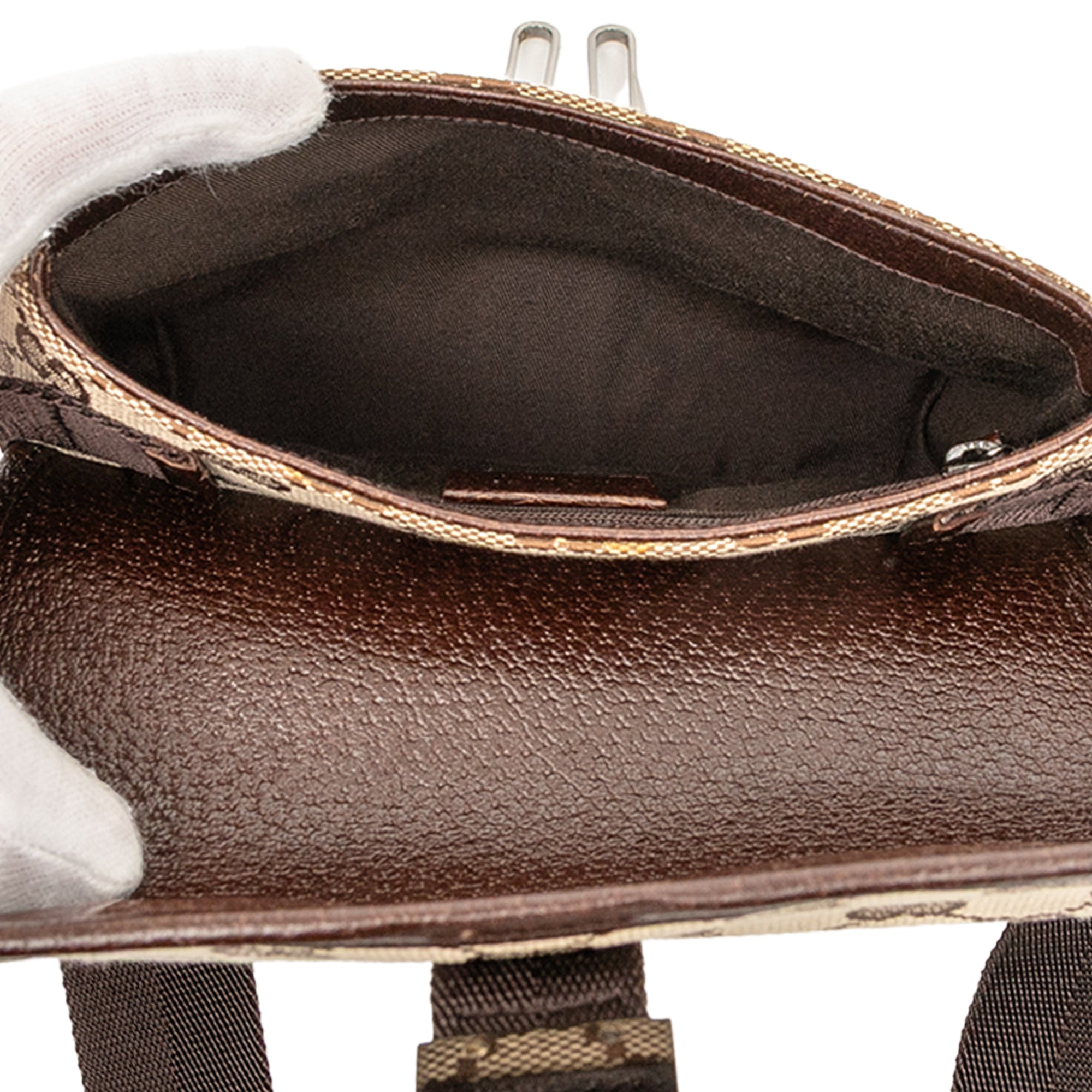 This belt bag features a canvas body with leather trim, an adjustable flat waist strap, a flap with buckle closure, and an interior zip pocket. Inclusion: Dust bag. Retail Price: 900.00