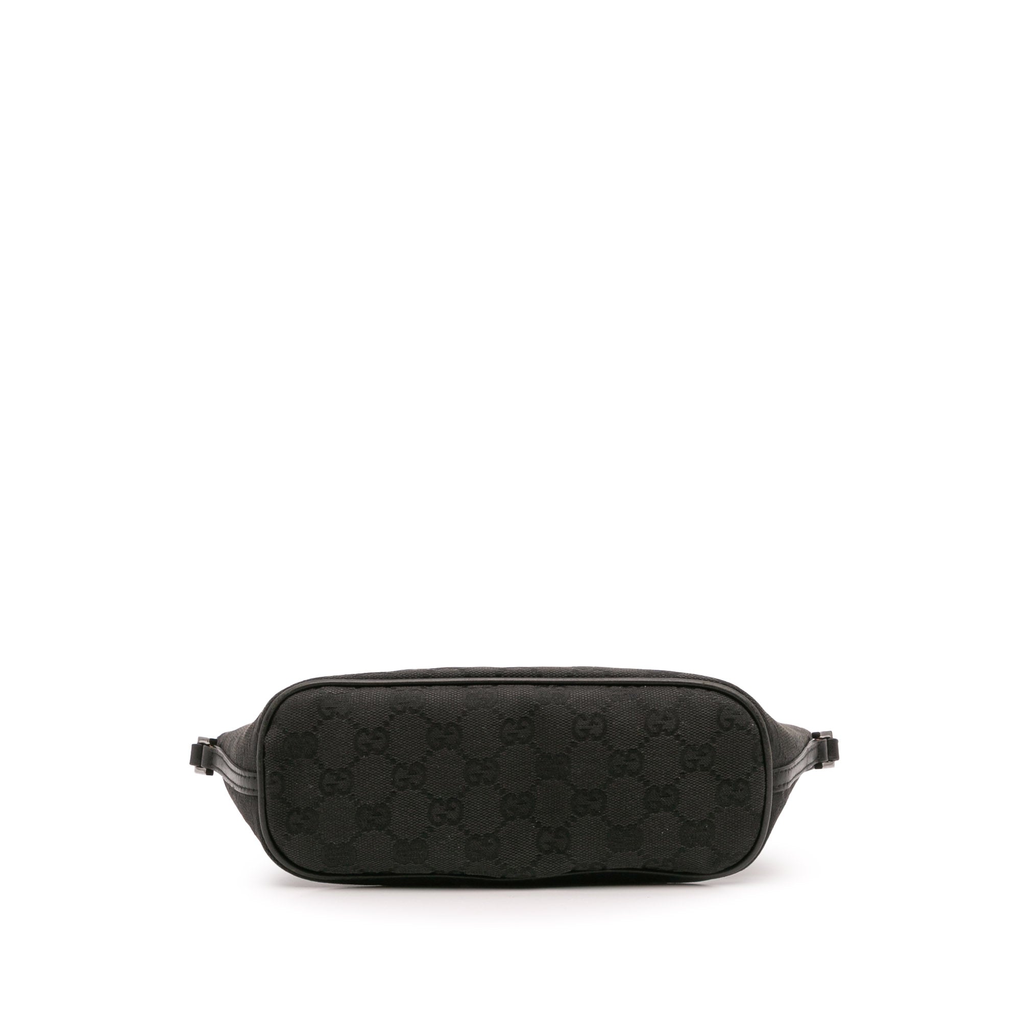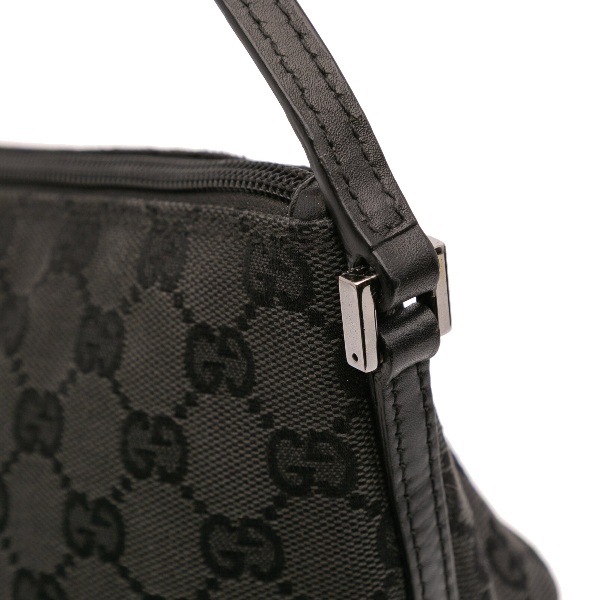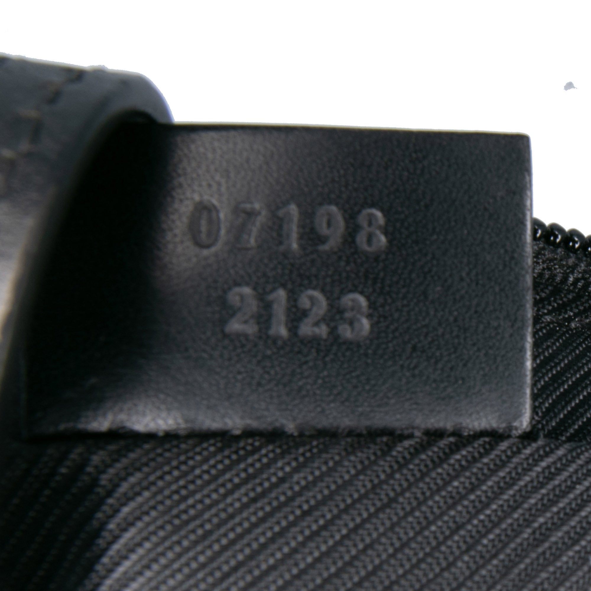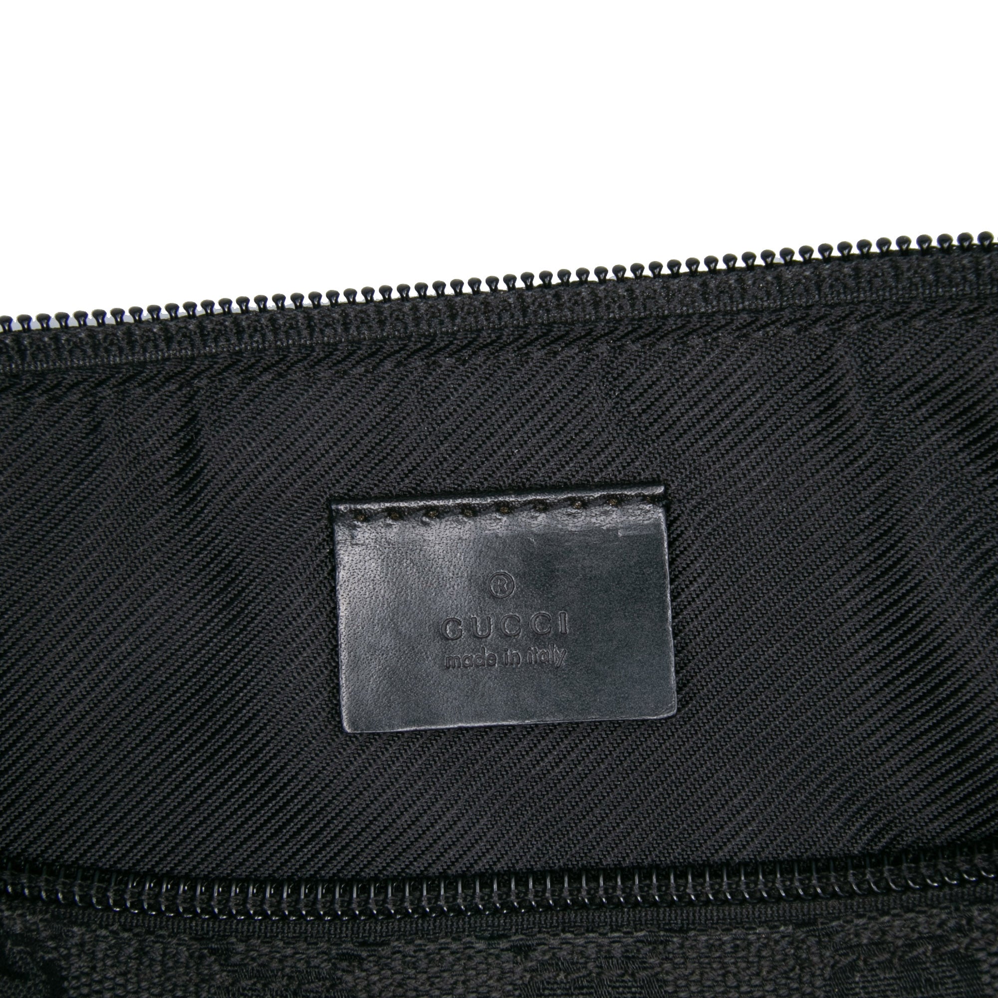 This shoulder bag features a canvas body with leather trim, a flat leather strap, and a top zip closure. Retail Price: 675.00