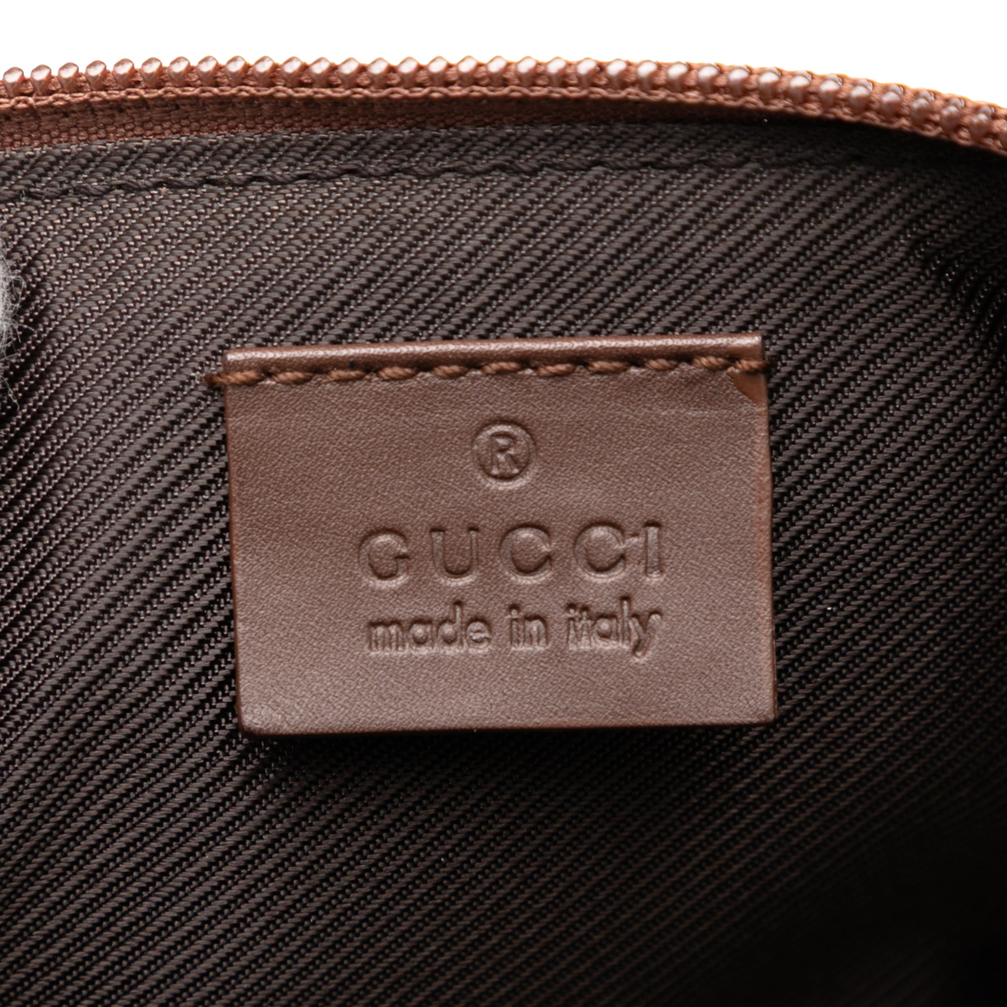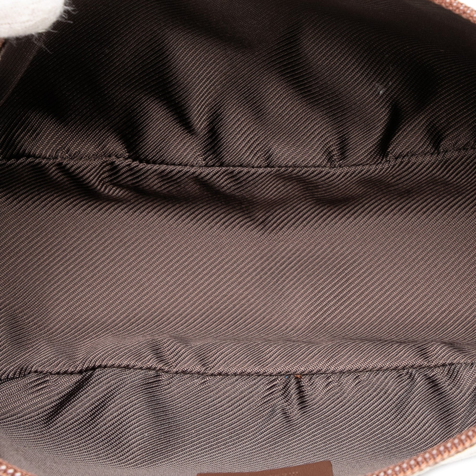 This shoulder bag features a canvas body with leather trim, a flat leather strap, and a top zip closure. Retail Price: 675.00