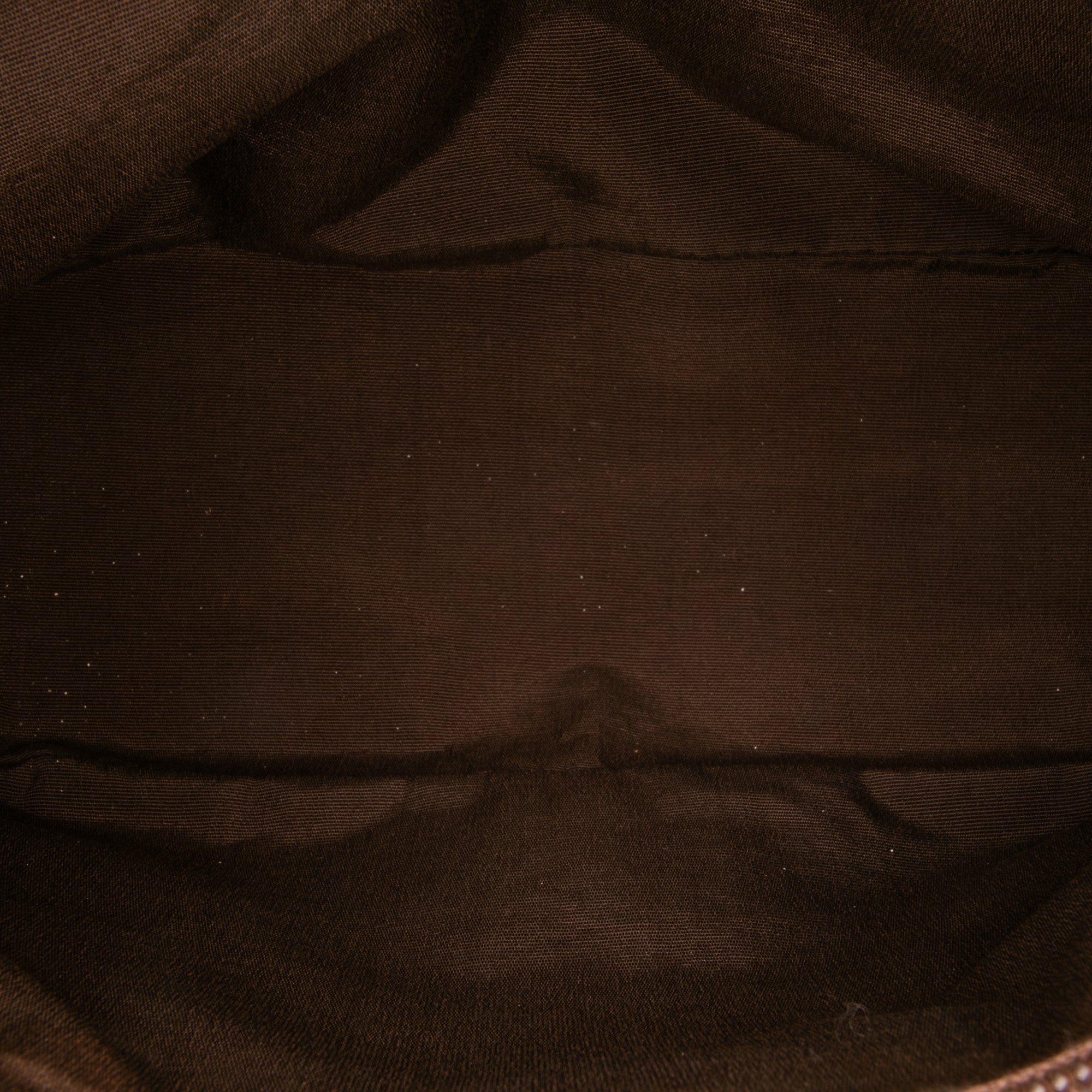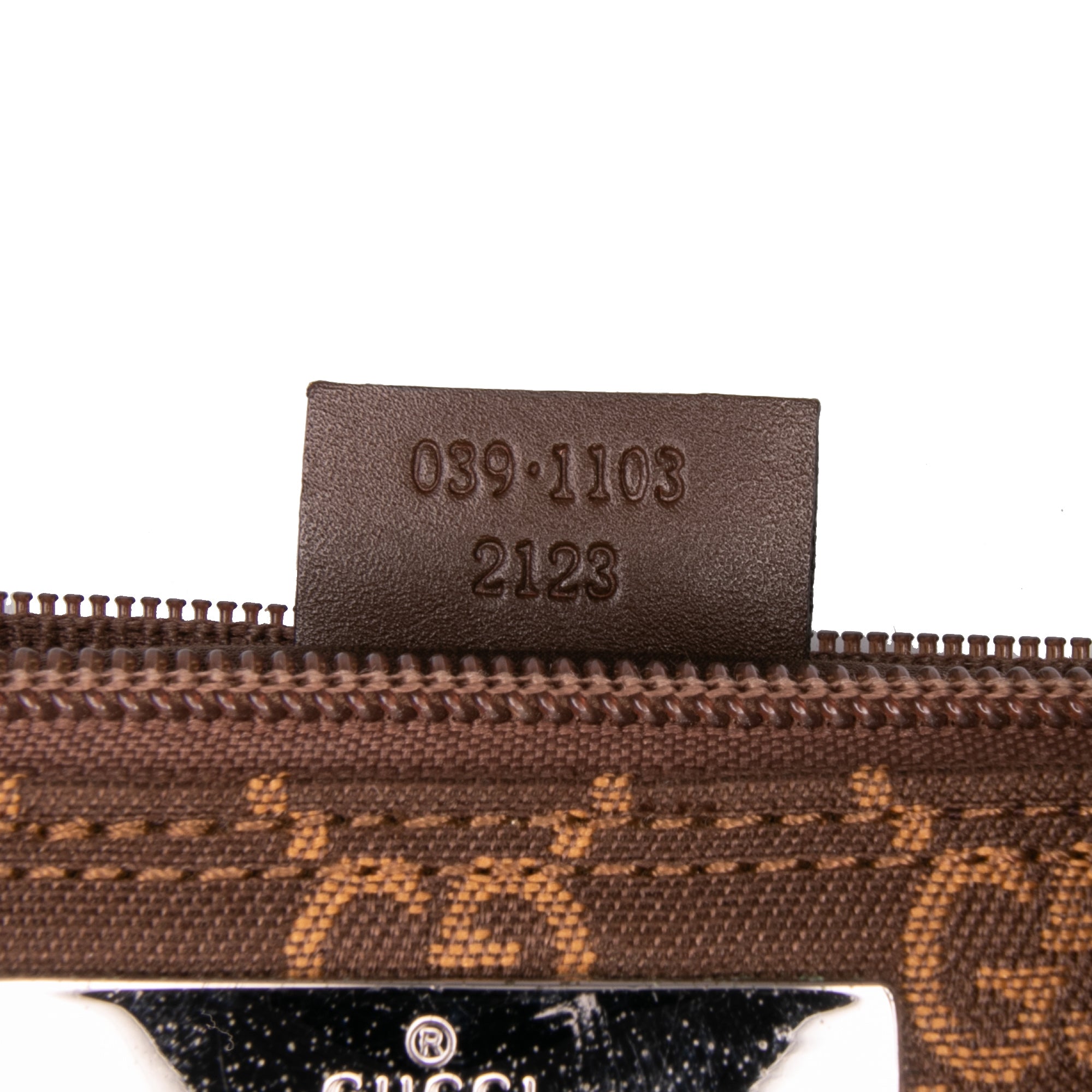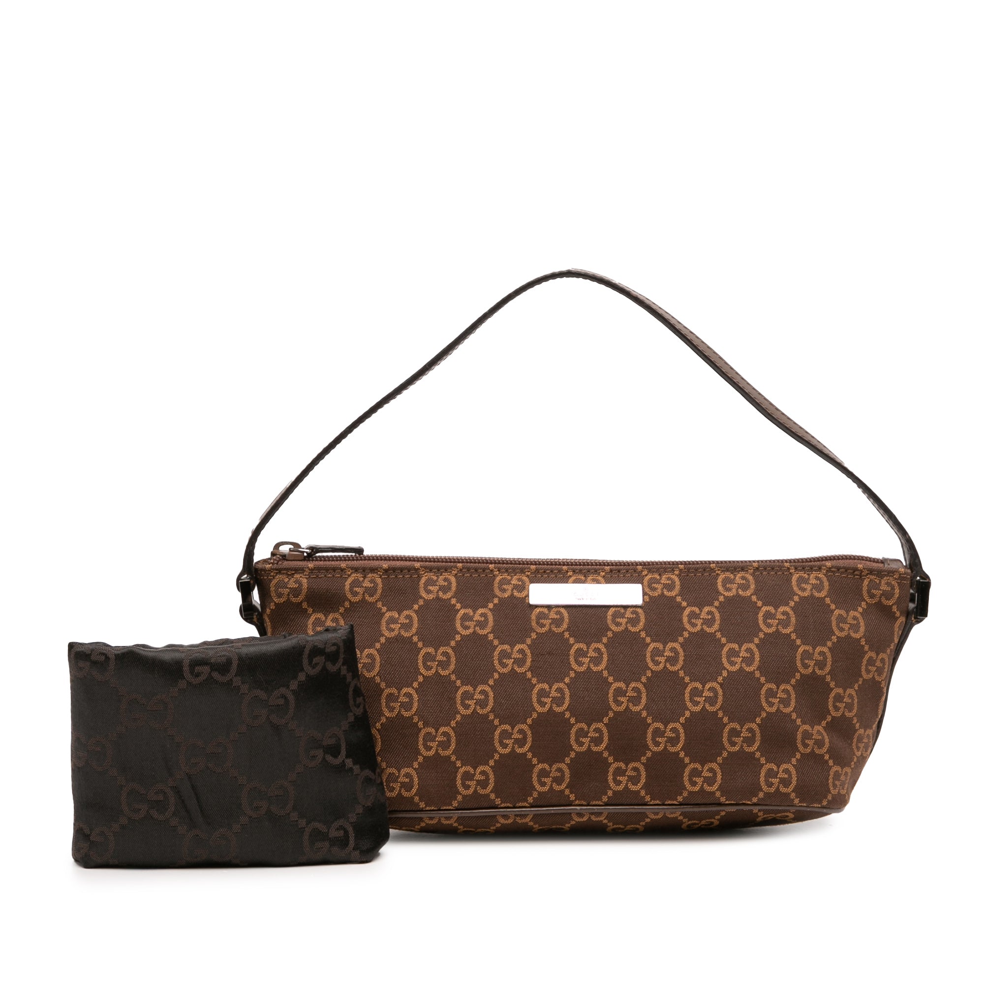 This baguette features a canvas body with leather trim, a flat leather strap, and a top zip closure. Inclusion: Dust bag. Retail Price: 675.00