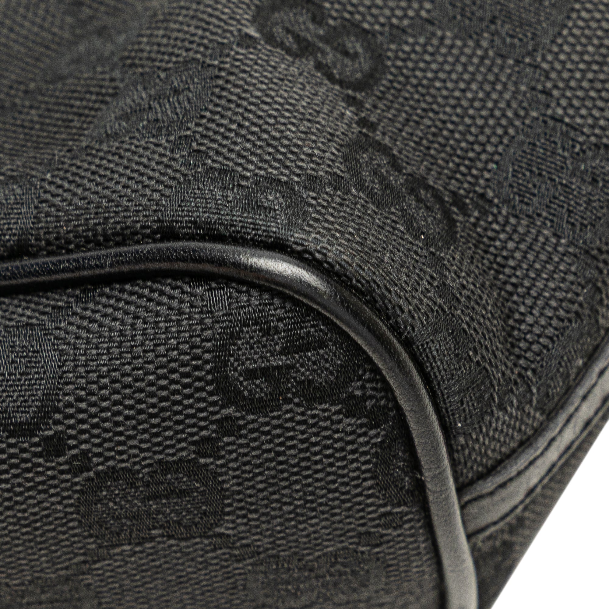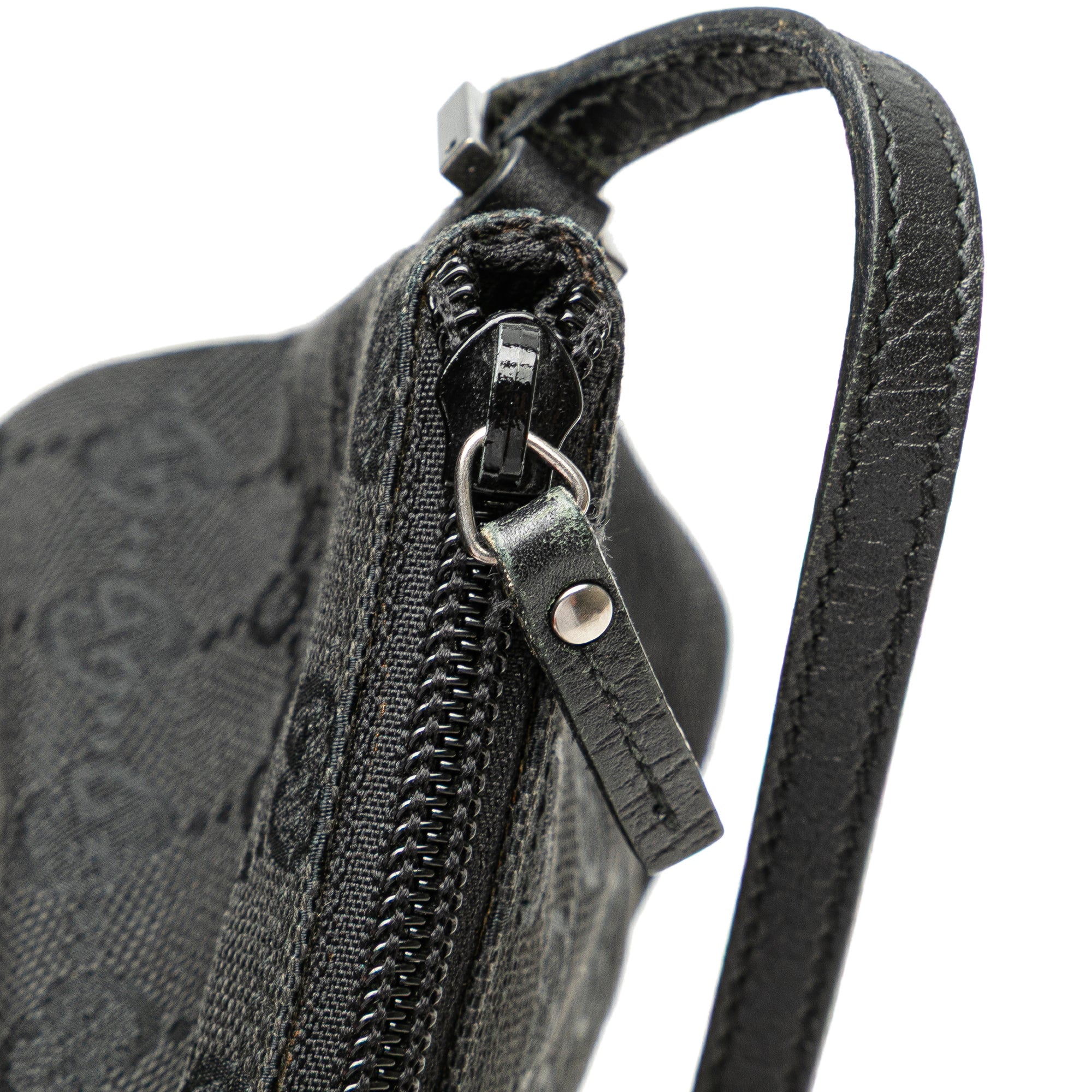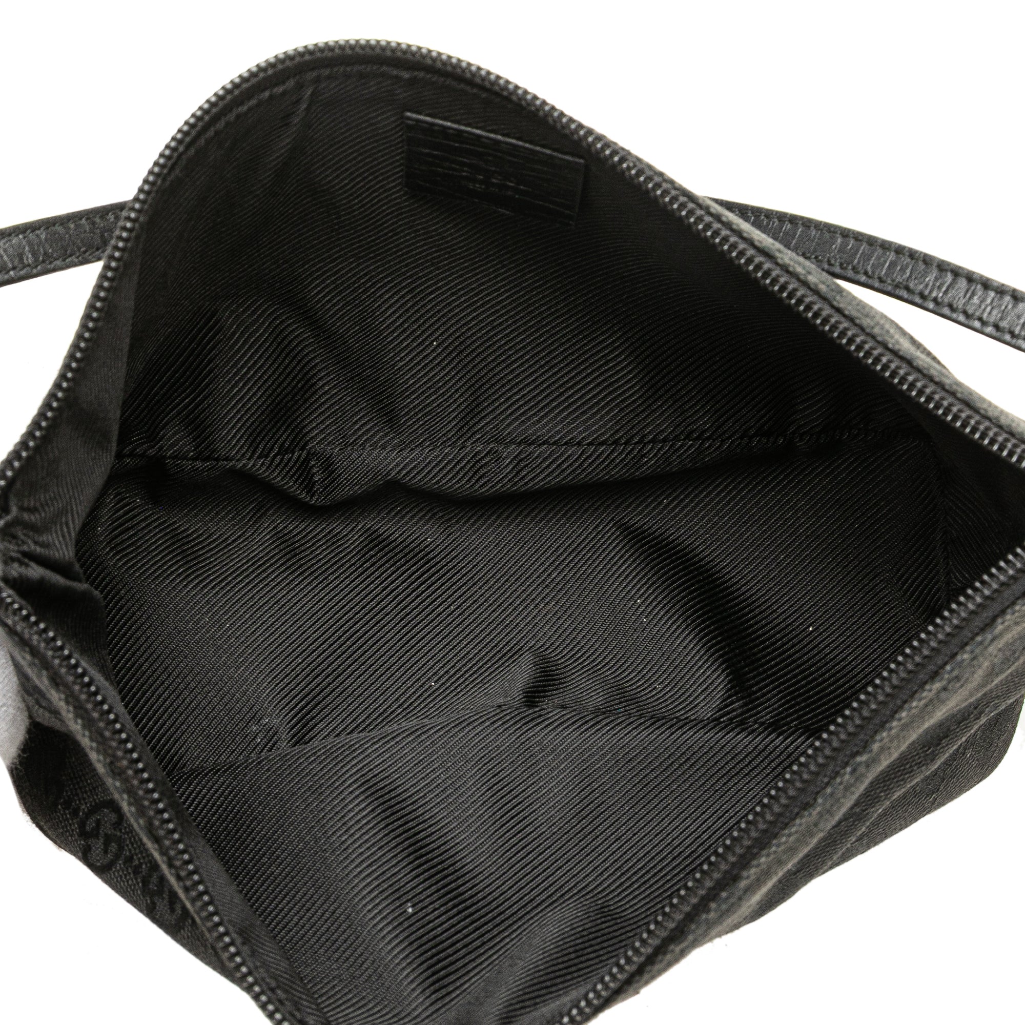 This shoulder bag features a canvas body with leather trim, a flat leather strap, and a top zip closure. Retail Price: 675.00