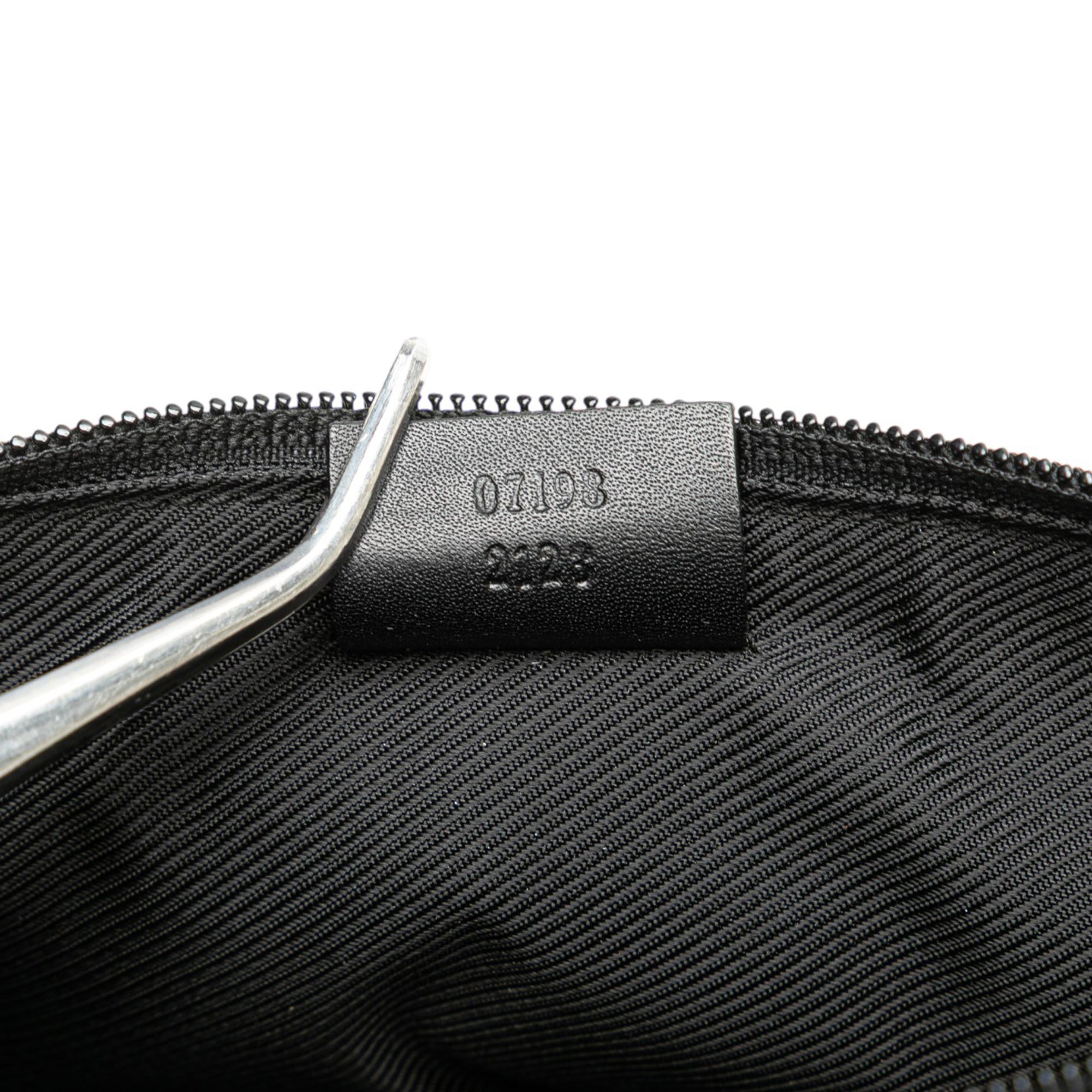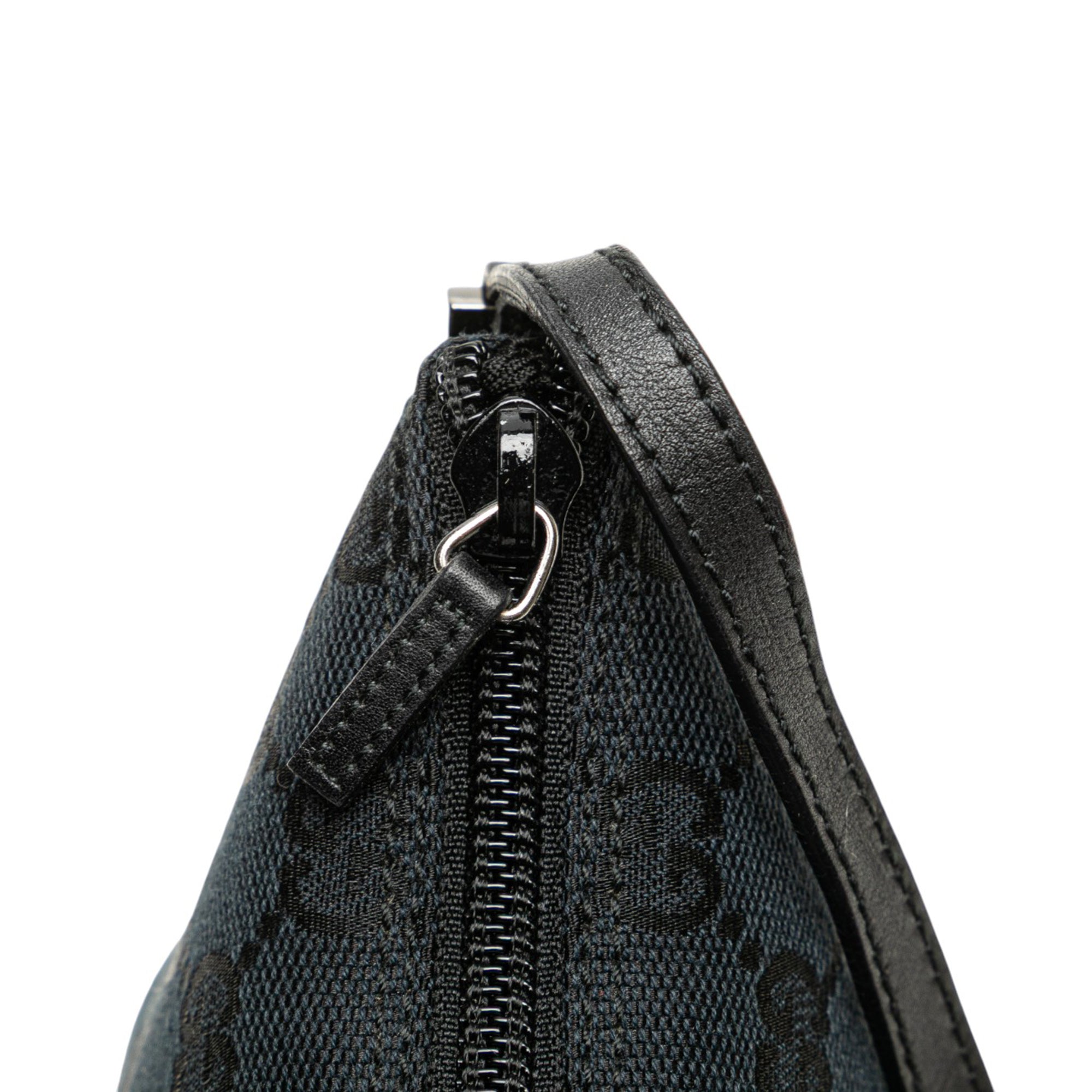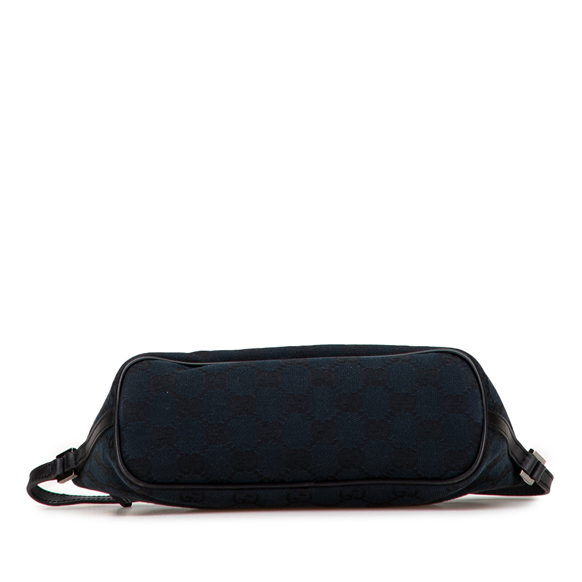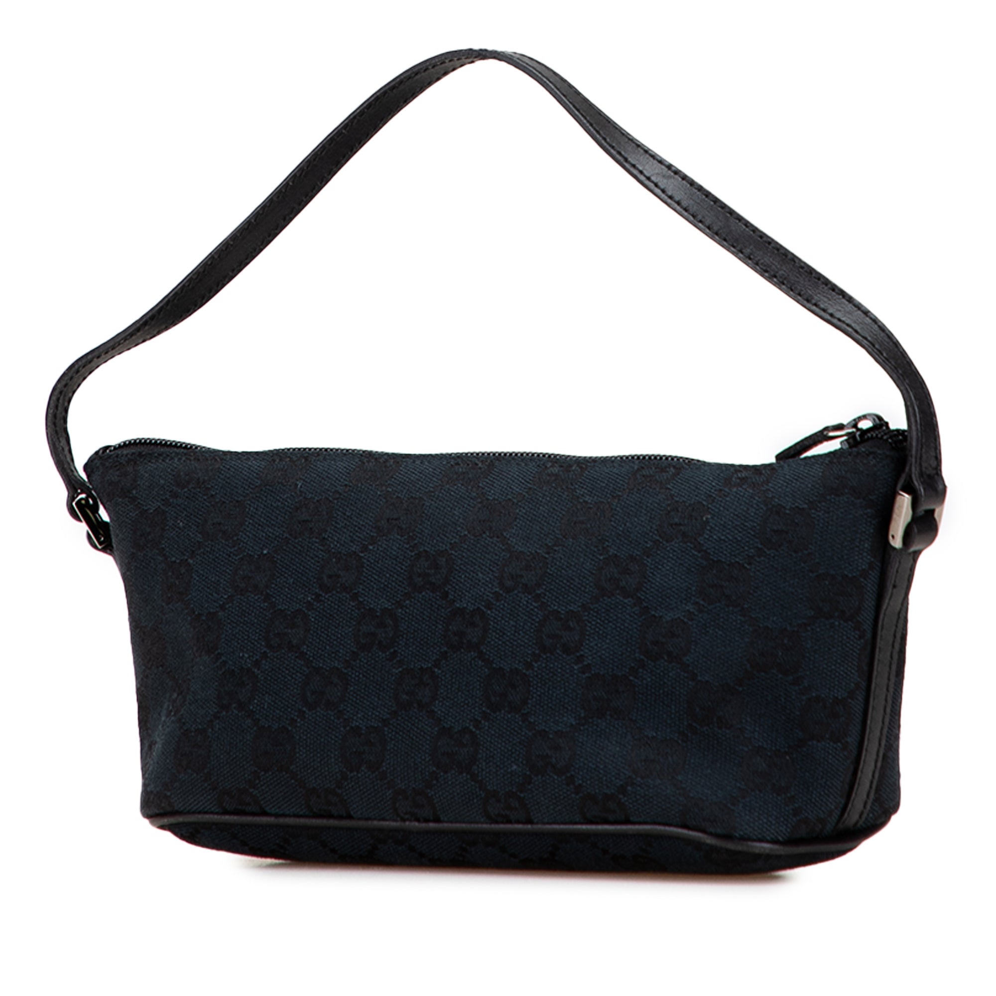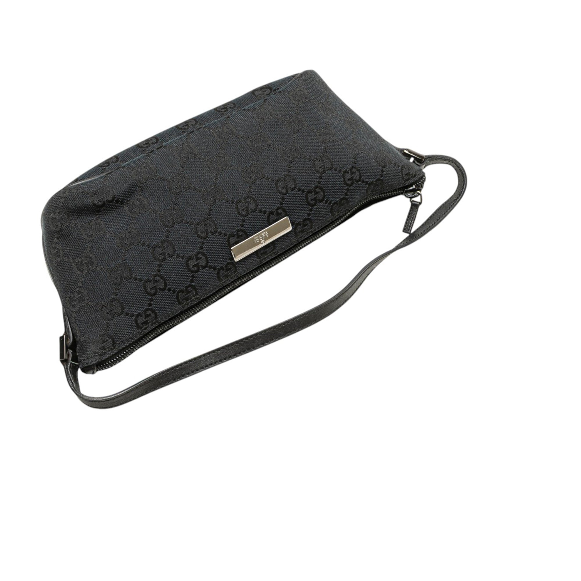 This shoulder bag features a canvas body with leather trim, a flat leather strap, and a top zip closure. Retail Price: 675.00