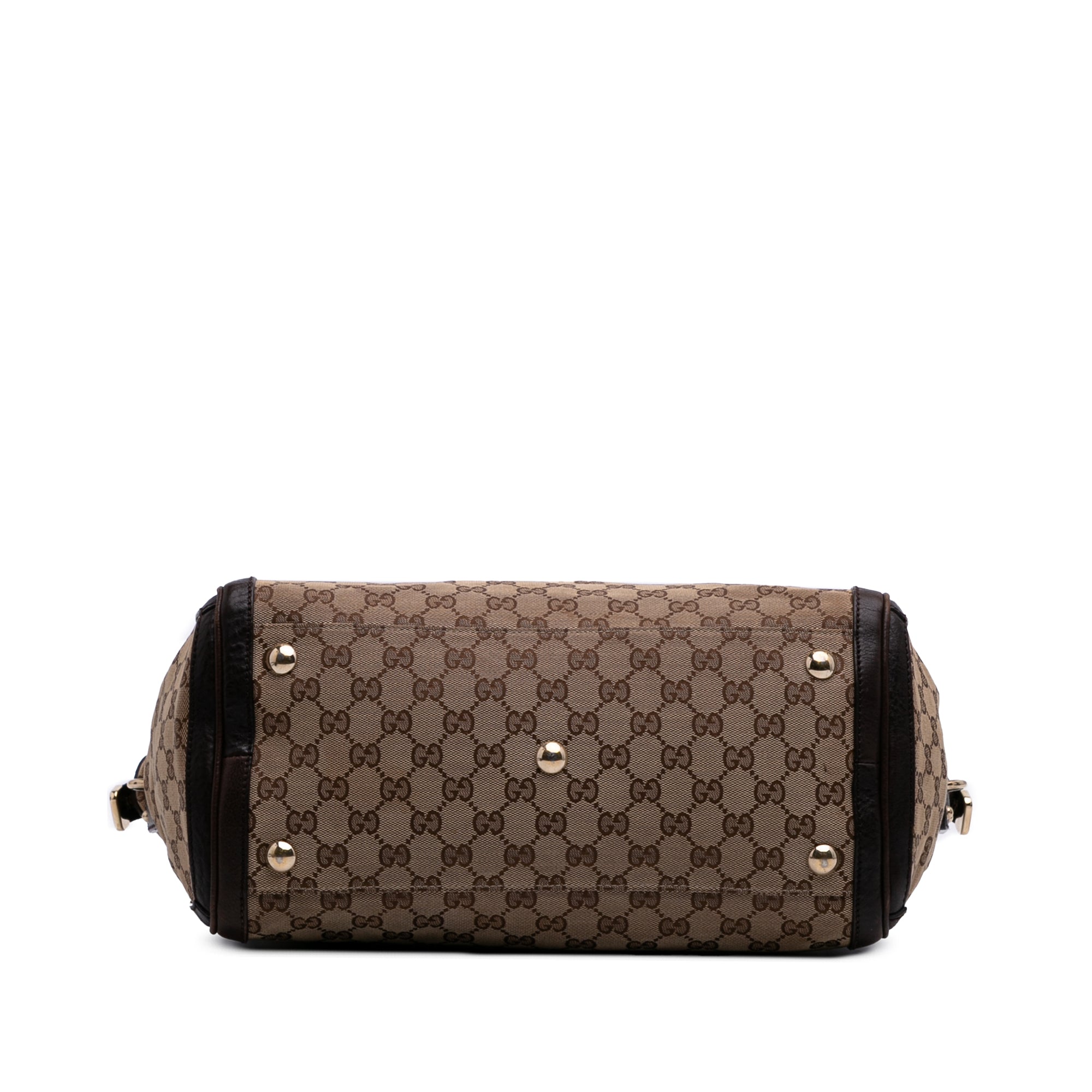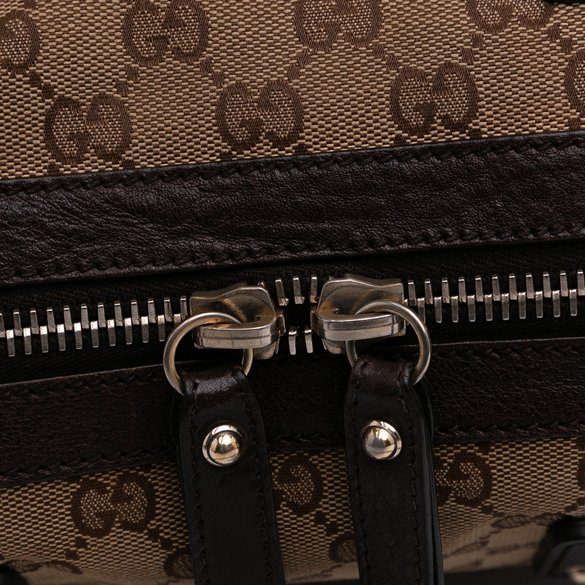This satchel features a canvas body with leather trim, flat leather handles, a detachable flat leather strap, a top zip closure, and interior zip and slip pockets. Inclusion: Dust bag. Retail Price: 1200.00
