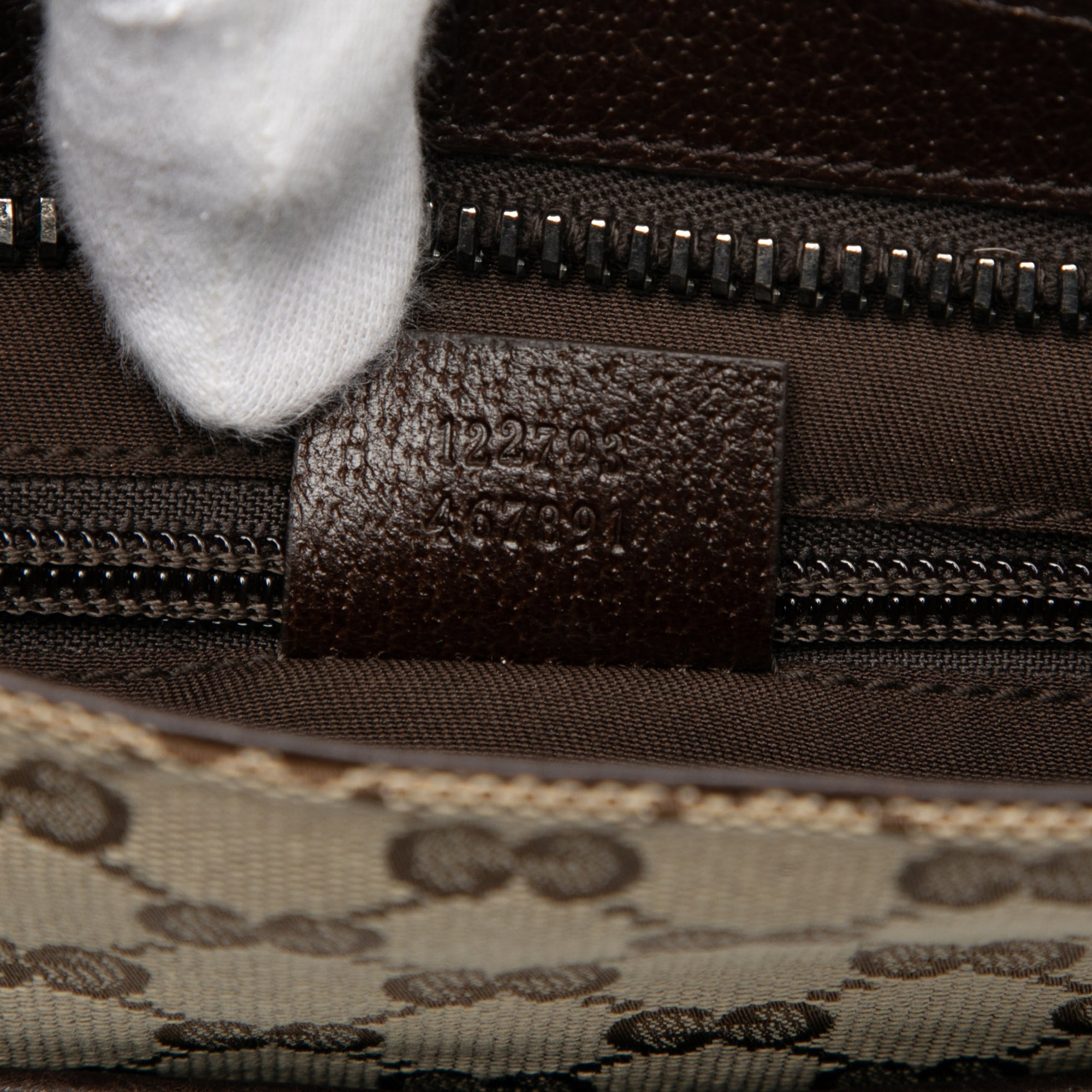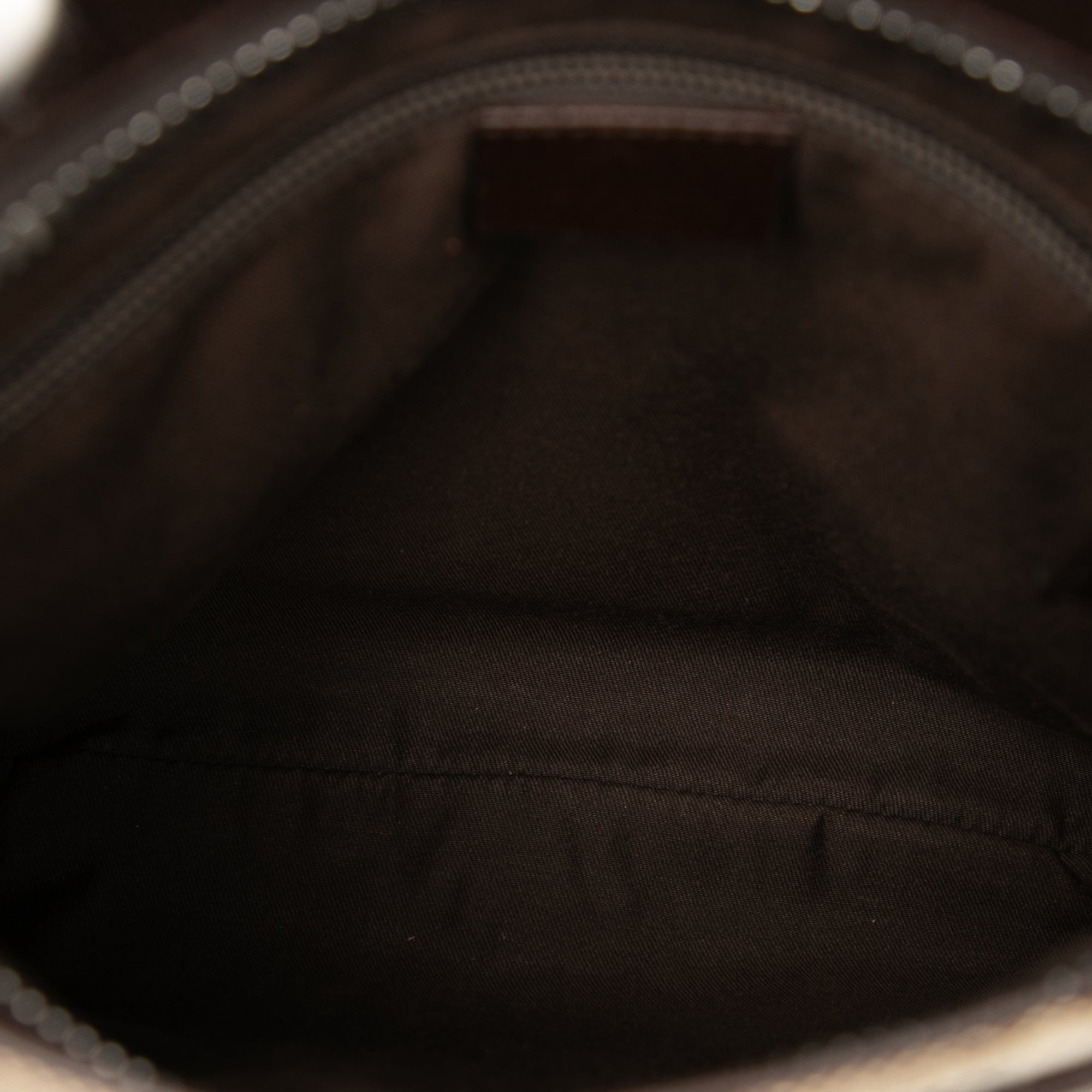 This crossbody bag features a canvas body with leather trim, a flat strap, a top zip closure, a front exterior slip pocket, and an interior zip pocket. Retail Price: 1150.00