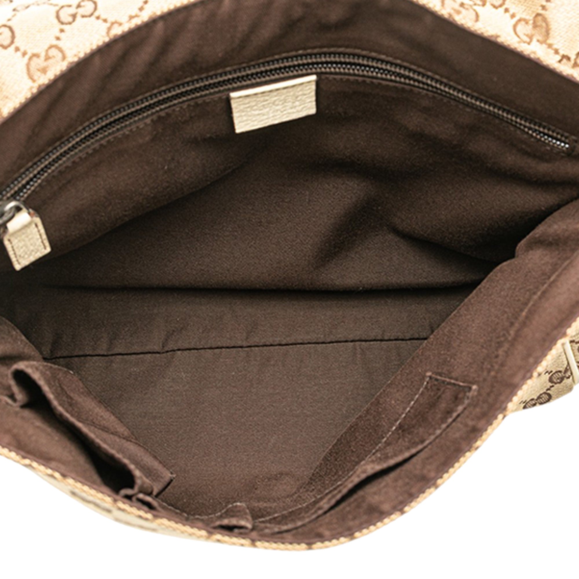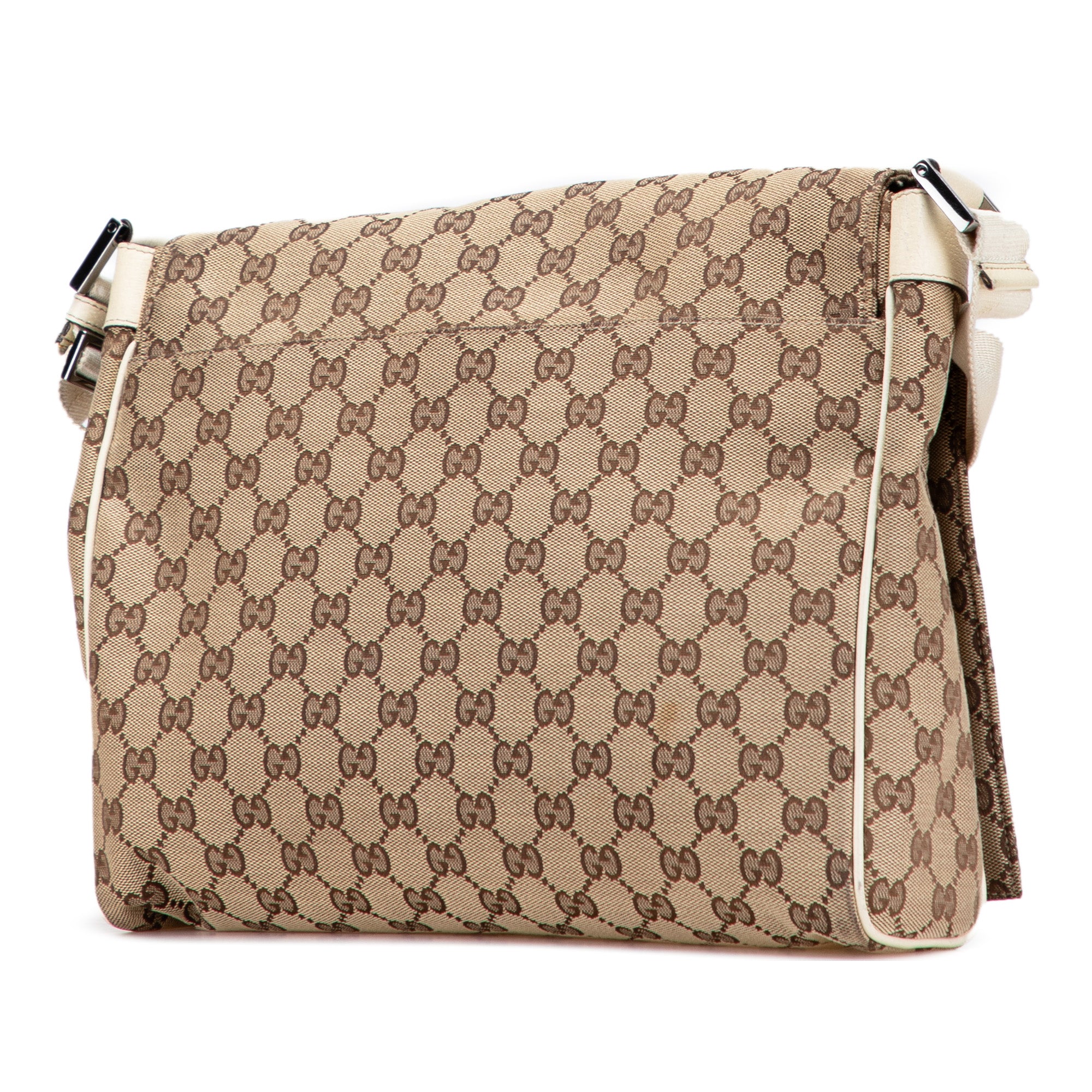 This crossbody bag features a canvas body with leather trim, an adjustable flat strap with leather shoulder guard, a top flap with magnetic snap button closure, an exterior slip pocket with touch fastener closure, and interior zip and slip pockets. Retail Price: 900.00