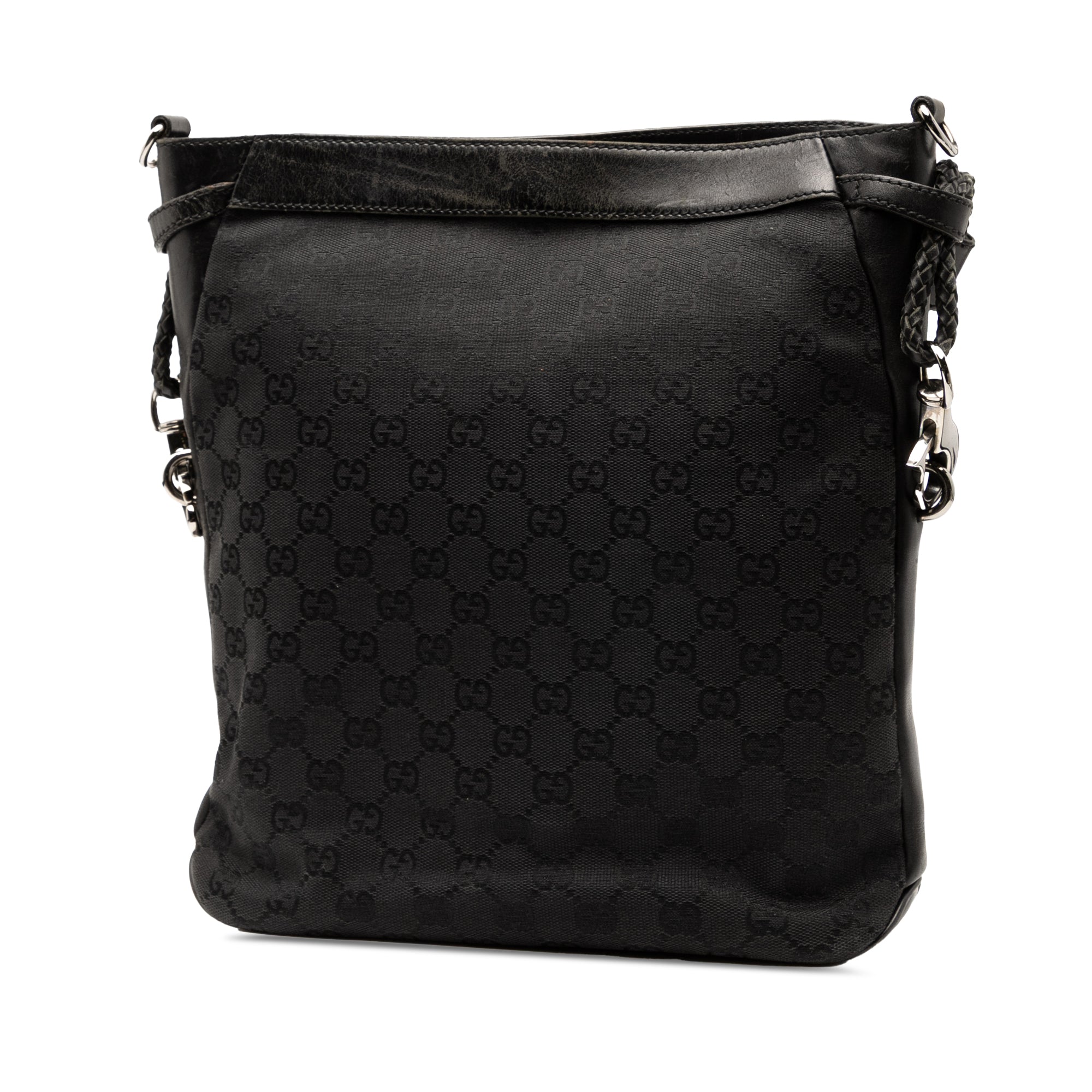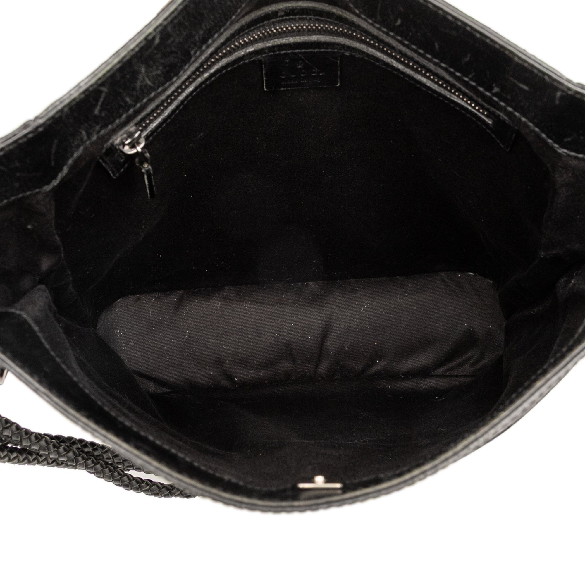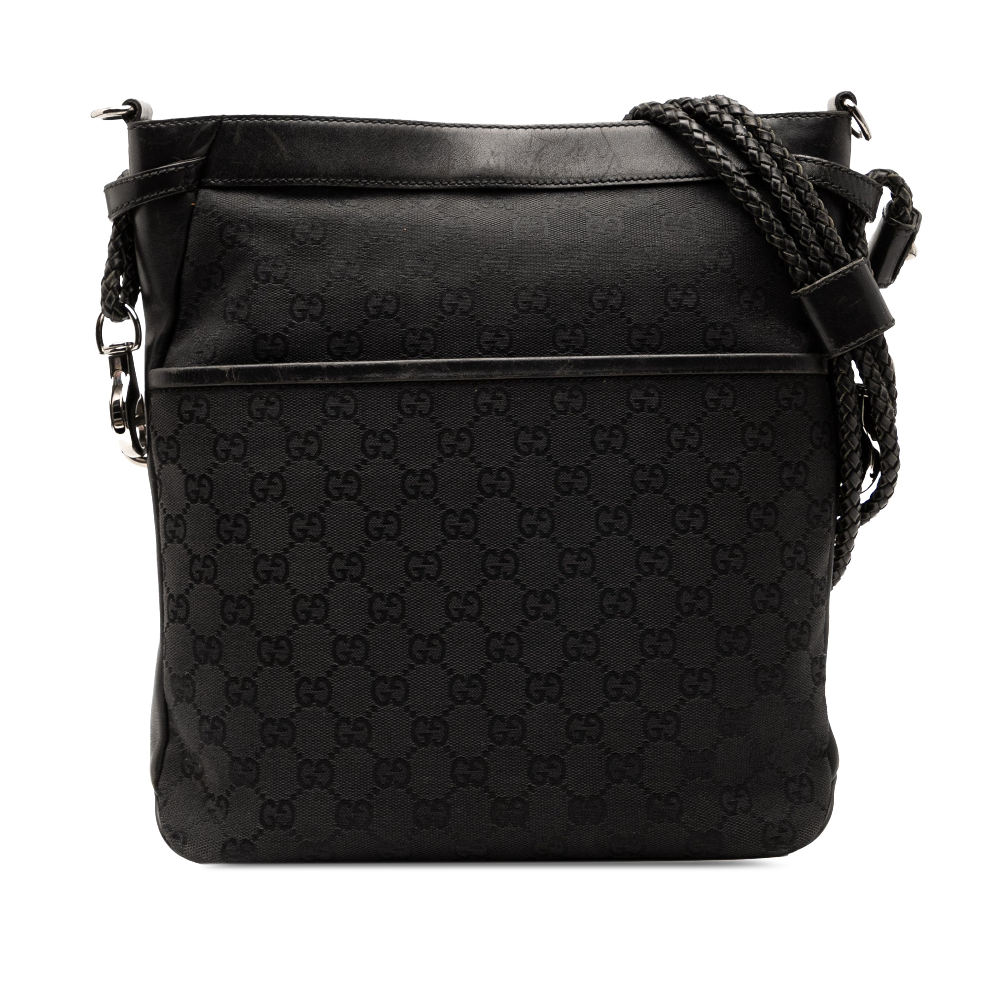 This crossbody bag features a canvas body with leather trim, a detachable braided strap, an open top with magnetic snap closure, an exterior front slip pocket, and an interior zip pocket. Retail Price: 990.00