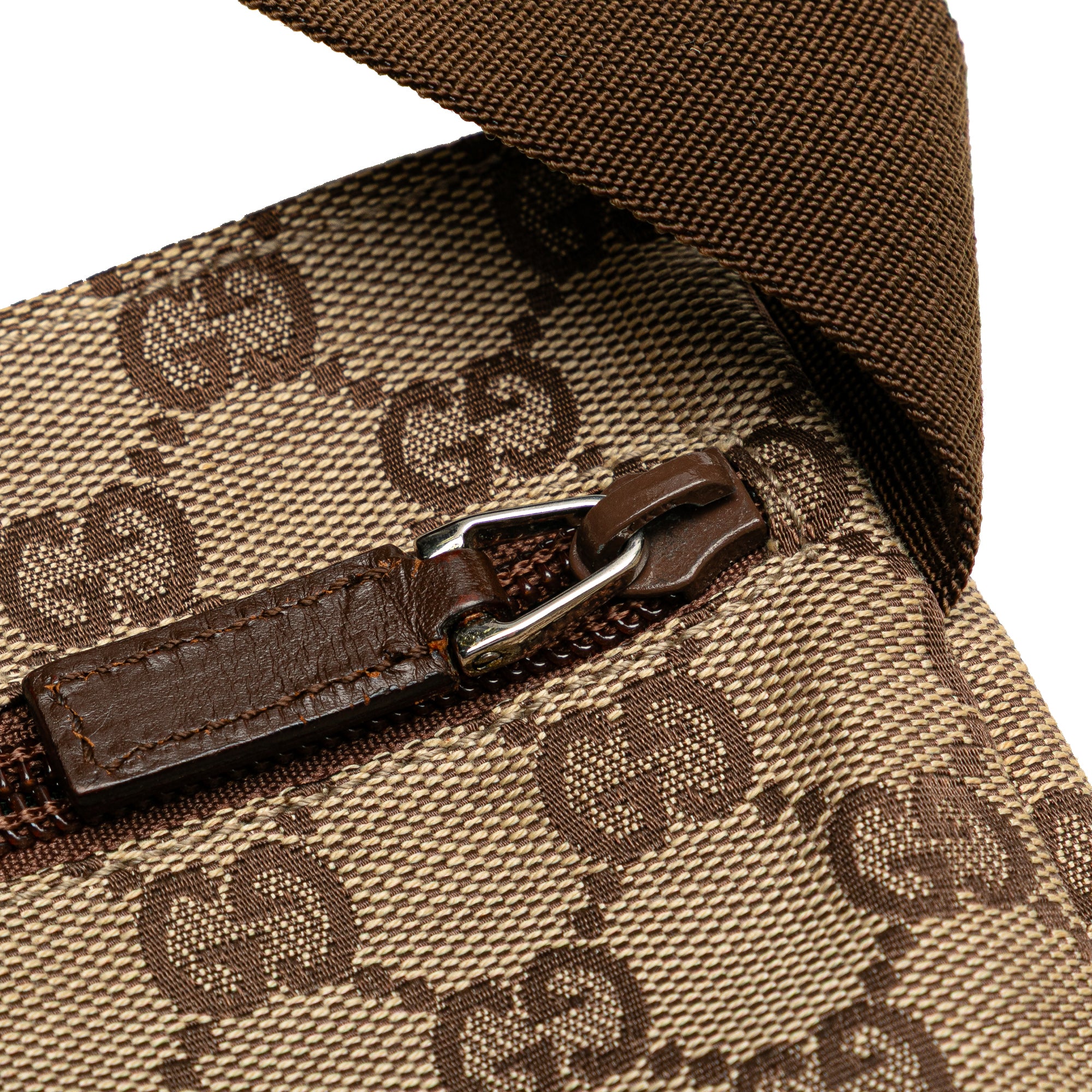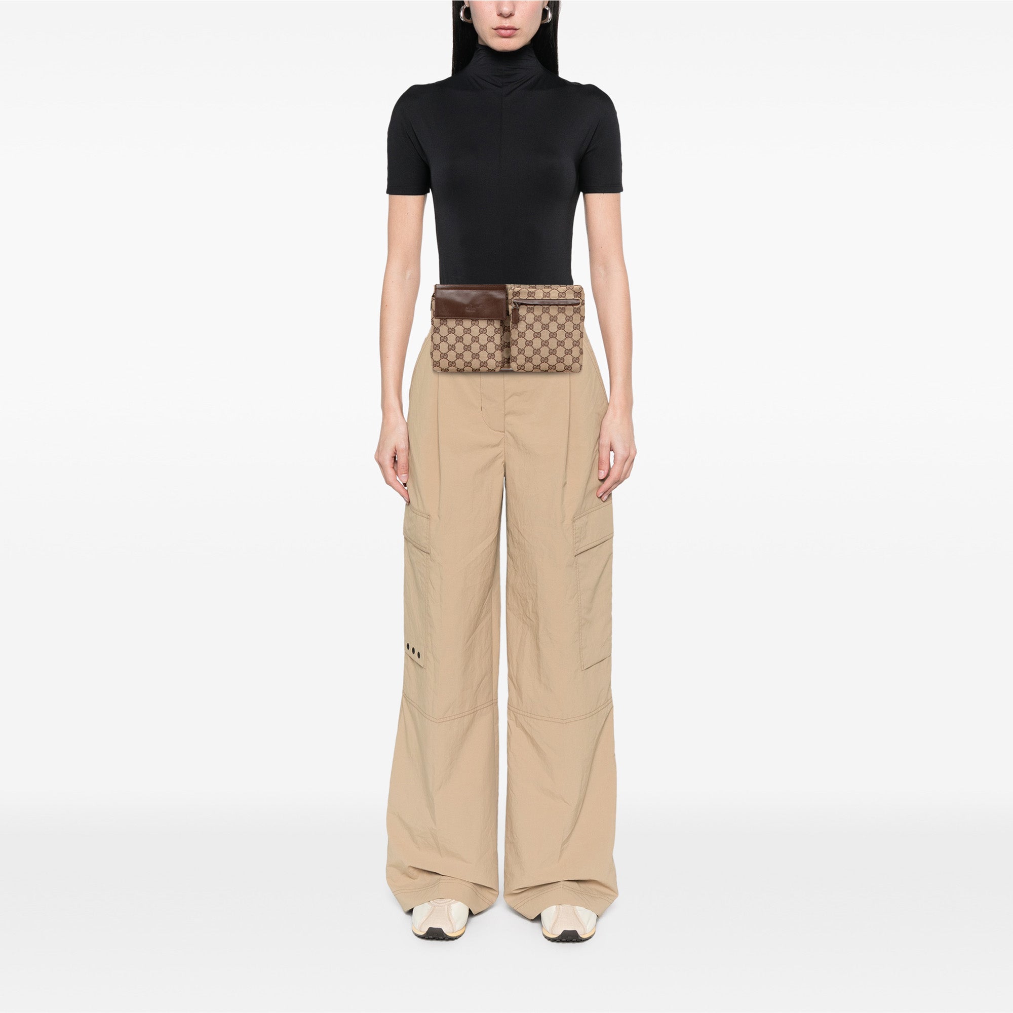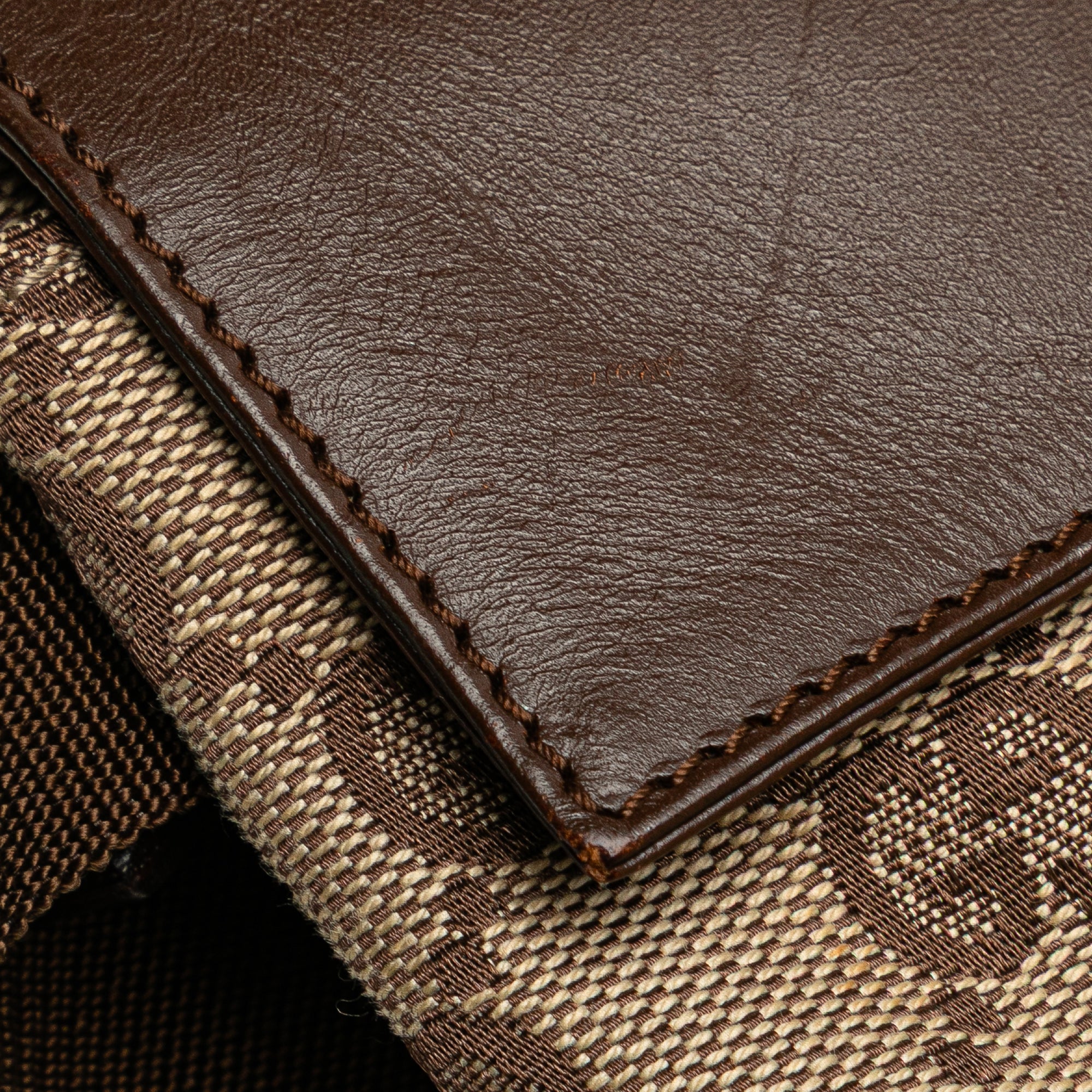 This belt bag features a canvas body with leather trim, an adjustable flat waist strap, exterior front flap and zip compartments, and an exterior back zip pocket. Retail Price: 1188.00