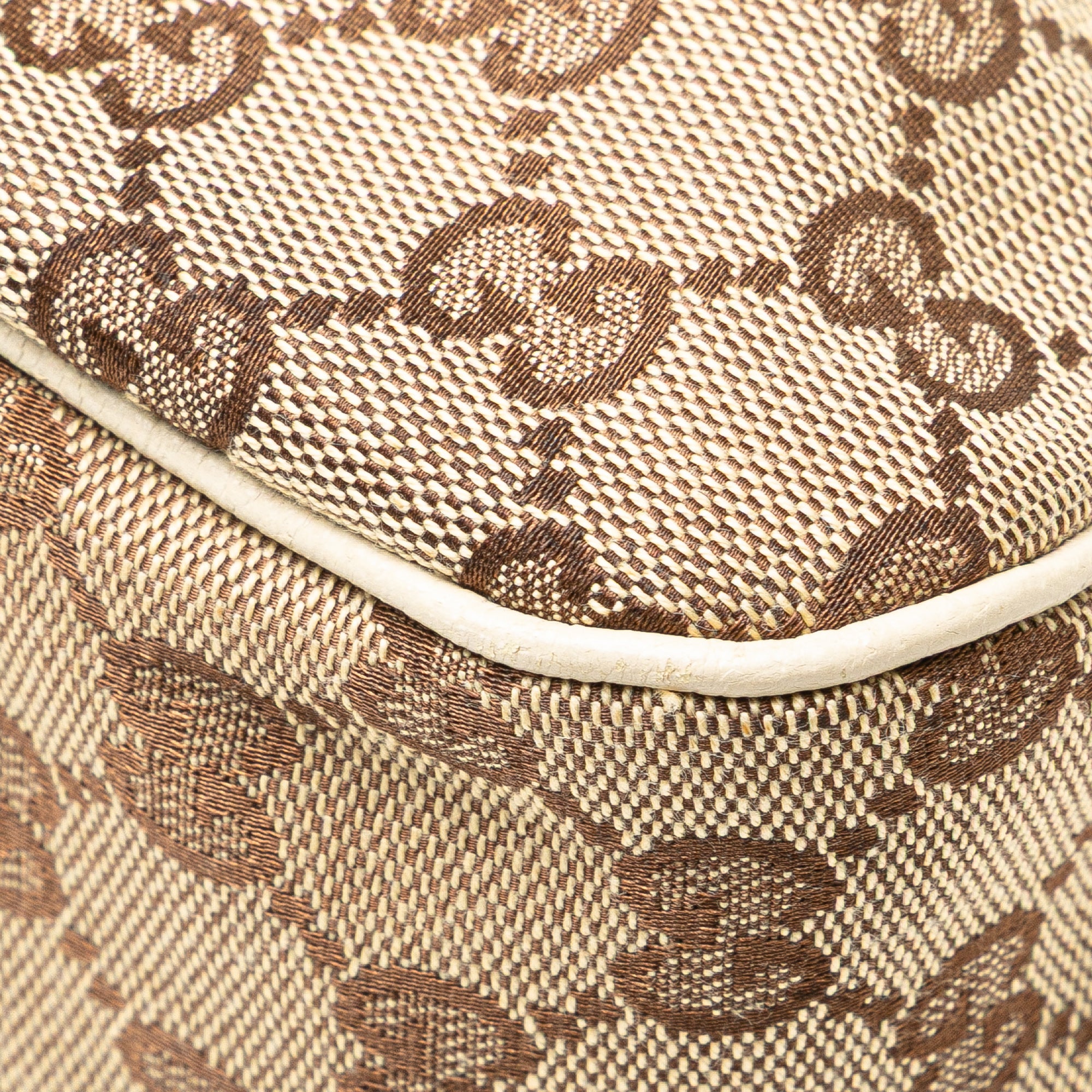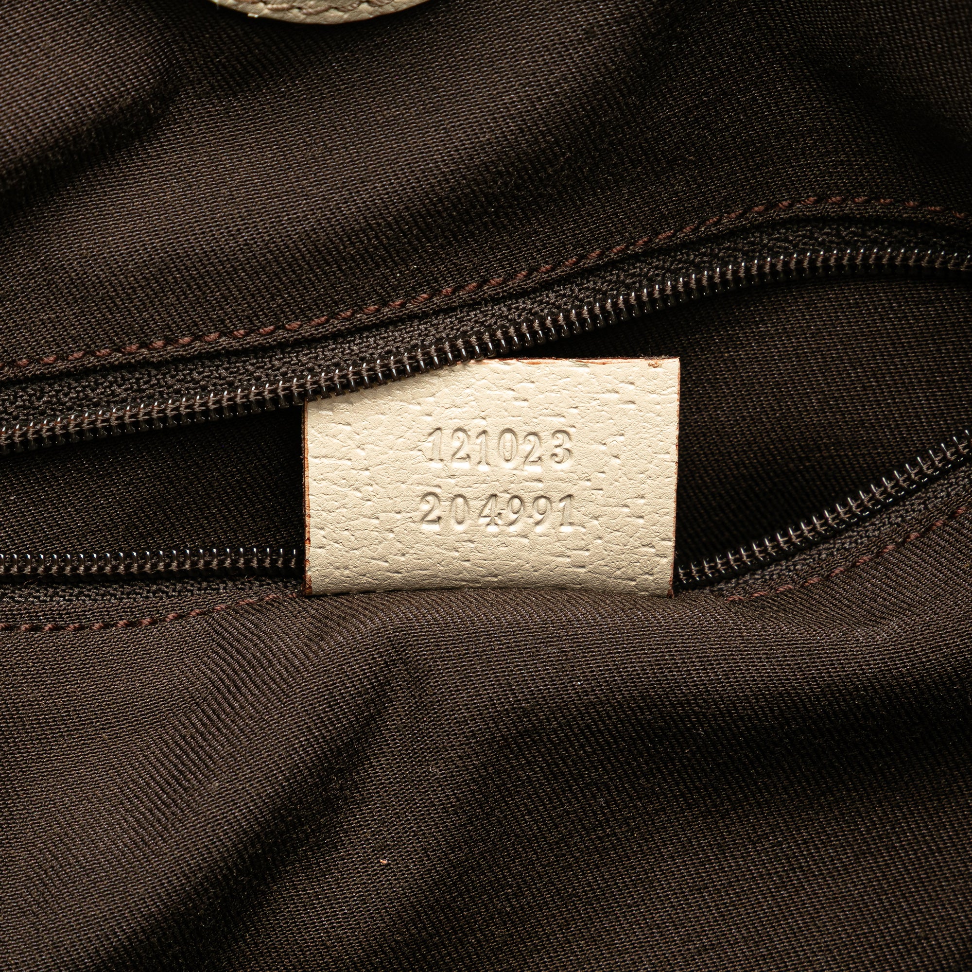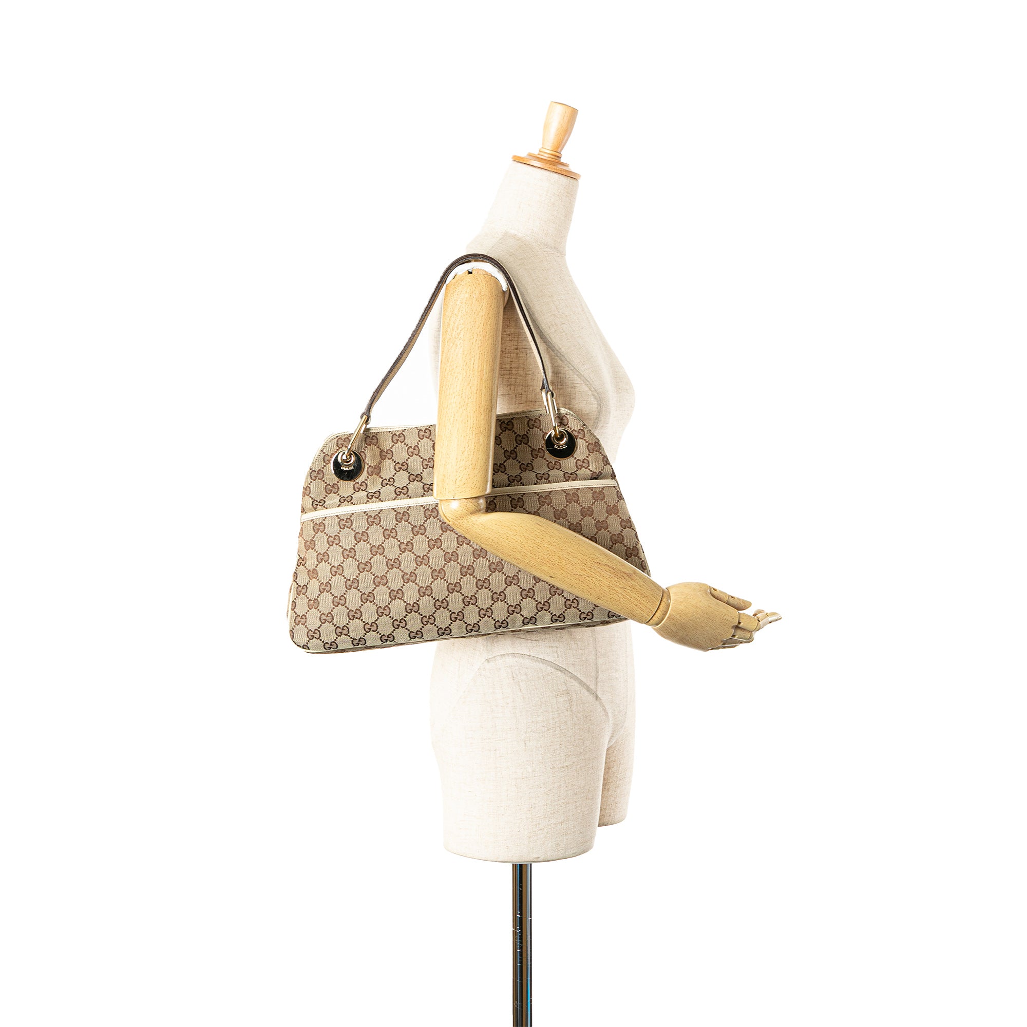 This shoulder bag features a canvas body with leather trim, flat leather straps, an open top with a magnetic closure, an exterior front slip pocket, and interior zip and slip pockets. Retail Price: 750.00