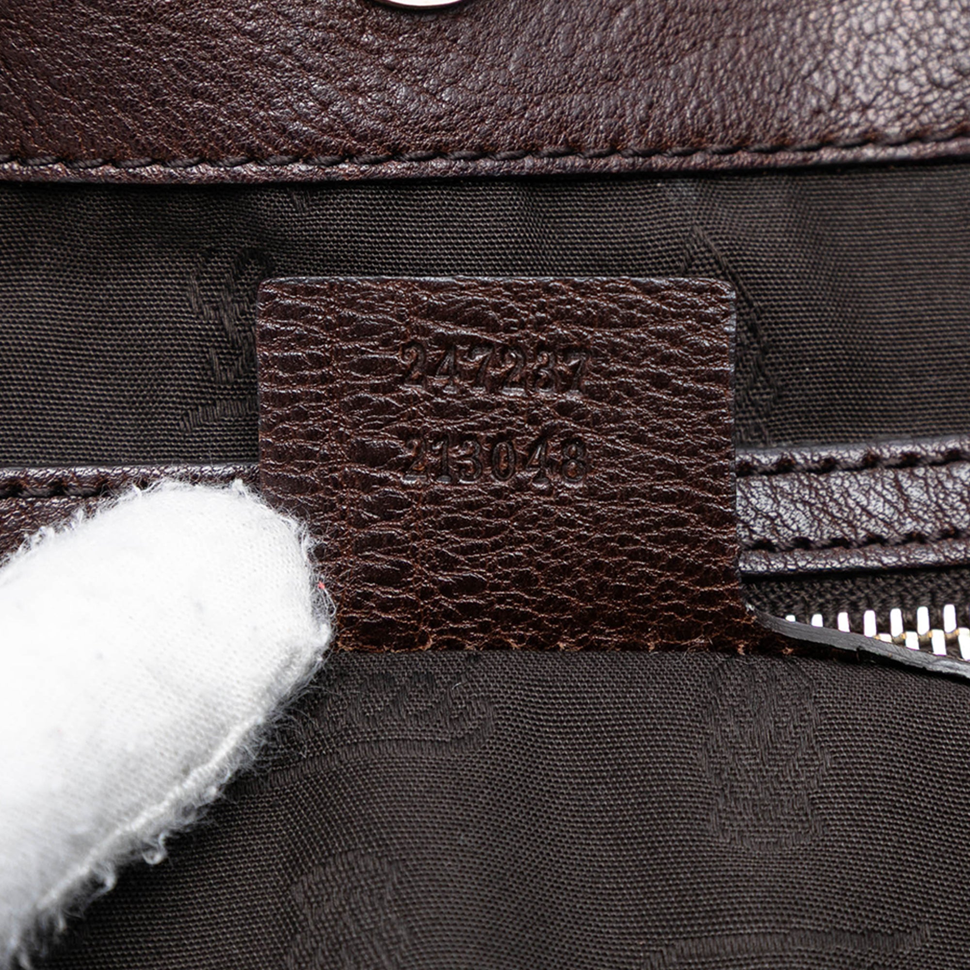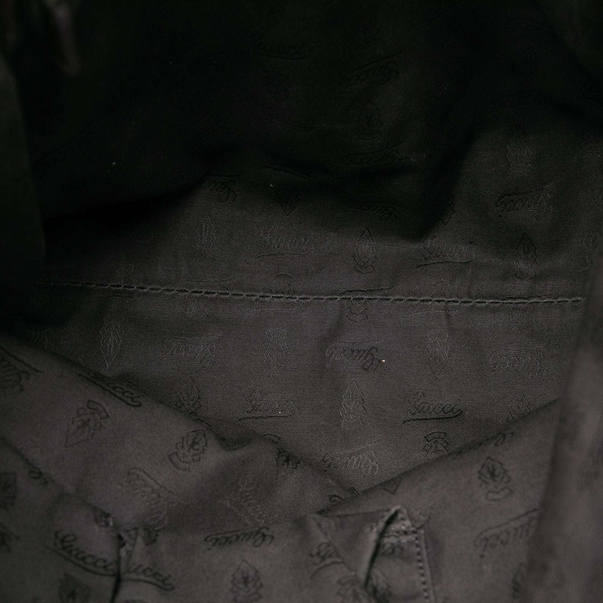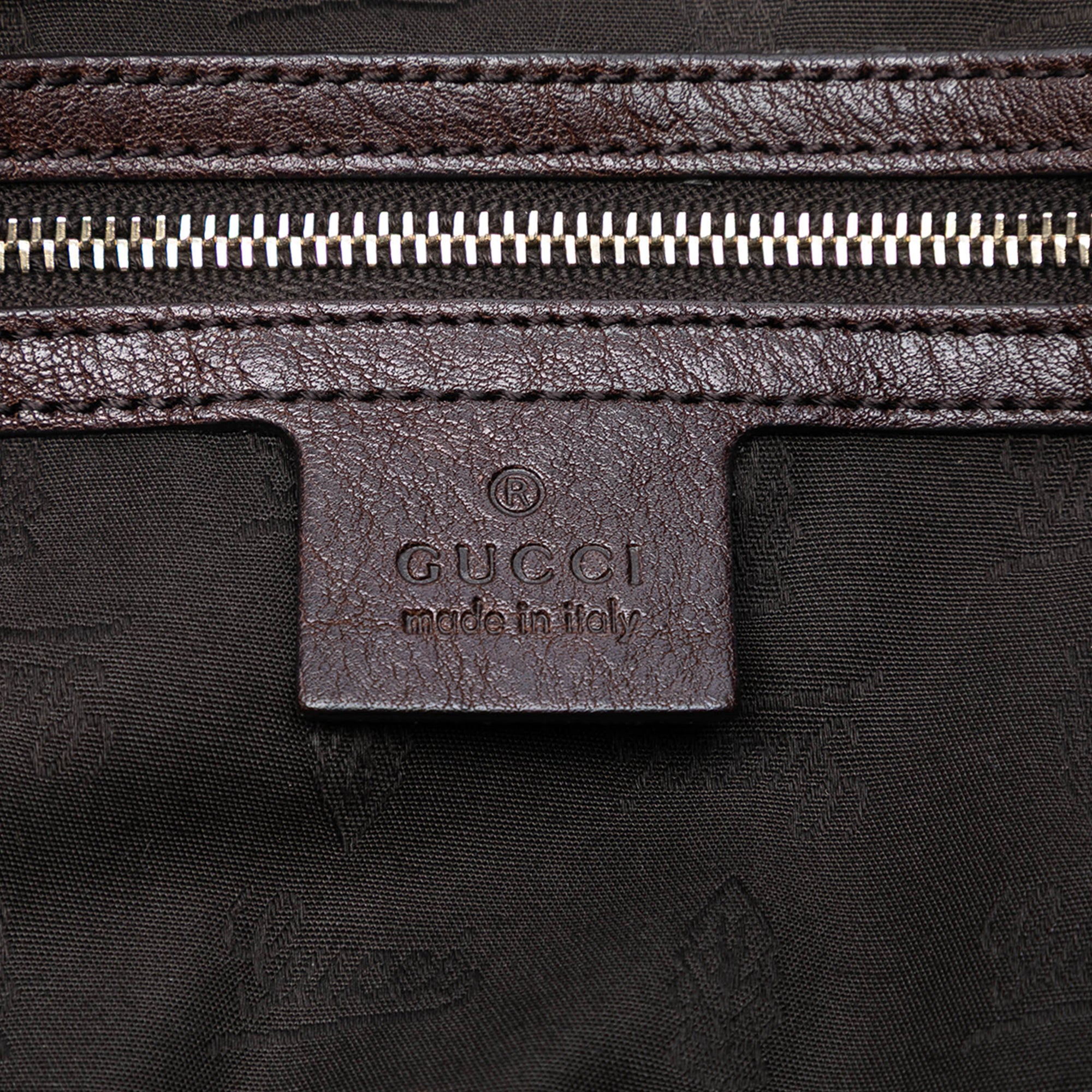 This tote bag features a canvas body with leather trim and a GG charm, flat leather handles, an open top with a magnetic snap closure, and interior zip and slip pockets. Retail Price: 1630.00