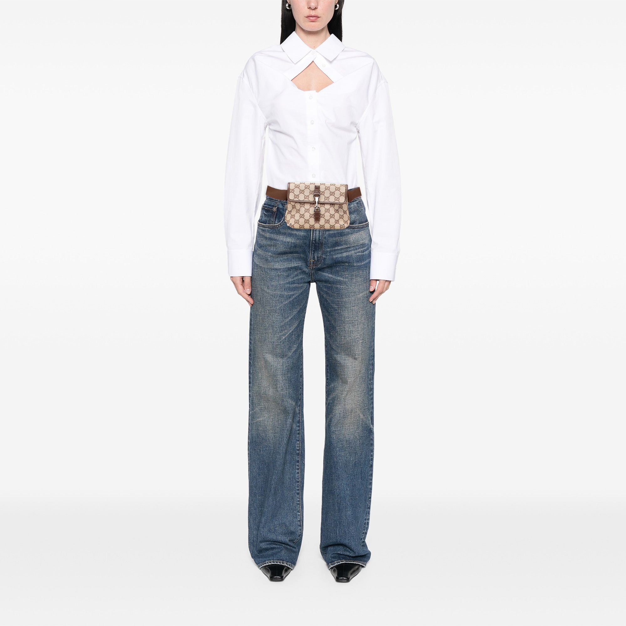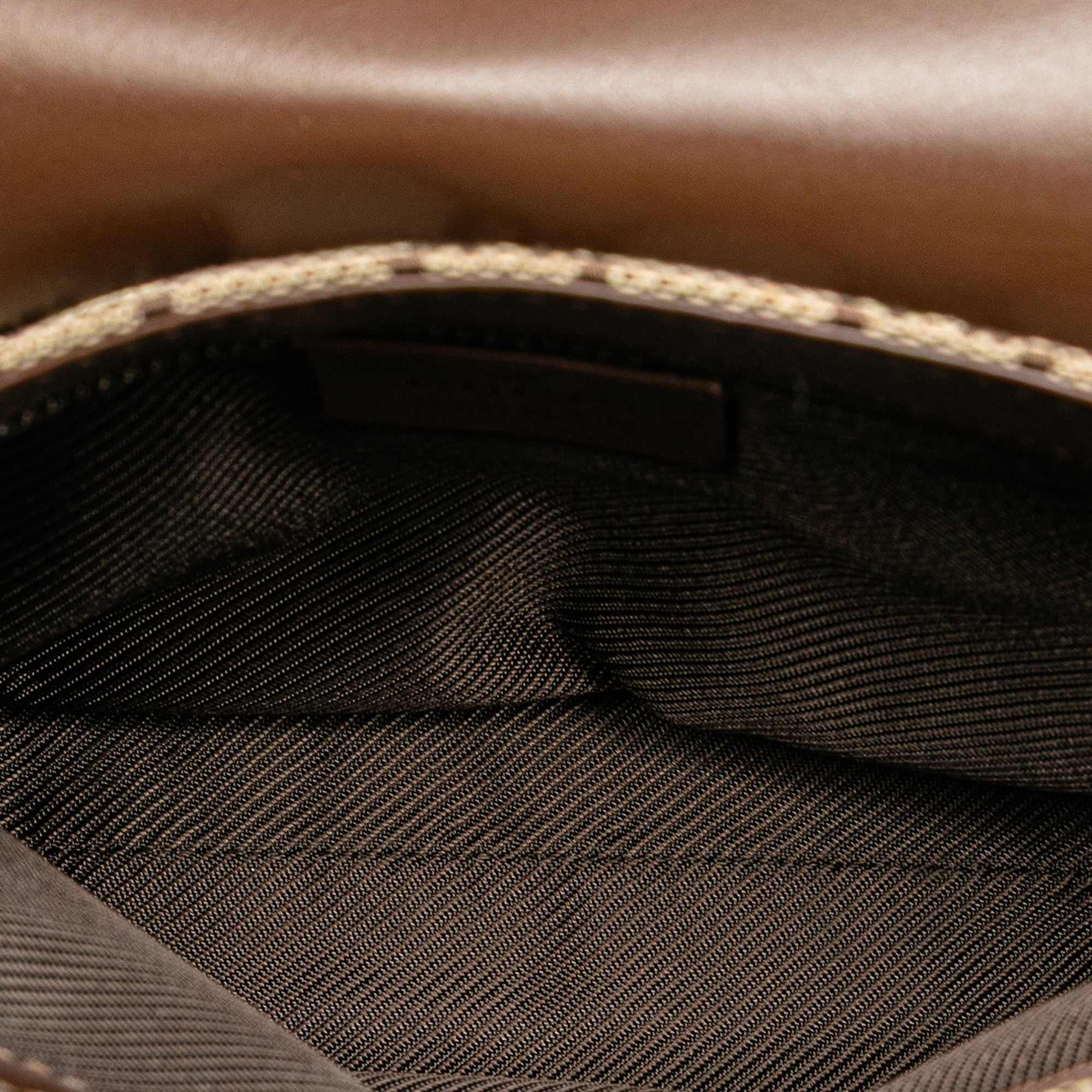 This belt bag features a canvas body with leather trim, an adjustable flat waist strap, a front flap with a lobster clasp closure, and an interior zip pocket. Retail Price: 590.00