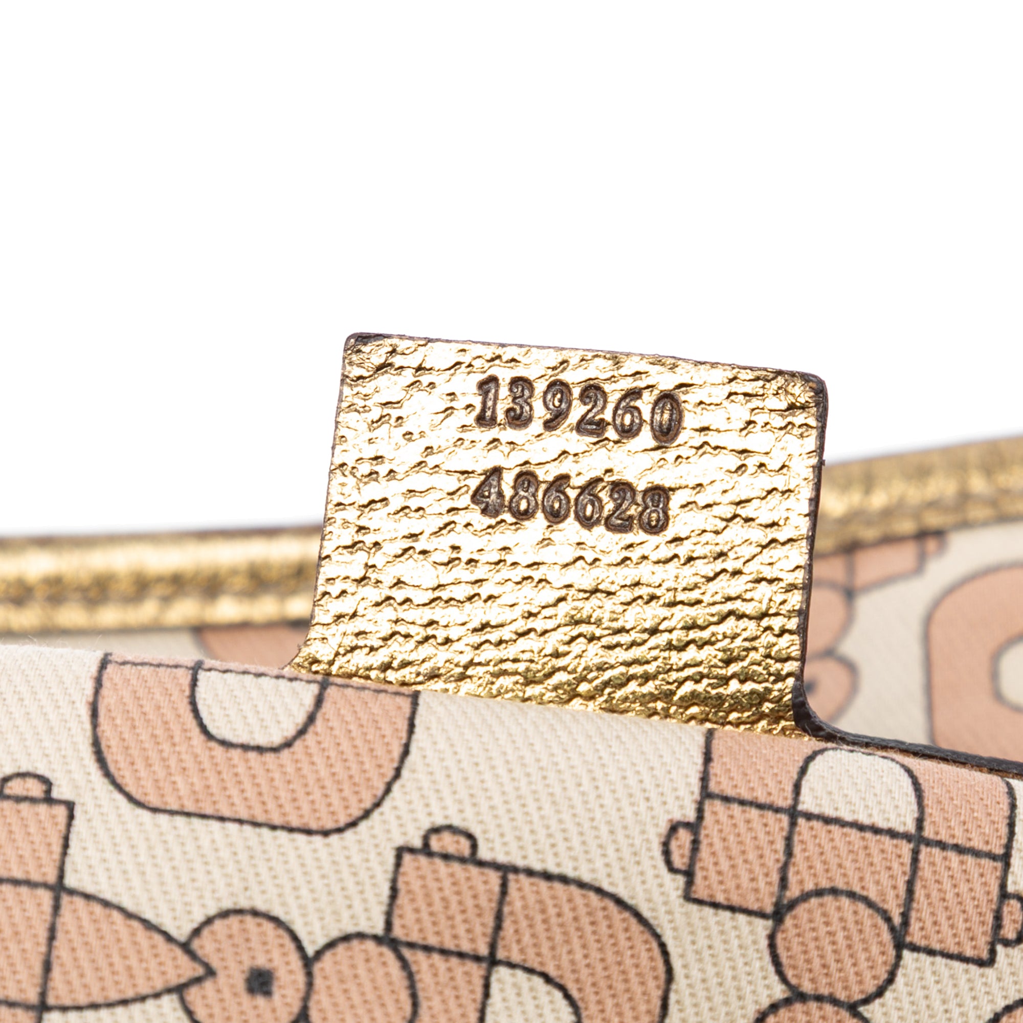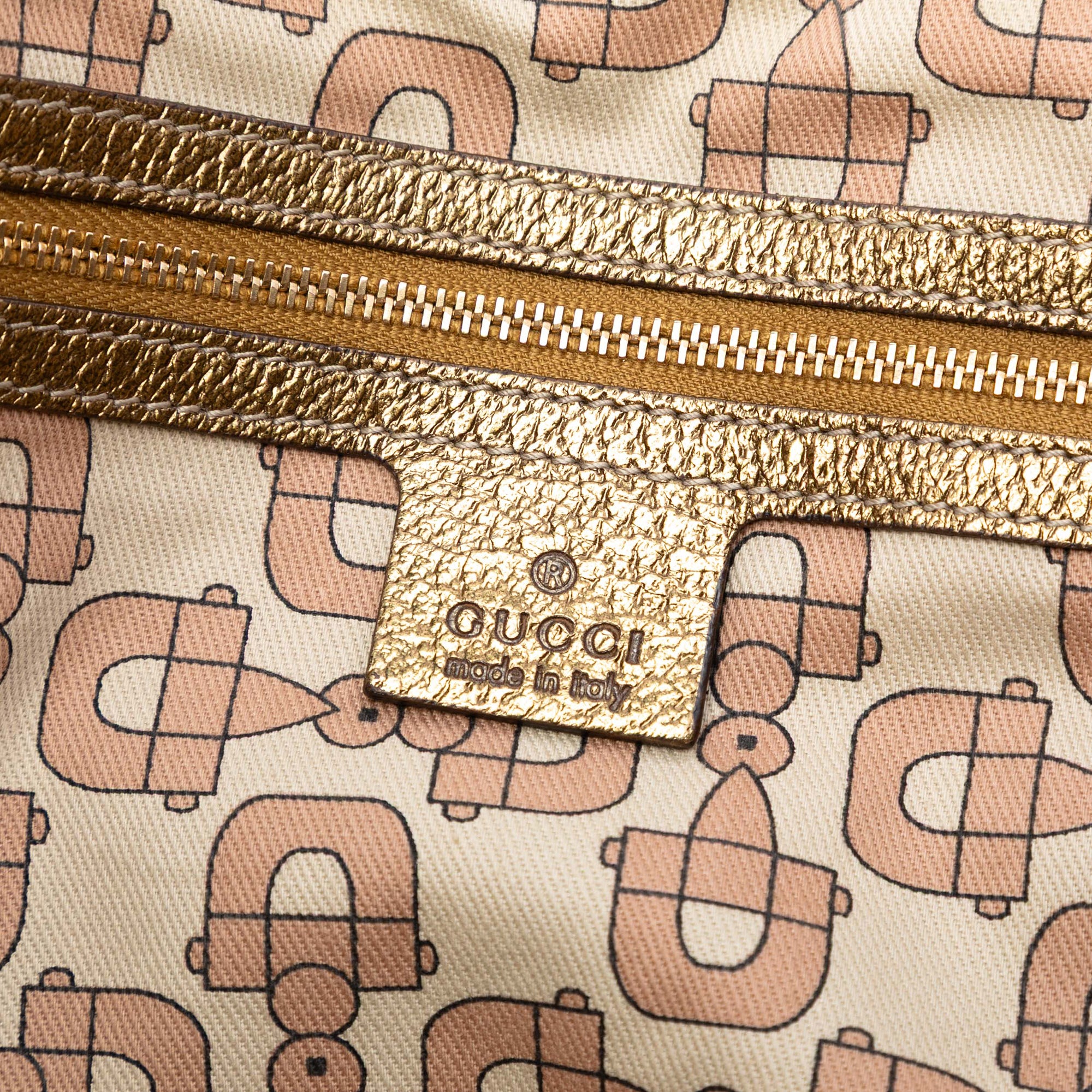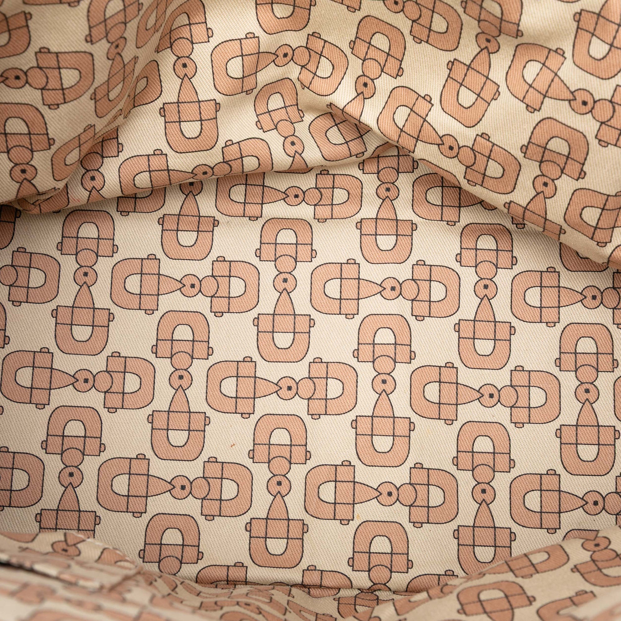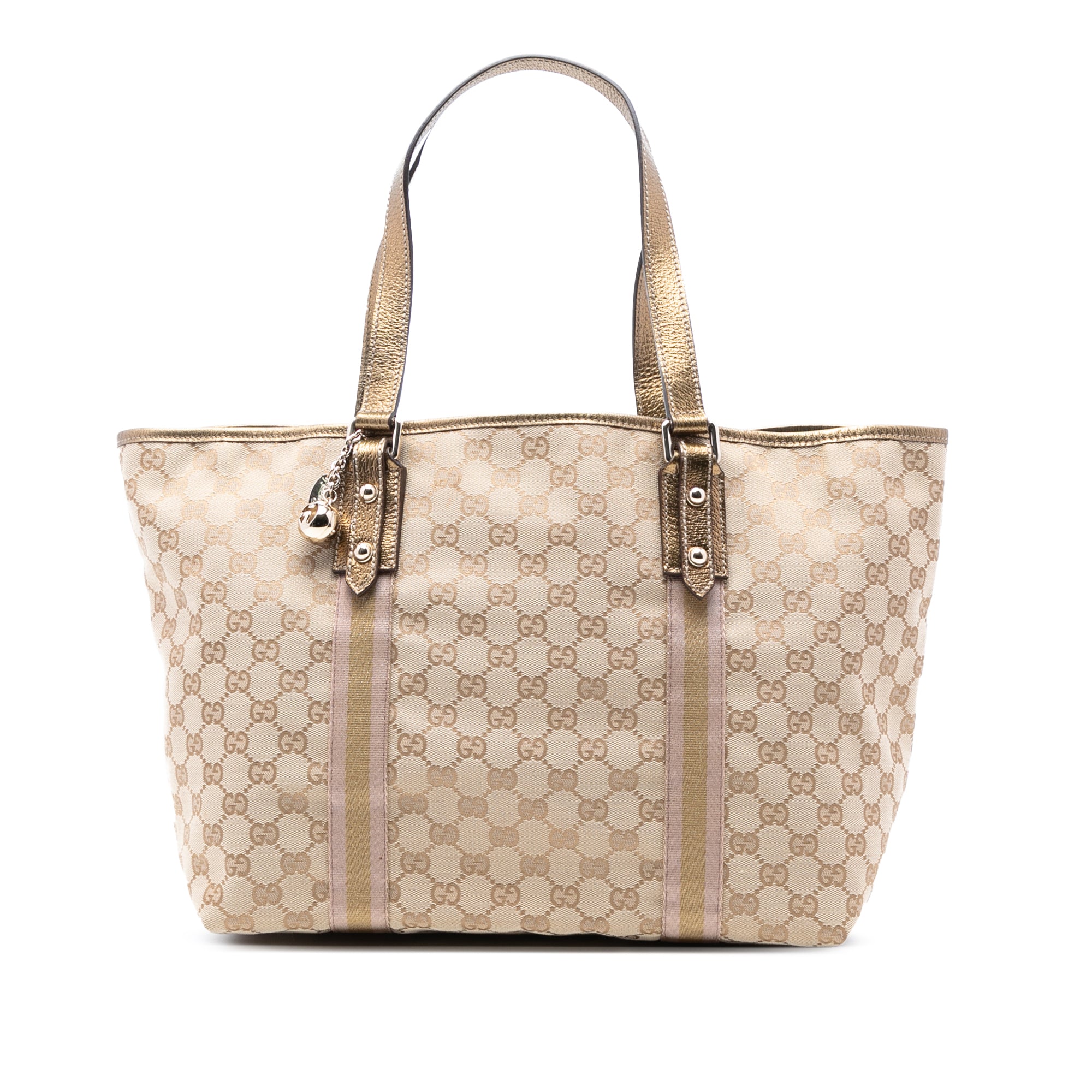 This tote bag features a canvas body with metallic leather trim, flat leather straps, an open top, and interior zip and slip pockets. Retail Price: 750.00