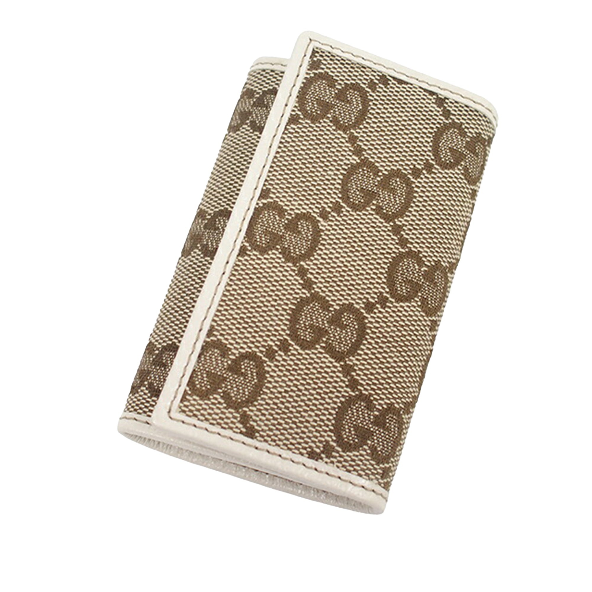 This key holder features a canvas body with leather trim, a front flap with snap closure, and metal key holders. Inclusion: box. Retail Price: 300.00