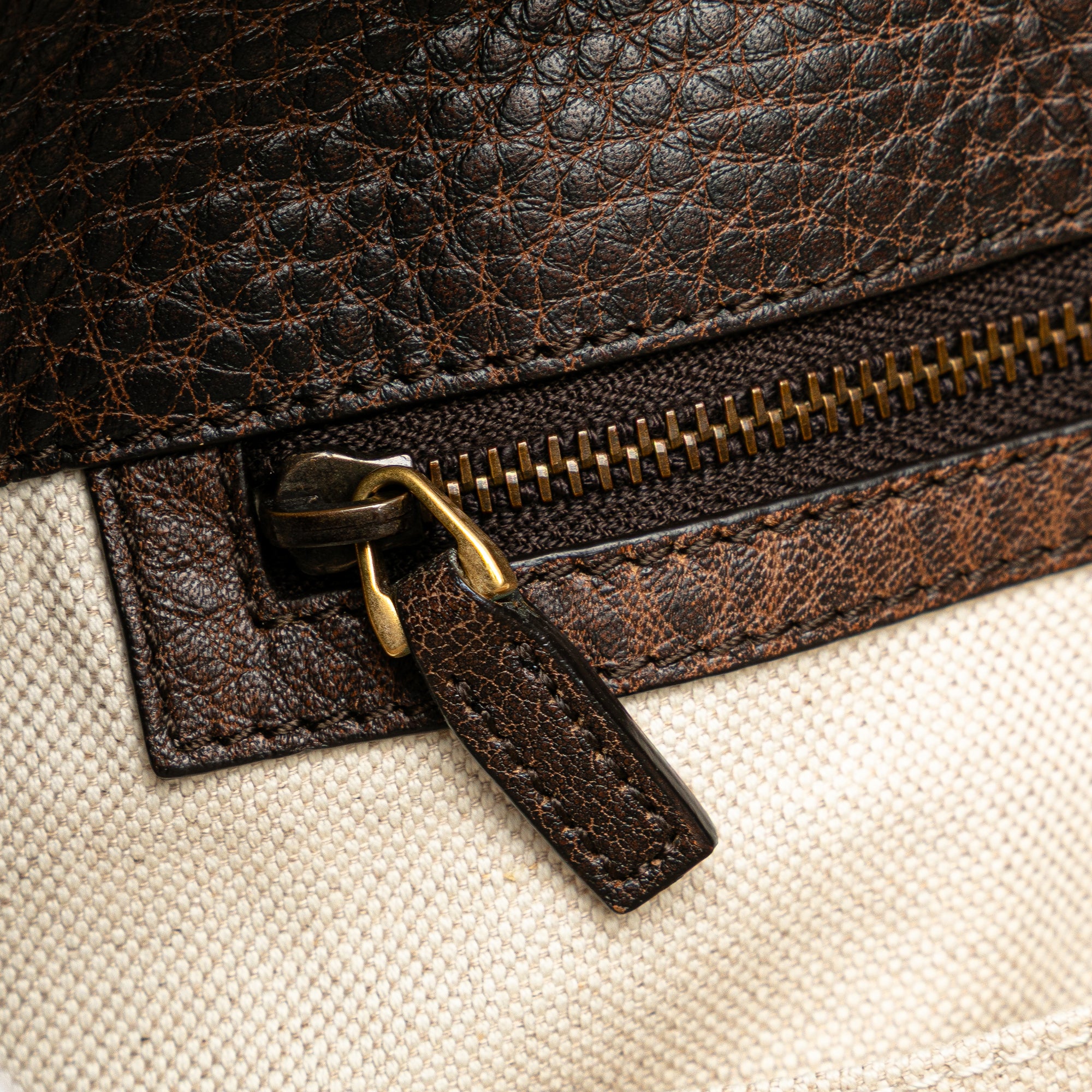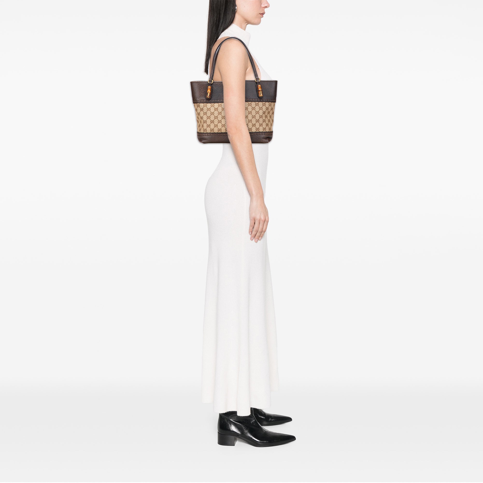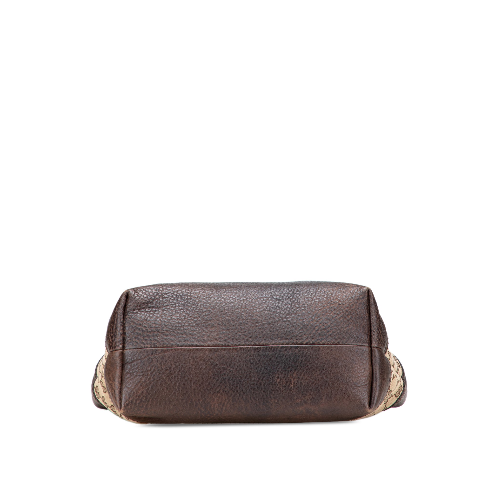The Crafty tote bag features a canvas body with leather trim, flat leather straps, an open top with magnetic snap button closure, and interior zip and slip pockets. Inclusion: Dust bag. Retail Price: 750.00