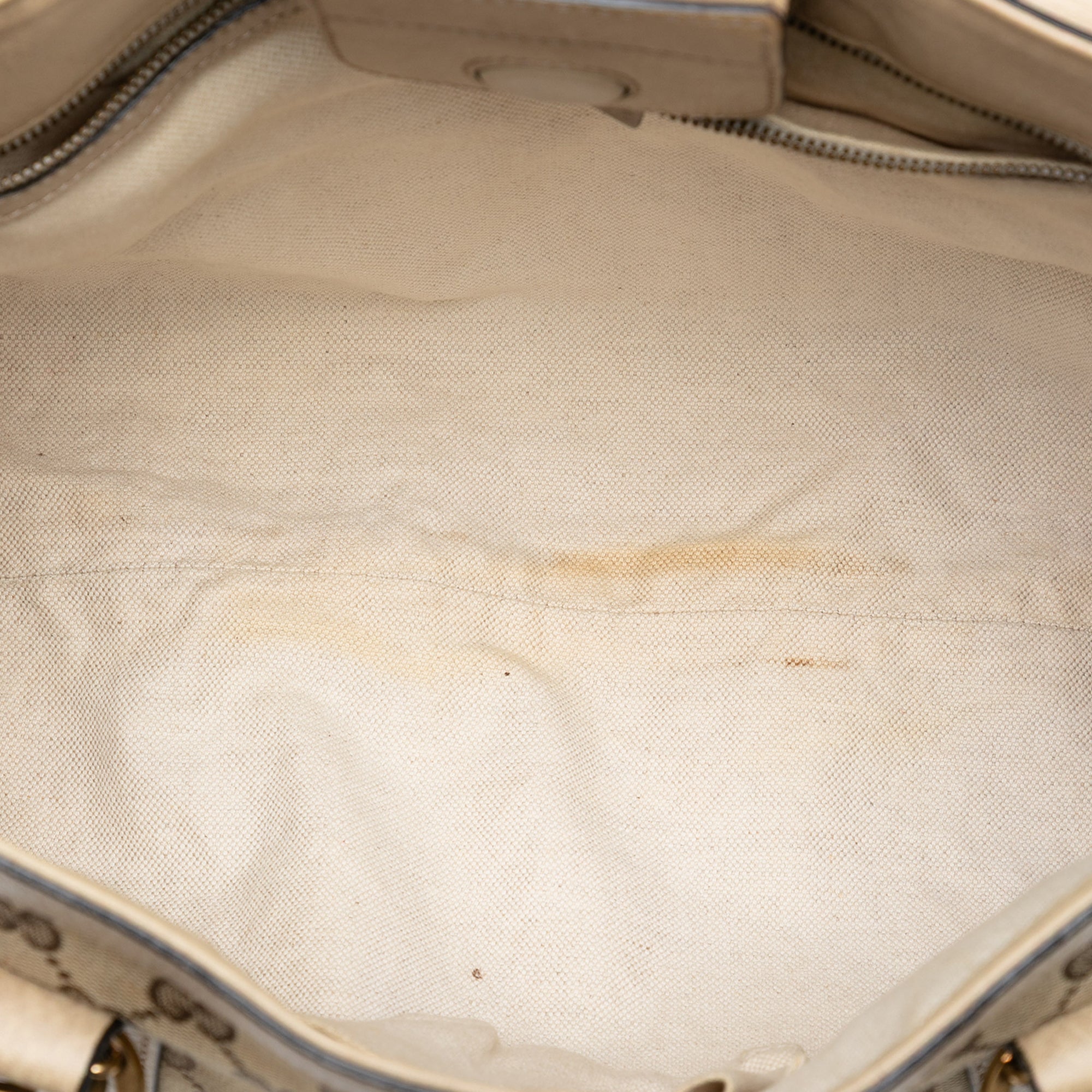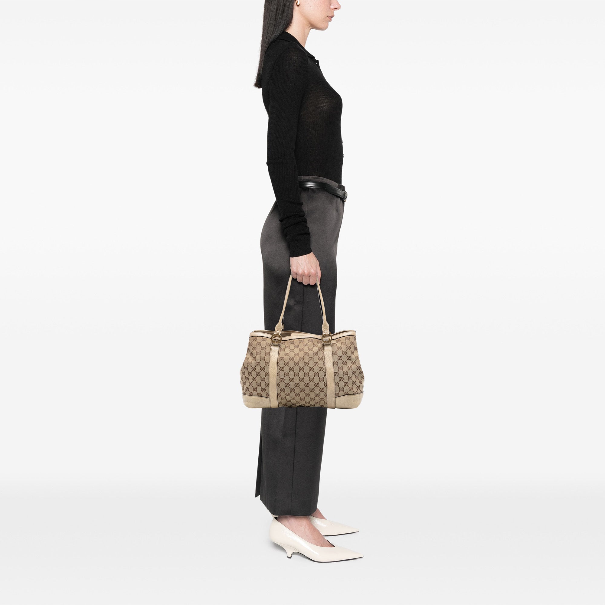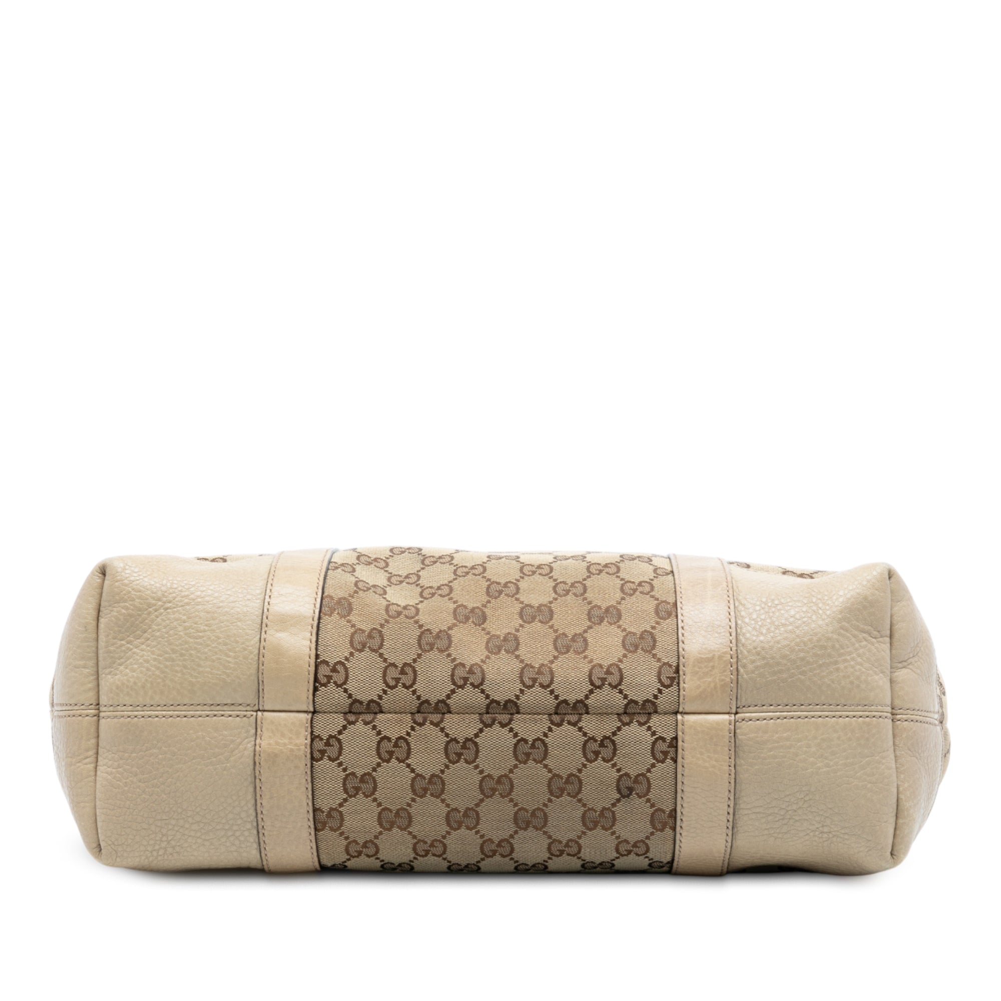 This tote bag features a canvas body with leather trim, rolled leather handles, an open top with magnetic snap closure, and interior zip and slip pockets. Inclusion: Dust bag. Retail Price: 1110.00
