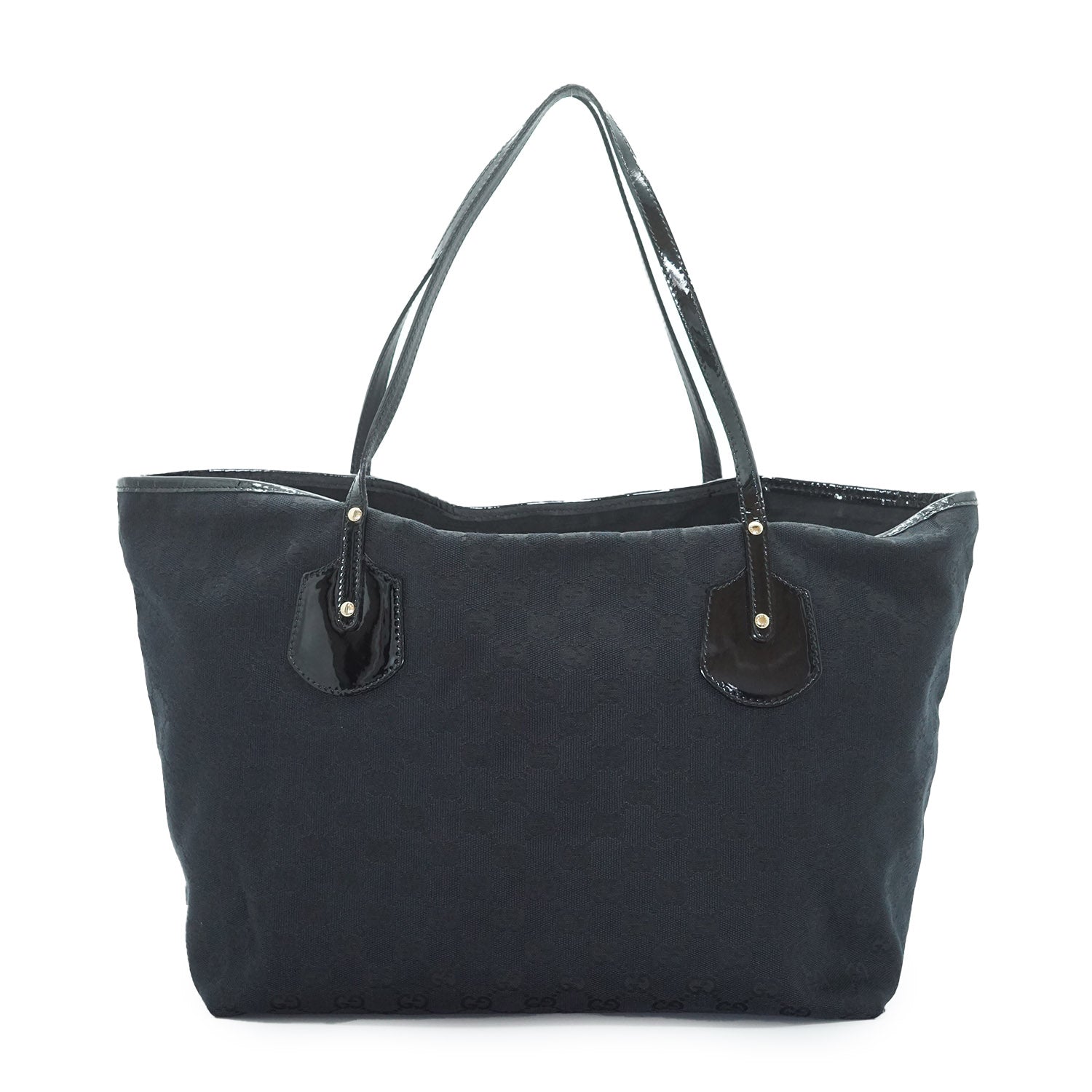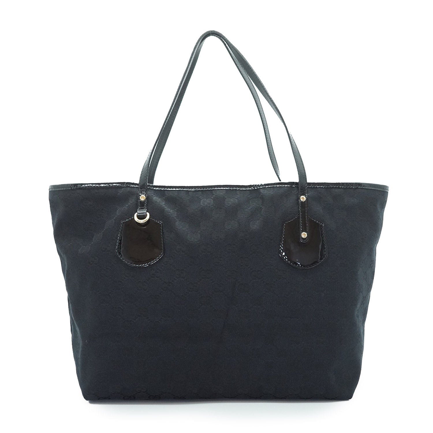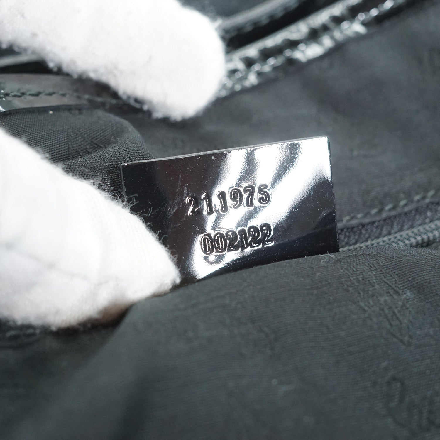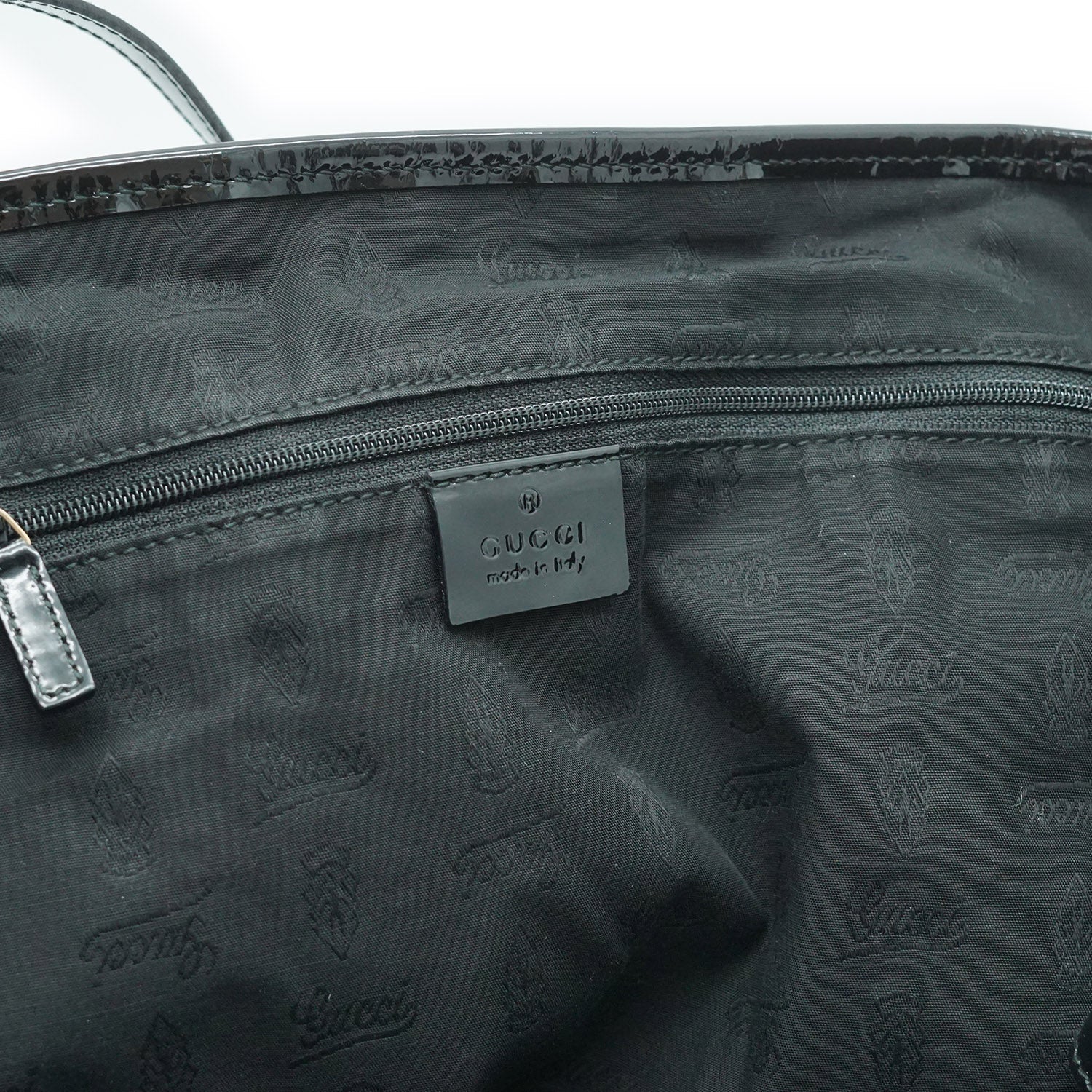 GG Canvas Patent Leather Tote Black Enamel leather, CanvasDepth: 16cmHeight: 26cmWidth: 32cmWidth at Top: 46cmHand Drop: 20cmOutside Rank: BInside Rank: BScratch: Minor corner rubPeeling: Minor cracking and peeling on the enamel leather top handlesSticky: Slightly sticky feel on the top handlesSerial code: 211975 002122