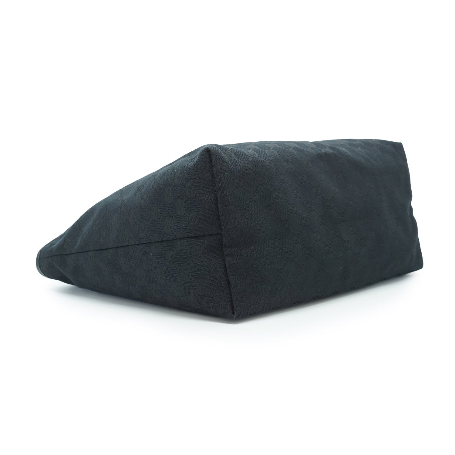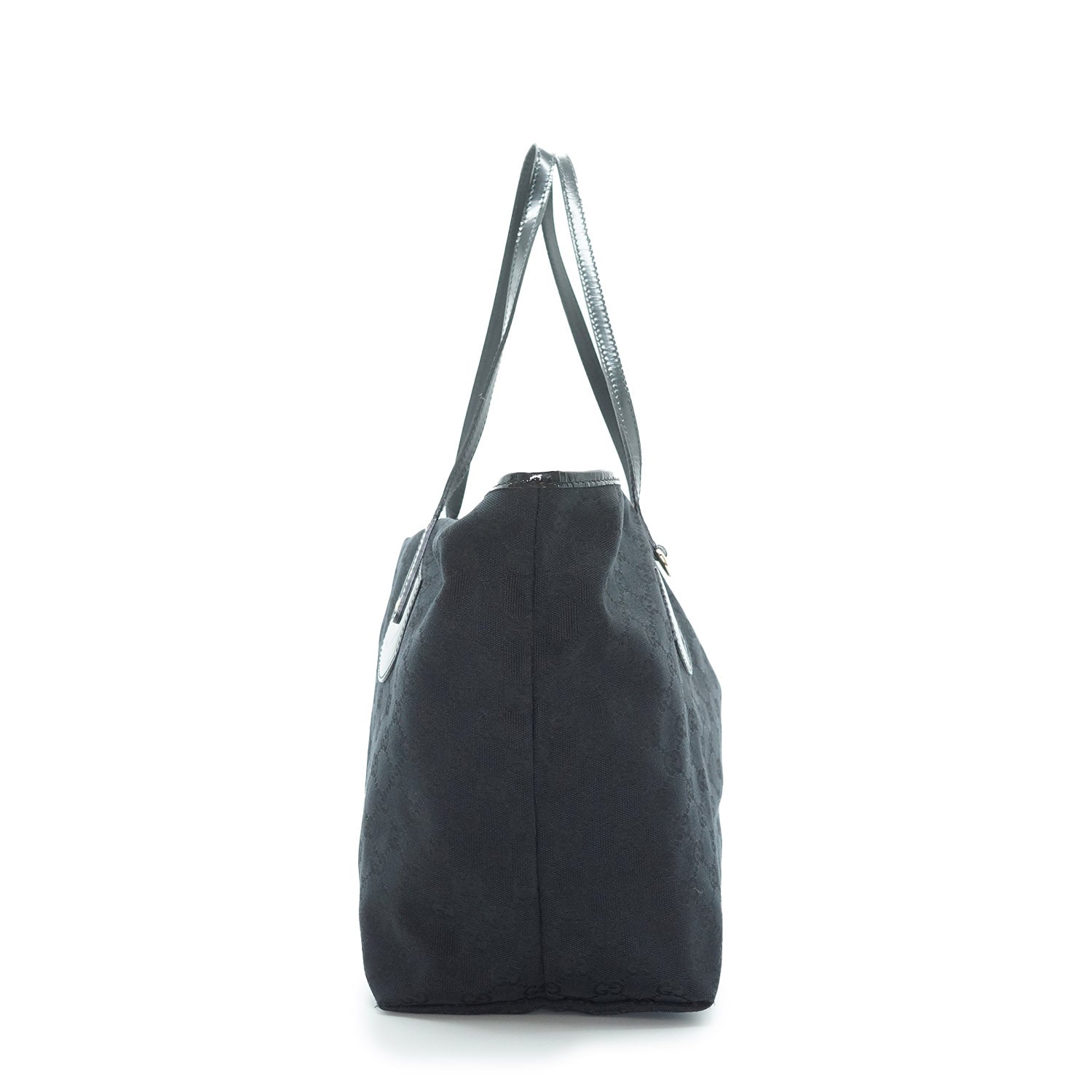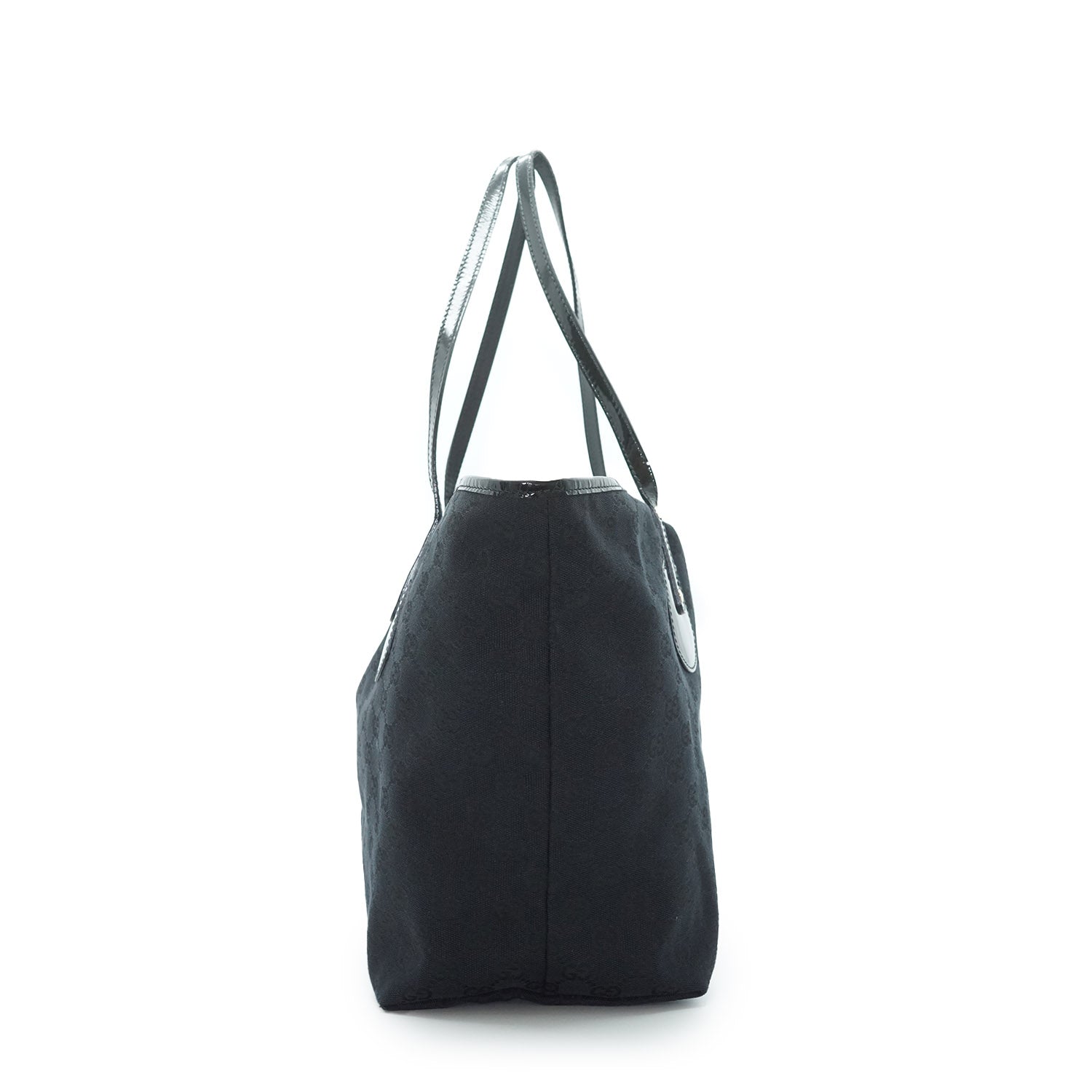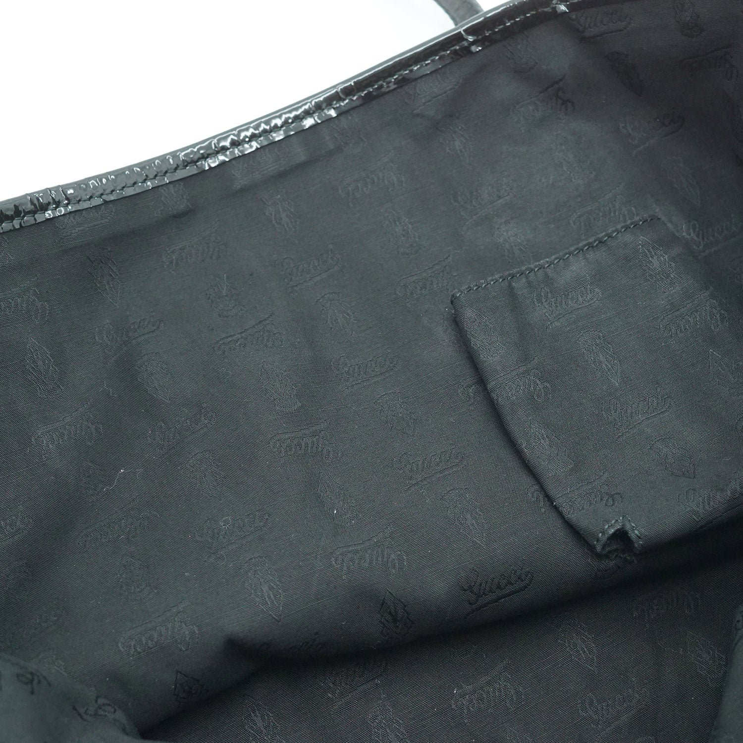 GG Canvas Patent Leather Tote Black Enamel leather, CanvasDepth: 16cmHeight: 26cmWidth: 32cmWidth at Top: 46cmHand Drop: 20cmOutside Rank: BInside Rank: BScratch: Minor corner rubPeeling: Minor cracking and peeling on the enamel leather top handlesSticky: Slightly sticky feel on the top handlesSerial code: 211975 002122