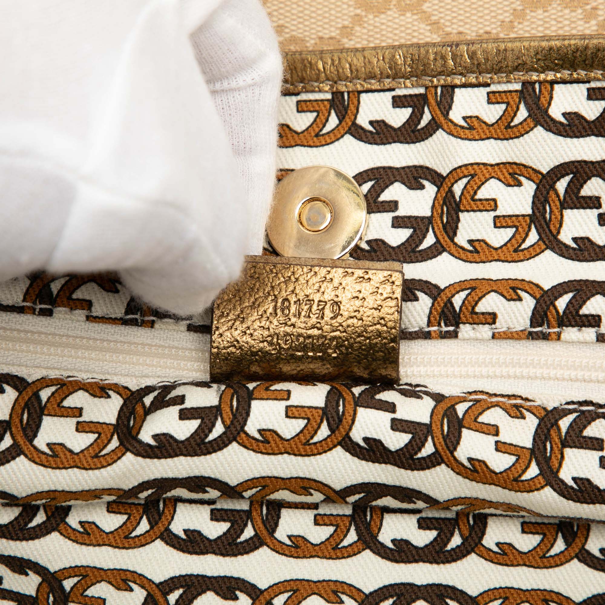 This tote bag features a canvas body with leather trim, rolled leather handles, an open top with magnetic snap closure, and interior zip and slip pockets. Retail Price: 725.00