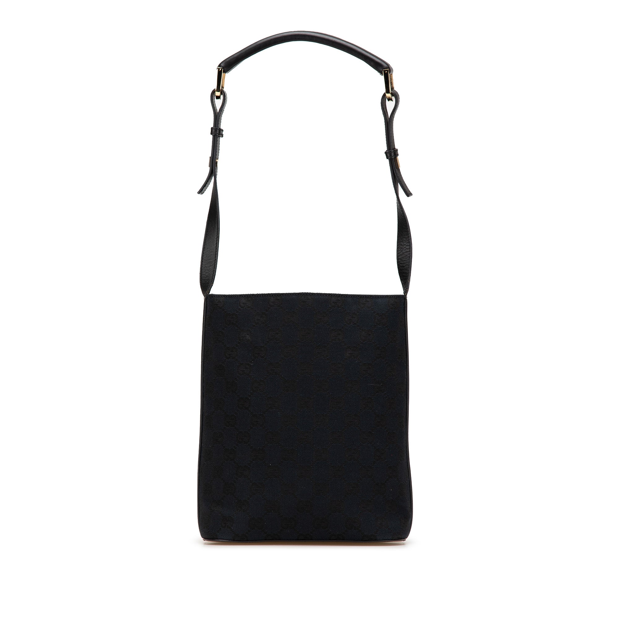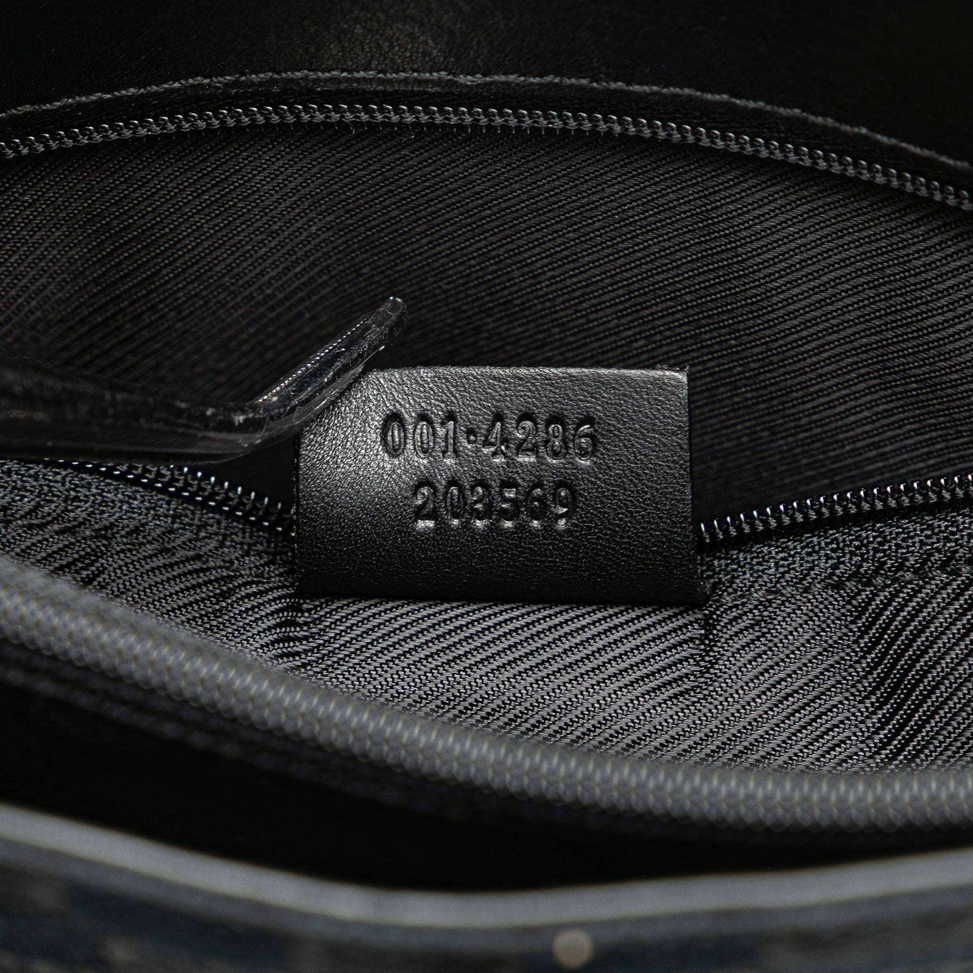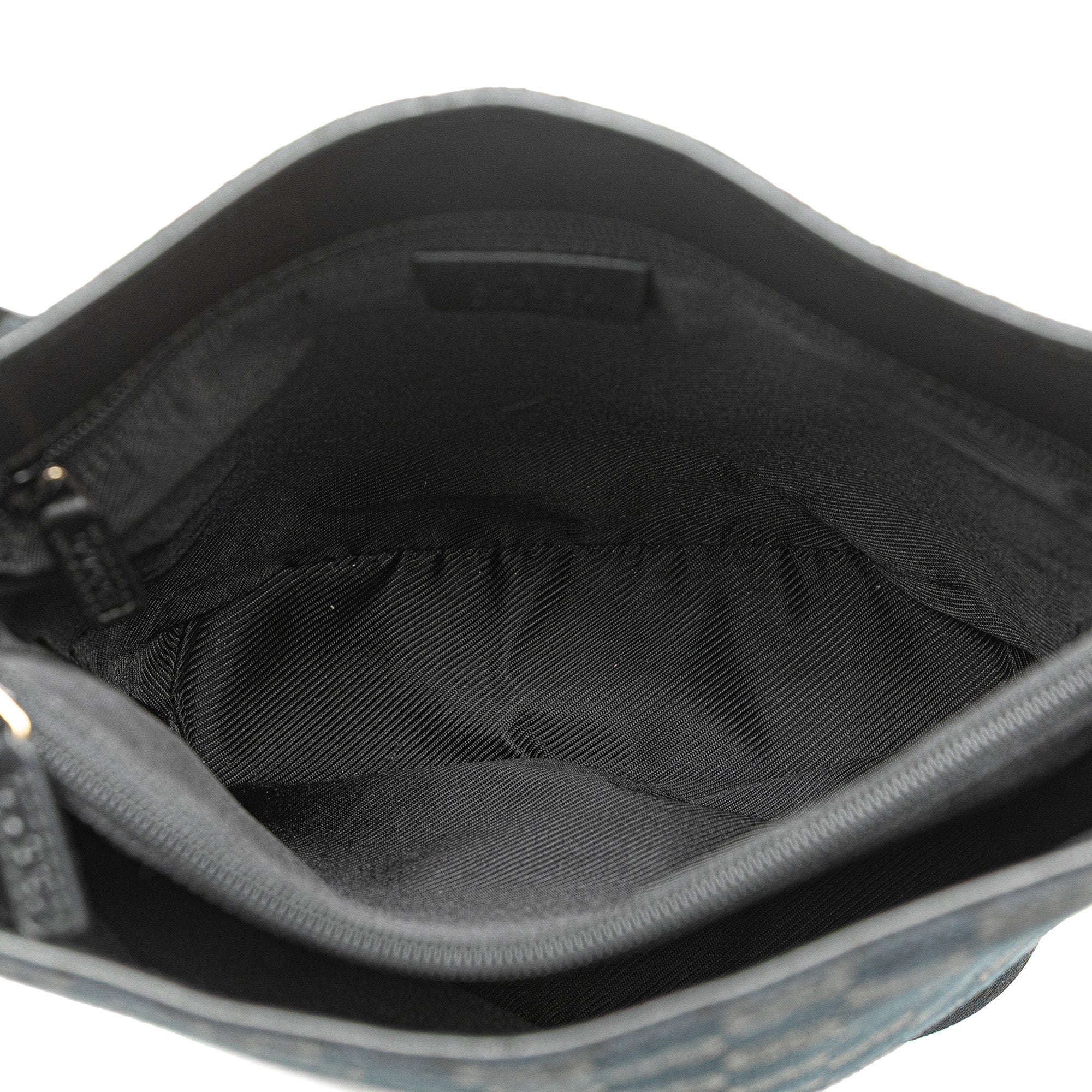 This shoulder bag features a canvas body with leather trim, a flat leather strap, an open top, an interior zip compartment, and an interior zip pocket. Retail Price: 795.00