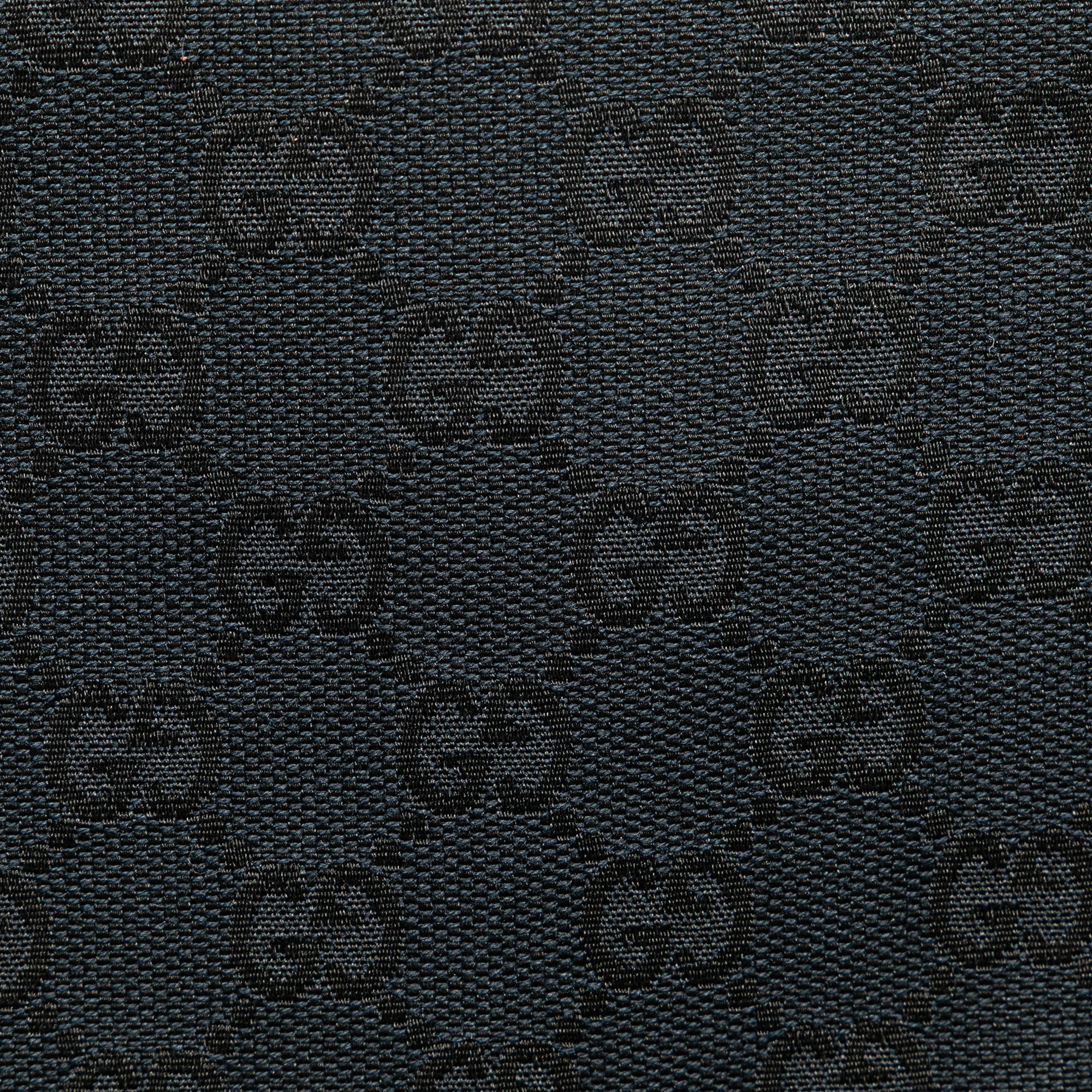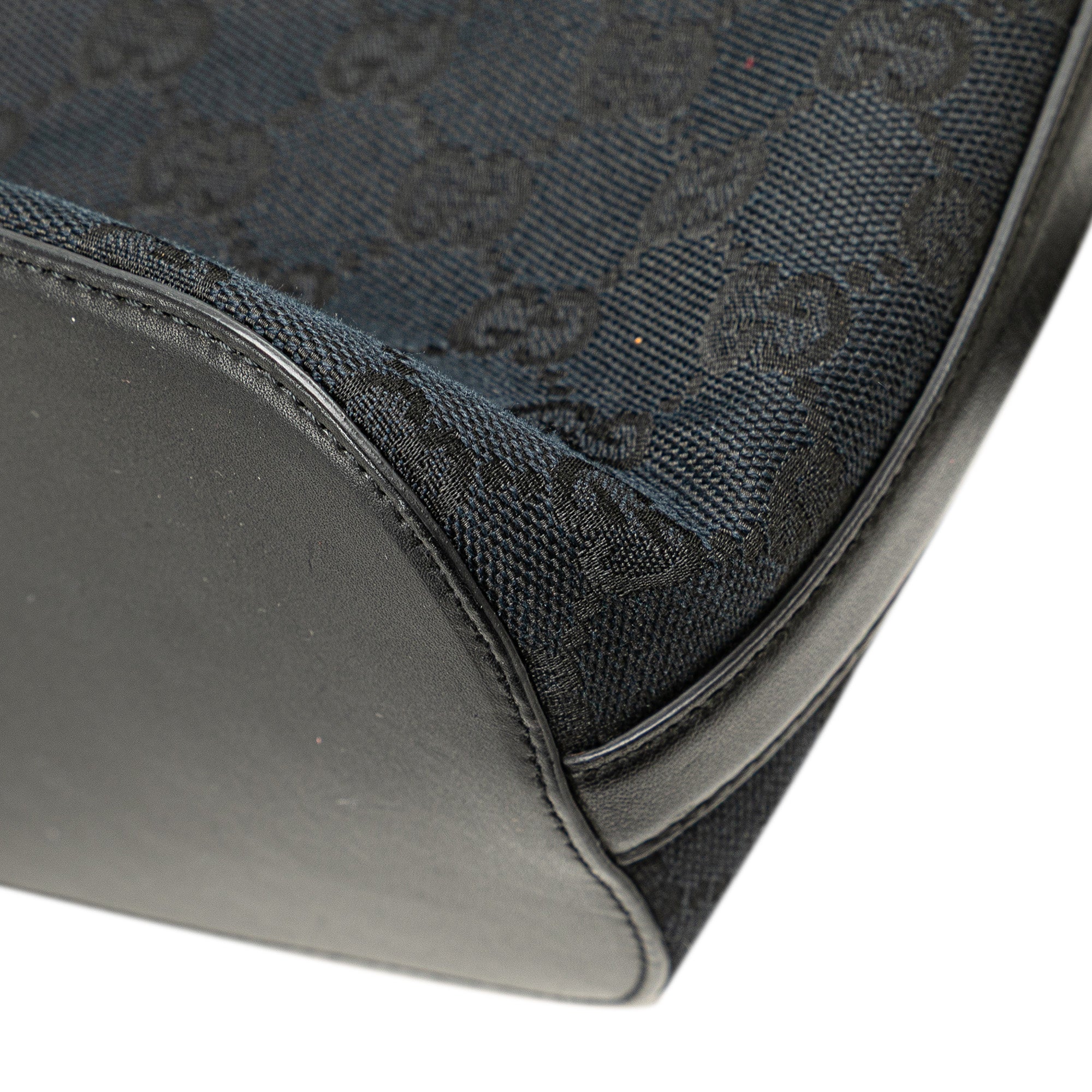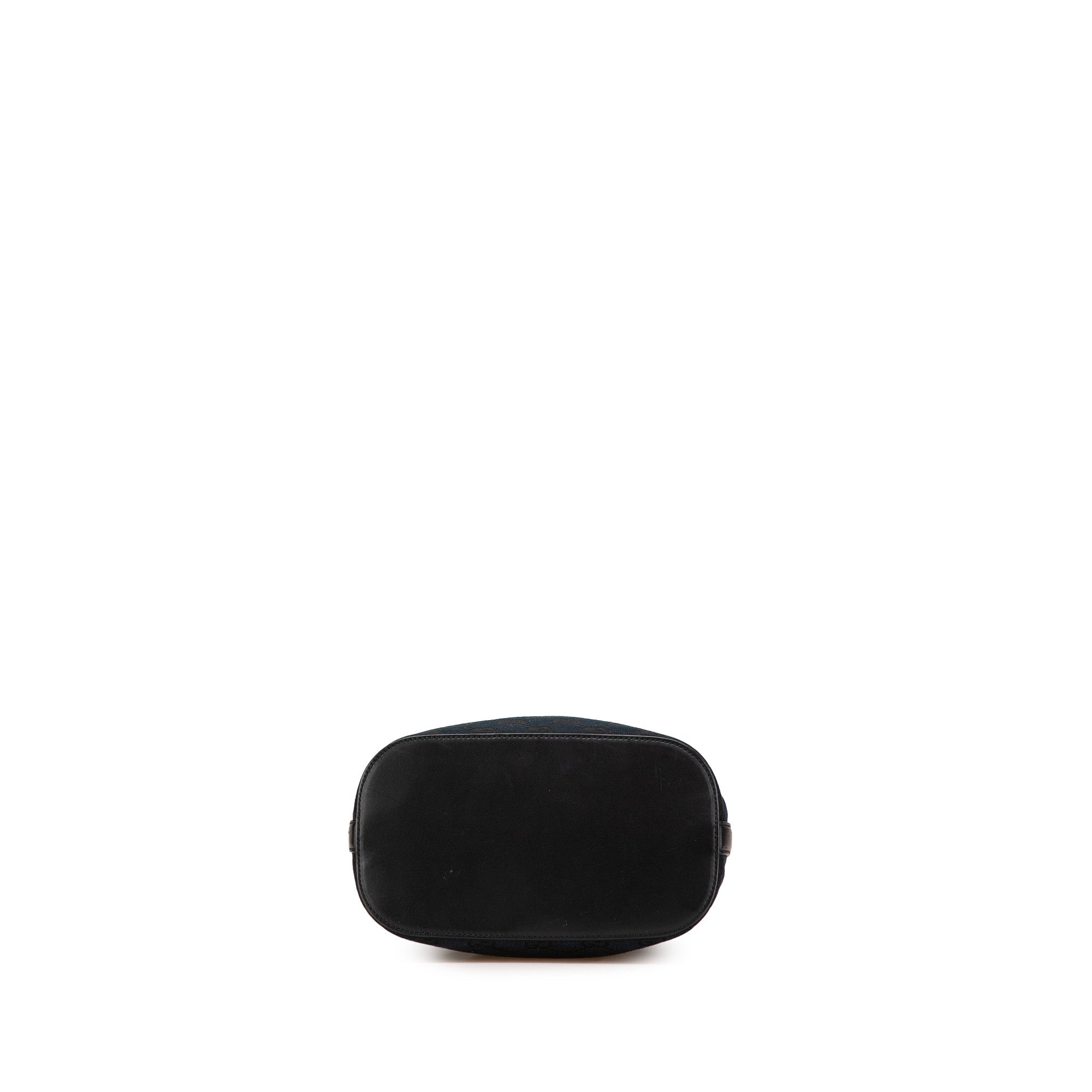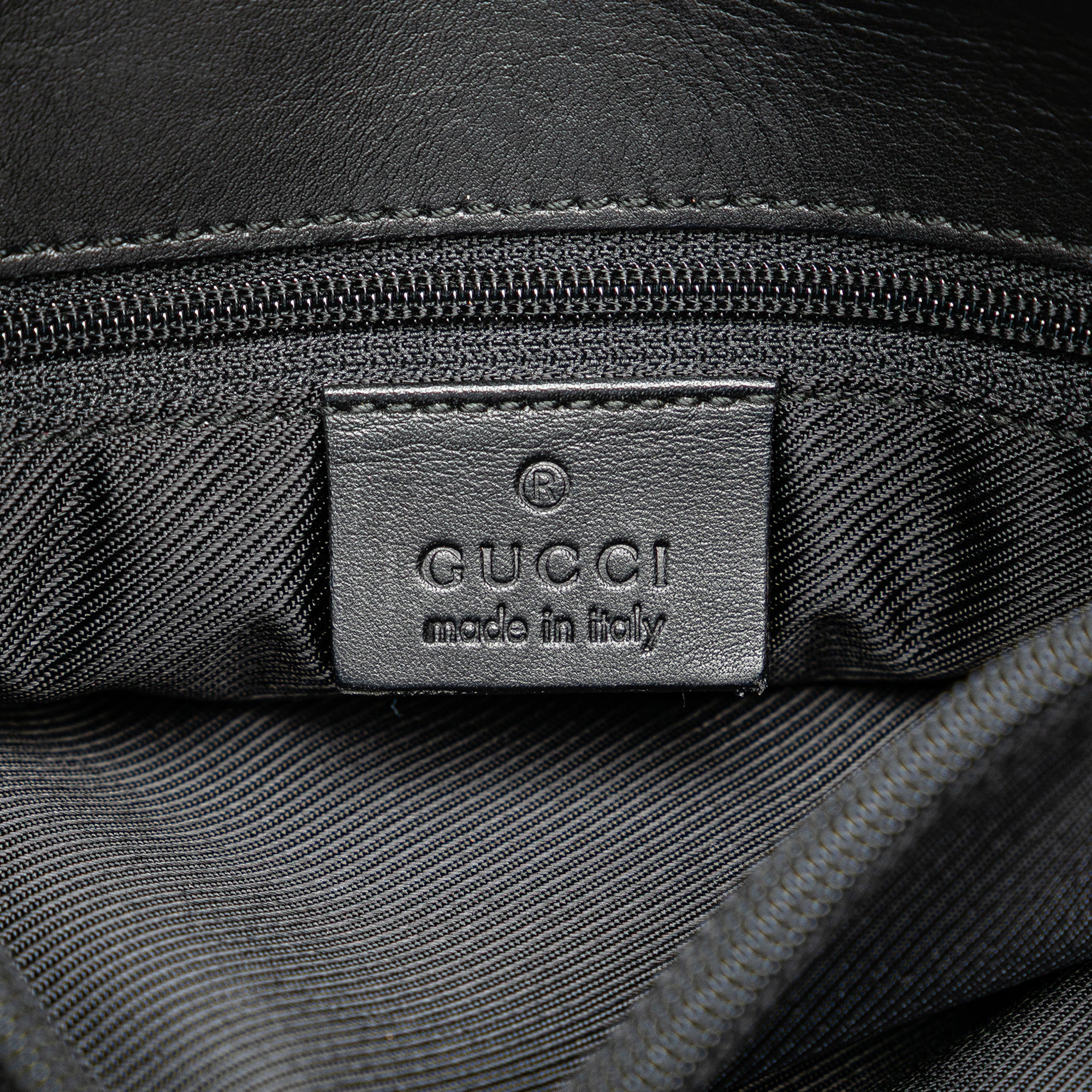 This shoulder bag features a canvas body with leather trim, a flat leather strap, an open top, an interior zip compartment, and an interior zip pocket. Retail Price: 795.00