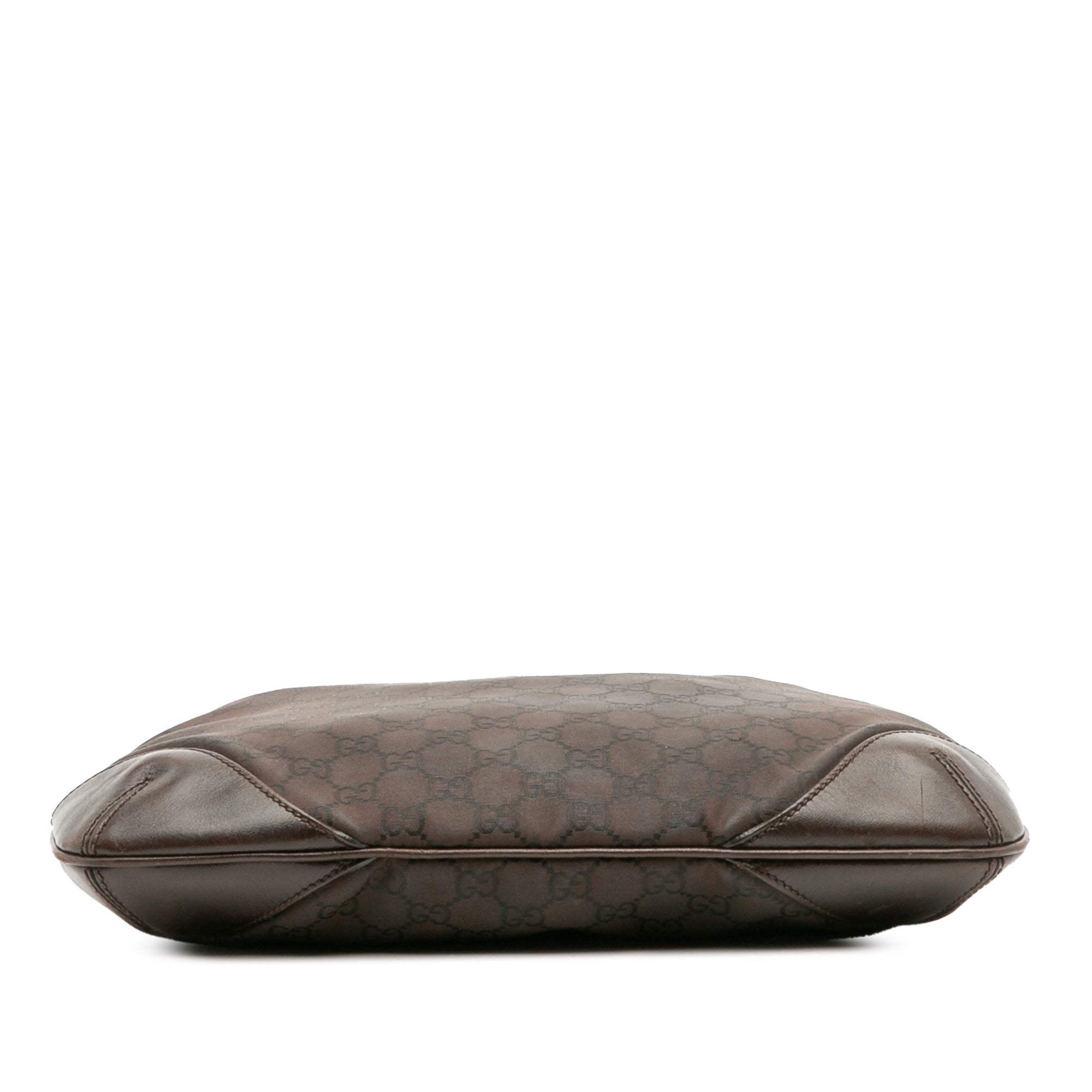 This shoulder bag features a canvas body with leather trim, a flat leather strap, an open top with a magnetic closure, and an interior zip pocket. Retail Price: 750.00