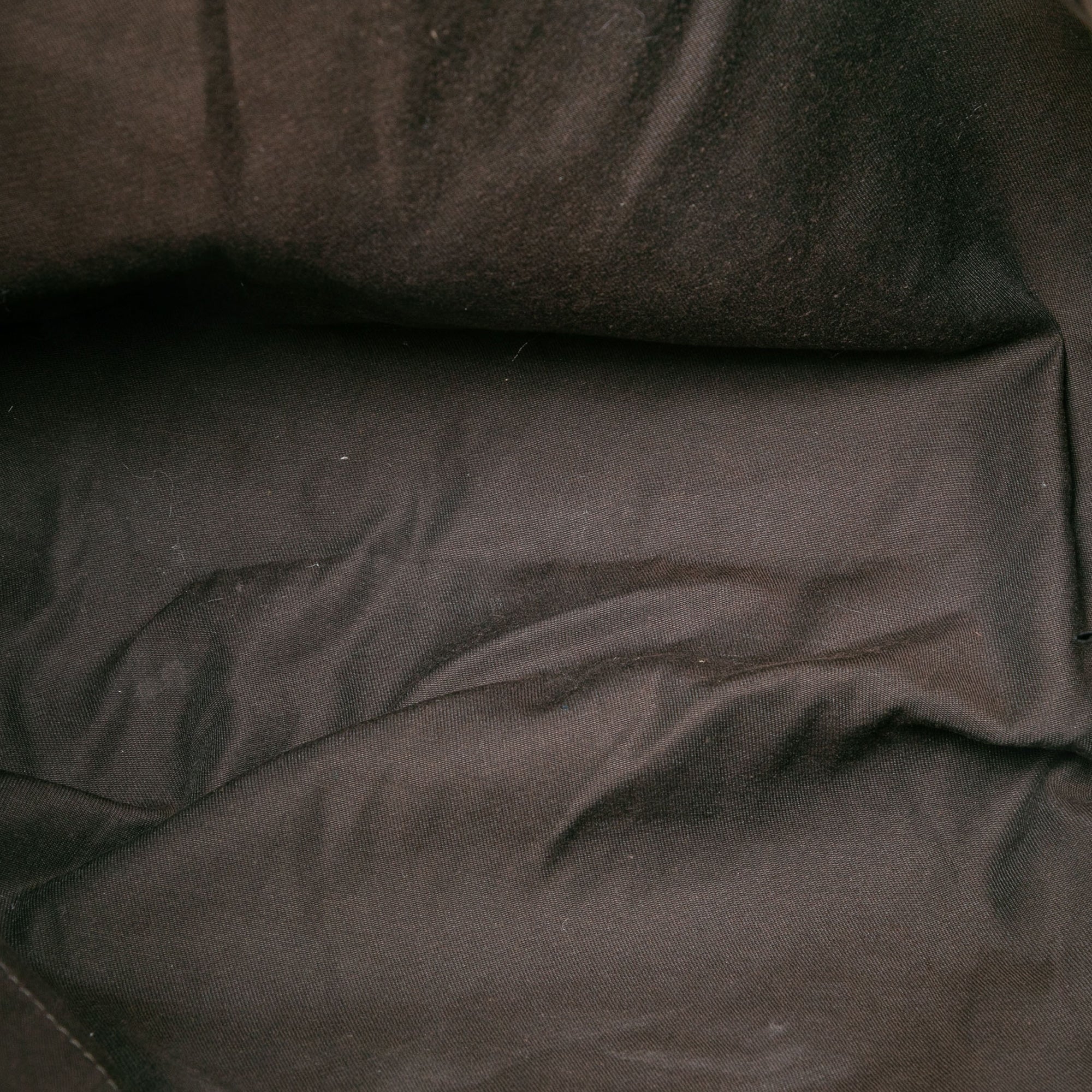 This tote bag features a canvas body with leather trim, flat canvas straps, an open top, and interior slip pockets. Retail Price: 800.00