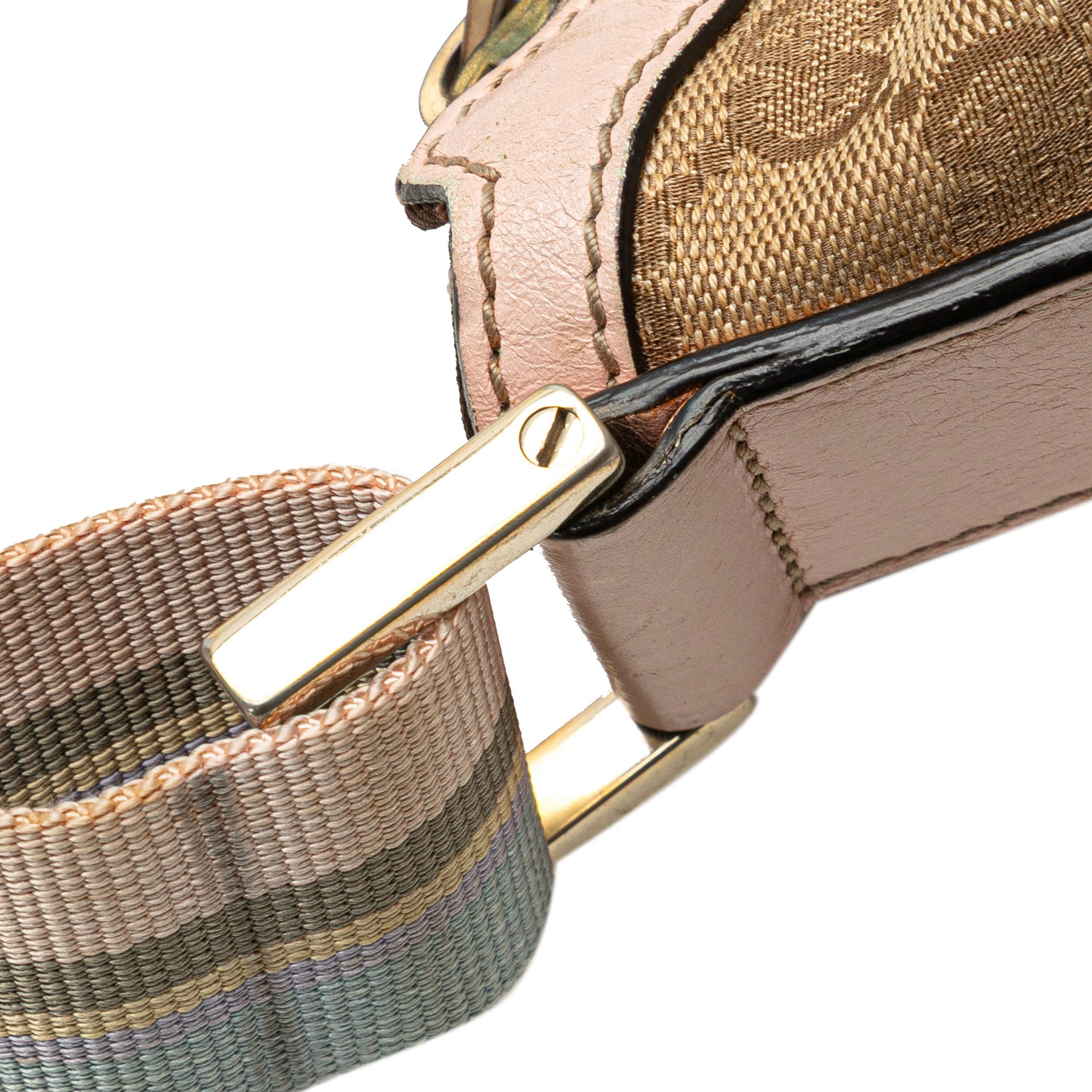 This crossbody bag features a canvas body with leather trim, a flat strap, a top zip closure, and interior zip and slip pockets. Retail Price: 800.00