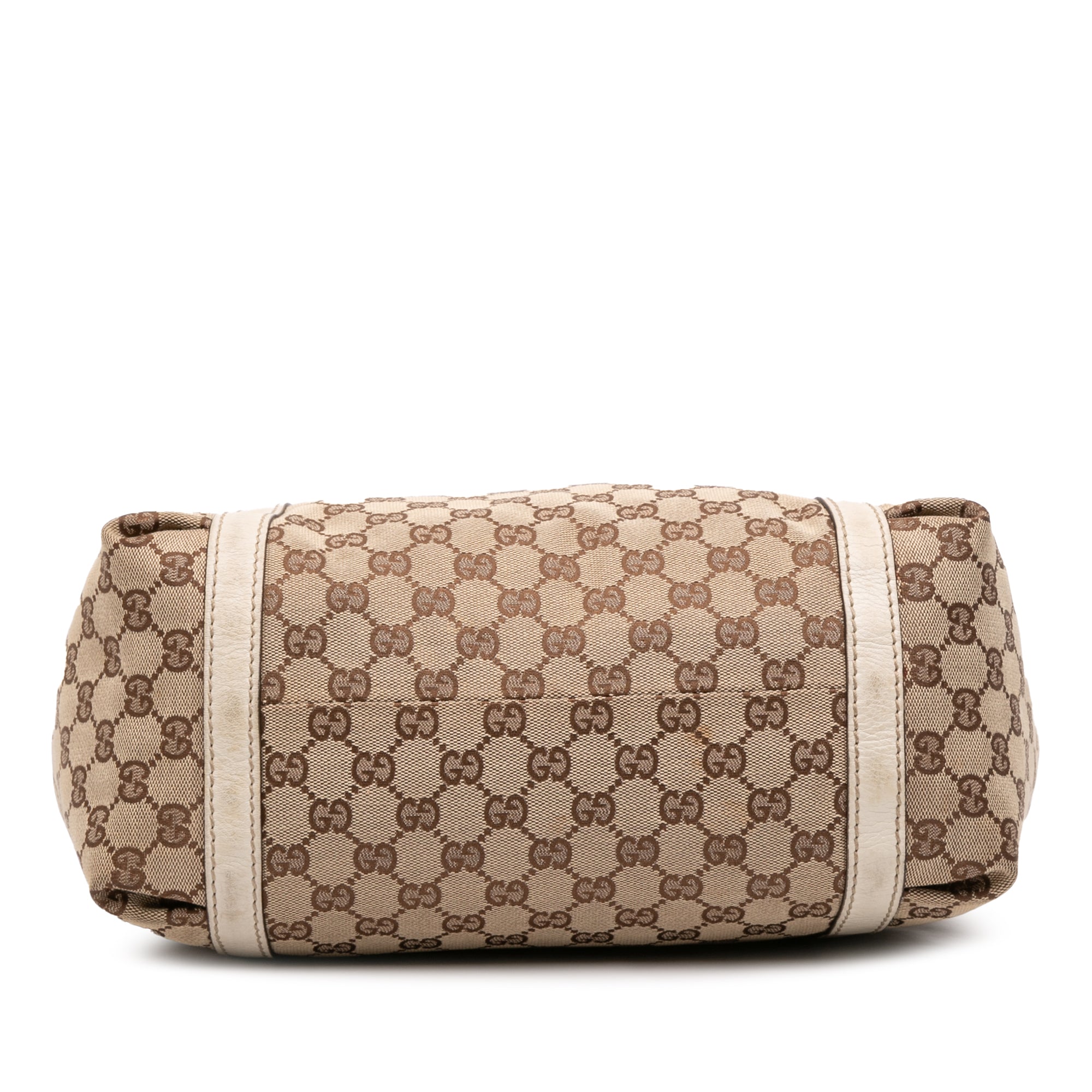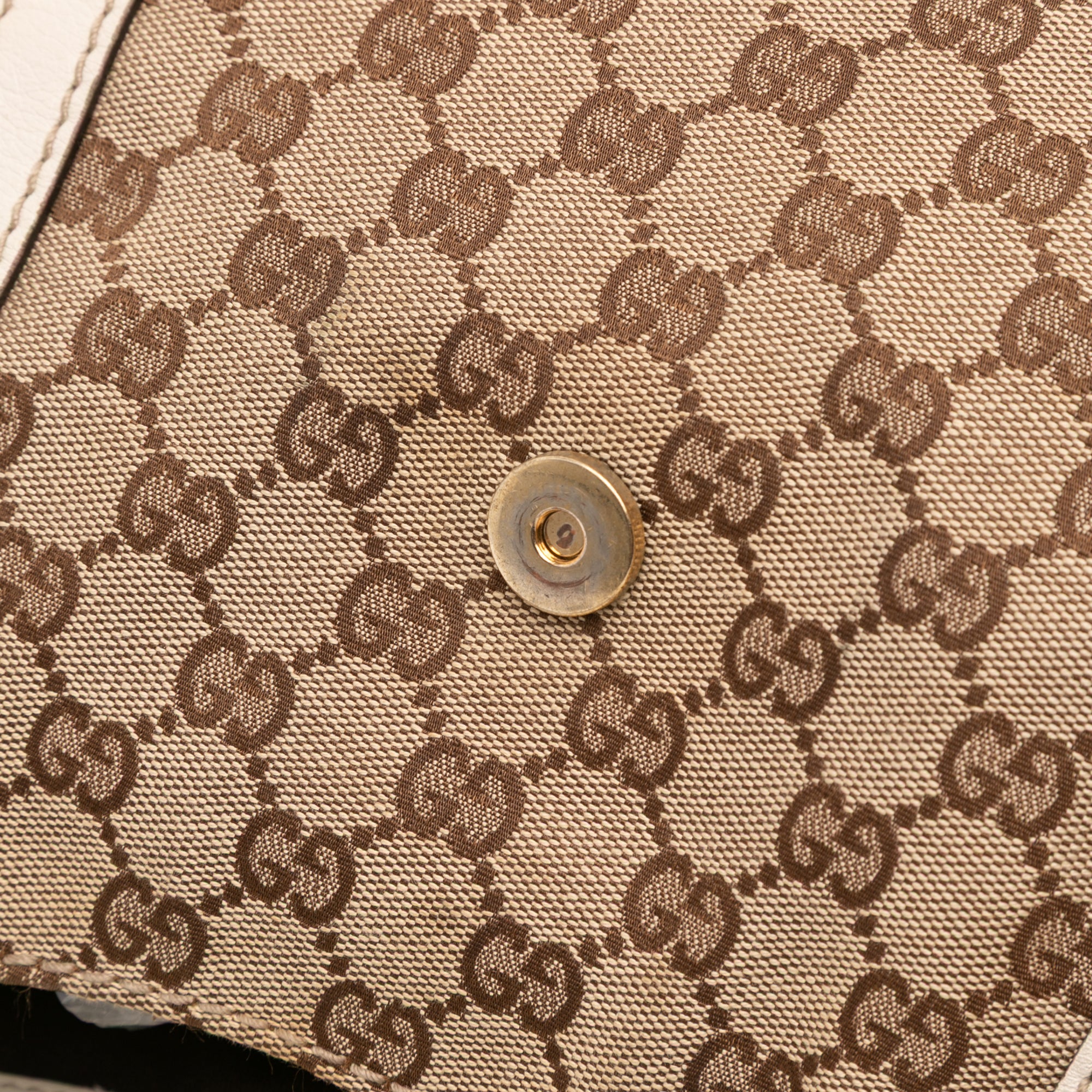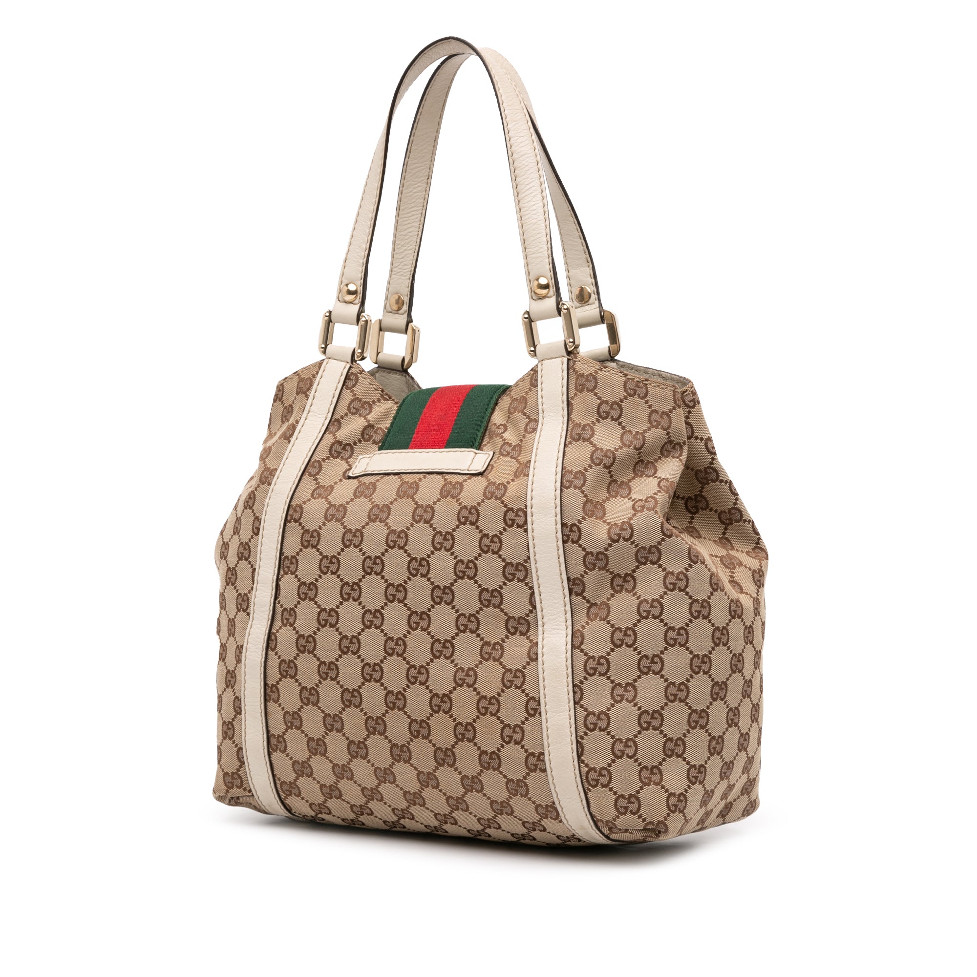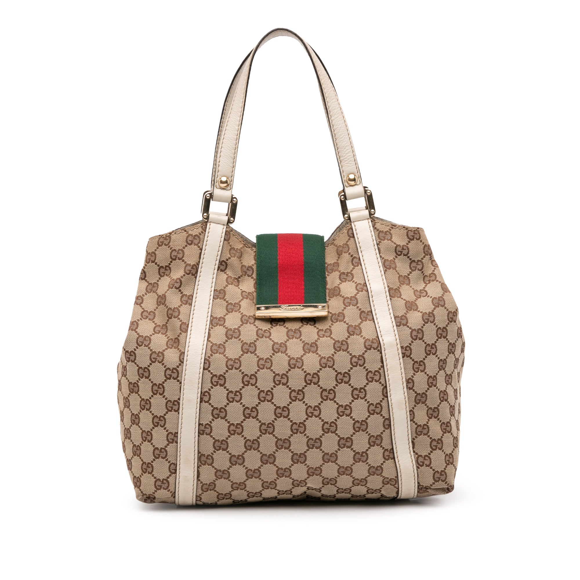 The New Ladies tote features a canvas body with leather trim, flat leather straps, an open top with a flap tab and magnetic snap closure, and interior zip and slip pockets. Retail Price: 935.00