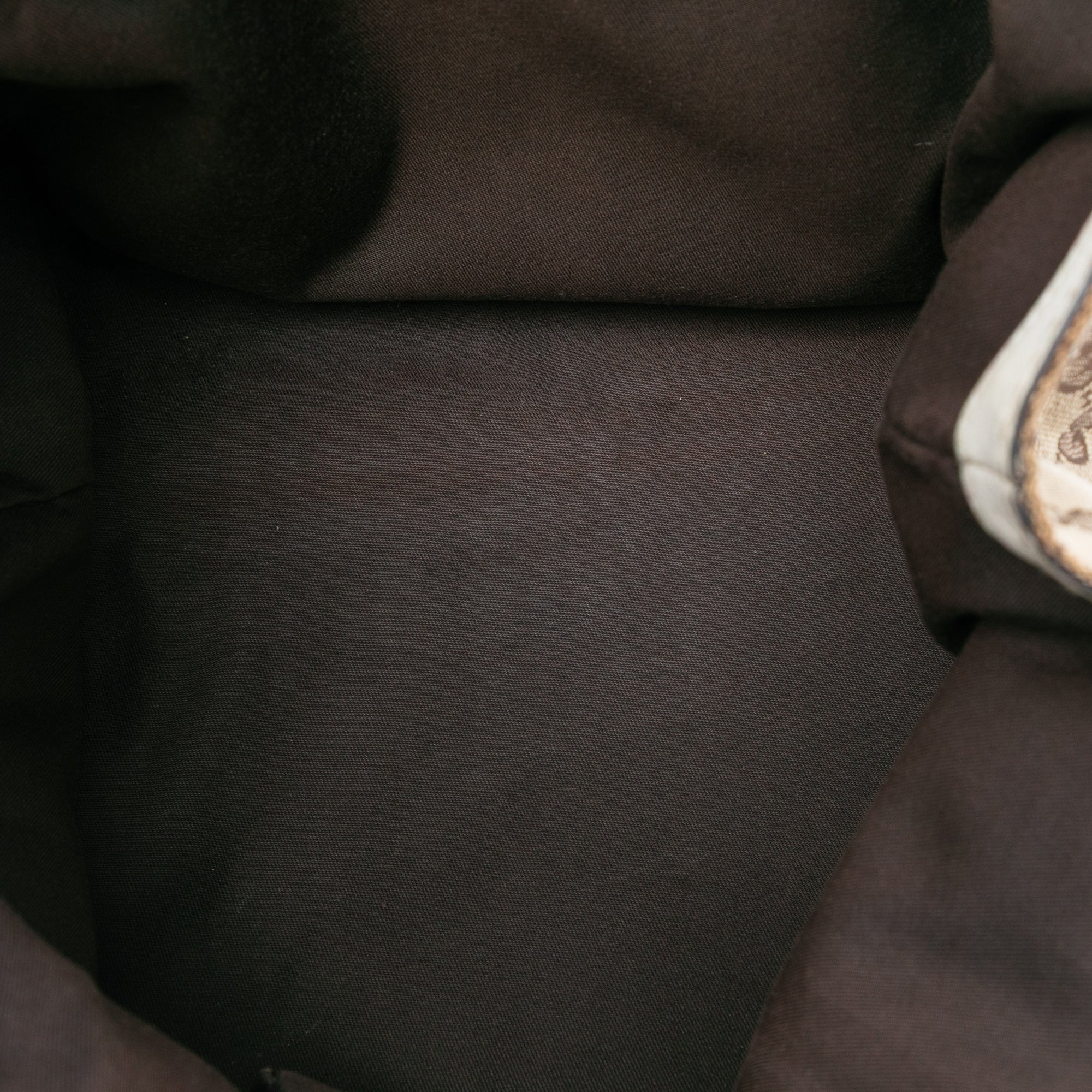 The New Ladies tote features a canvas body with leather trim, flat leather straps, an open top with a flap tab and magnetic snap closure, and interior zip and slip pockets. Retail Price: 935.00
