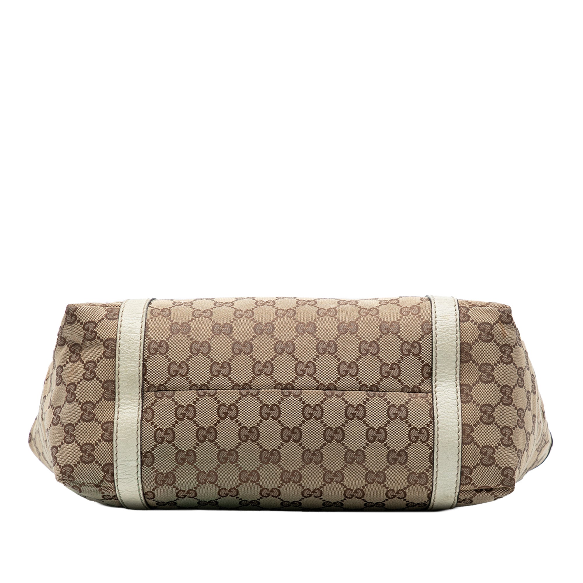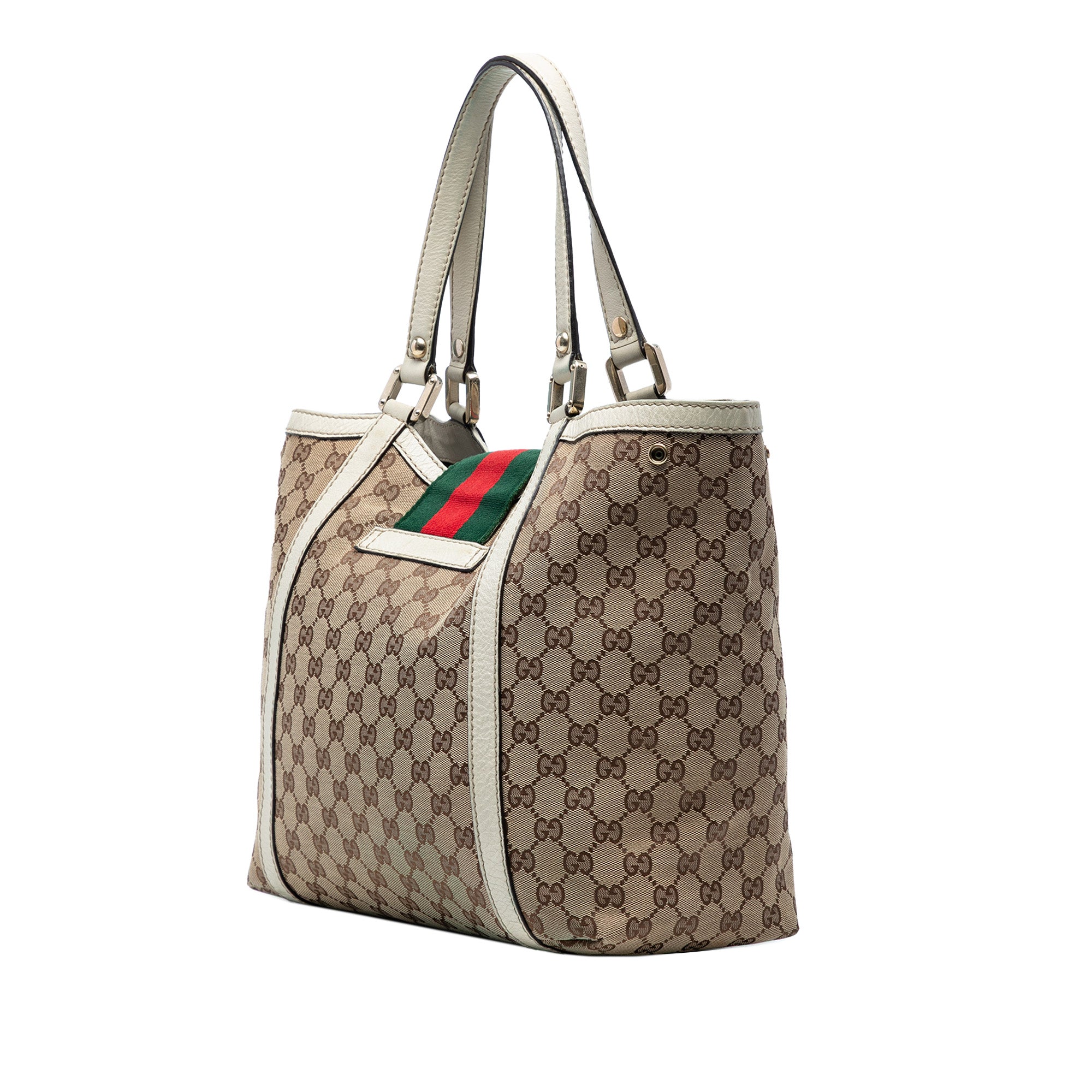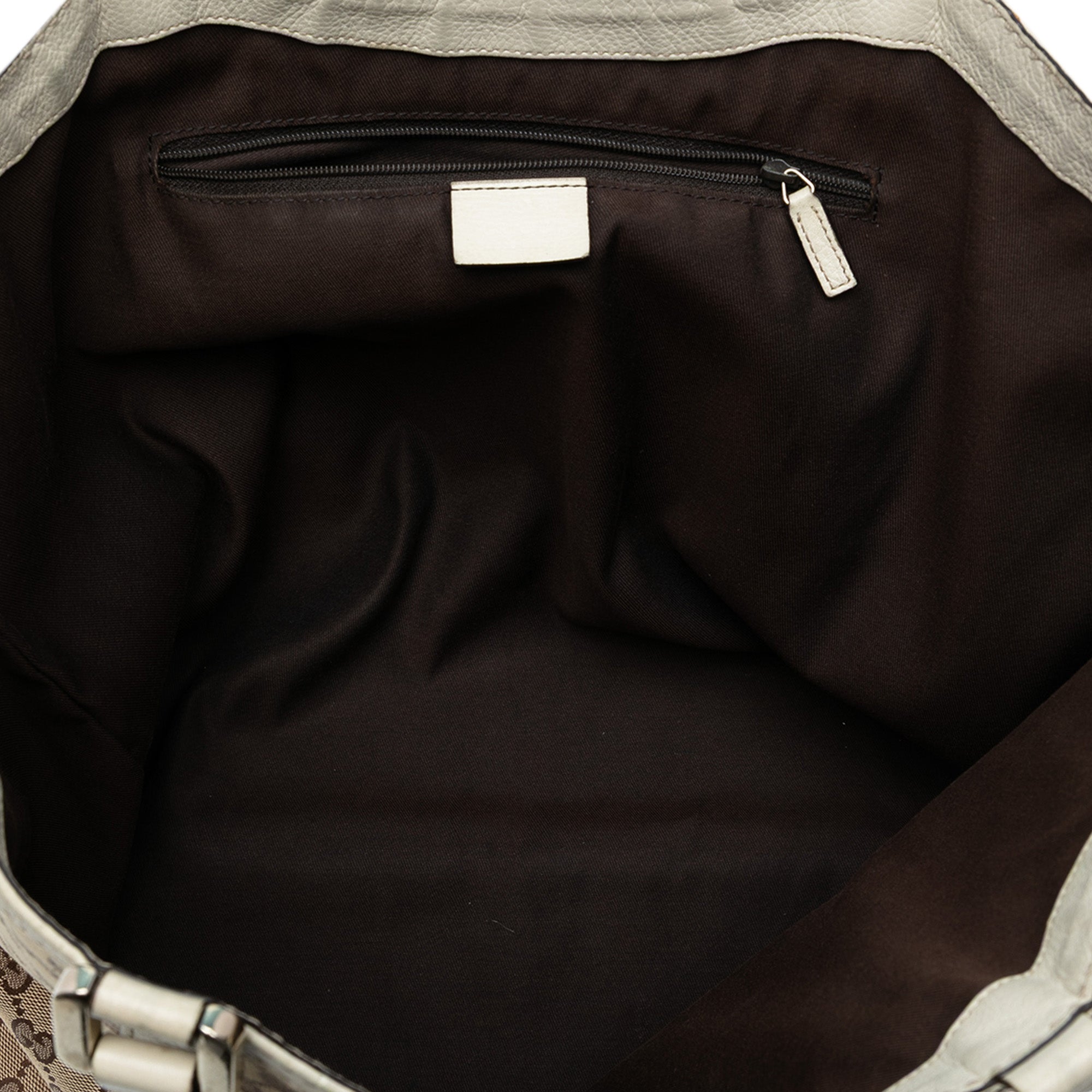 The New Ladies tote features a canvas body with leather trim, flat leather straps, an open top with a flap tab and magnetic snap closure, and interior zip and slip pockets. Retail Price: 935.00