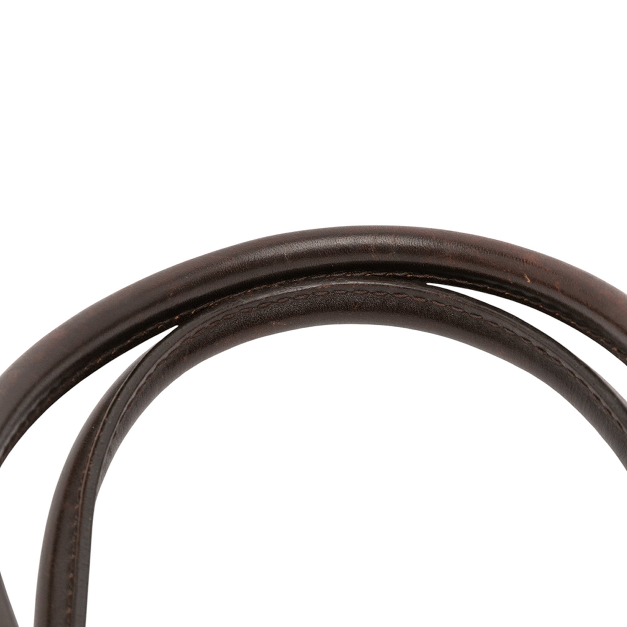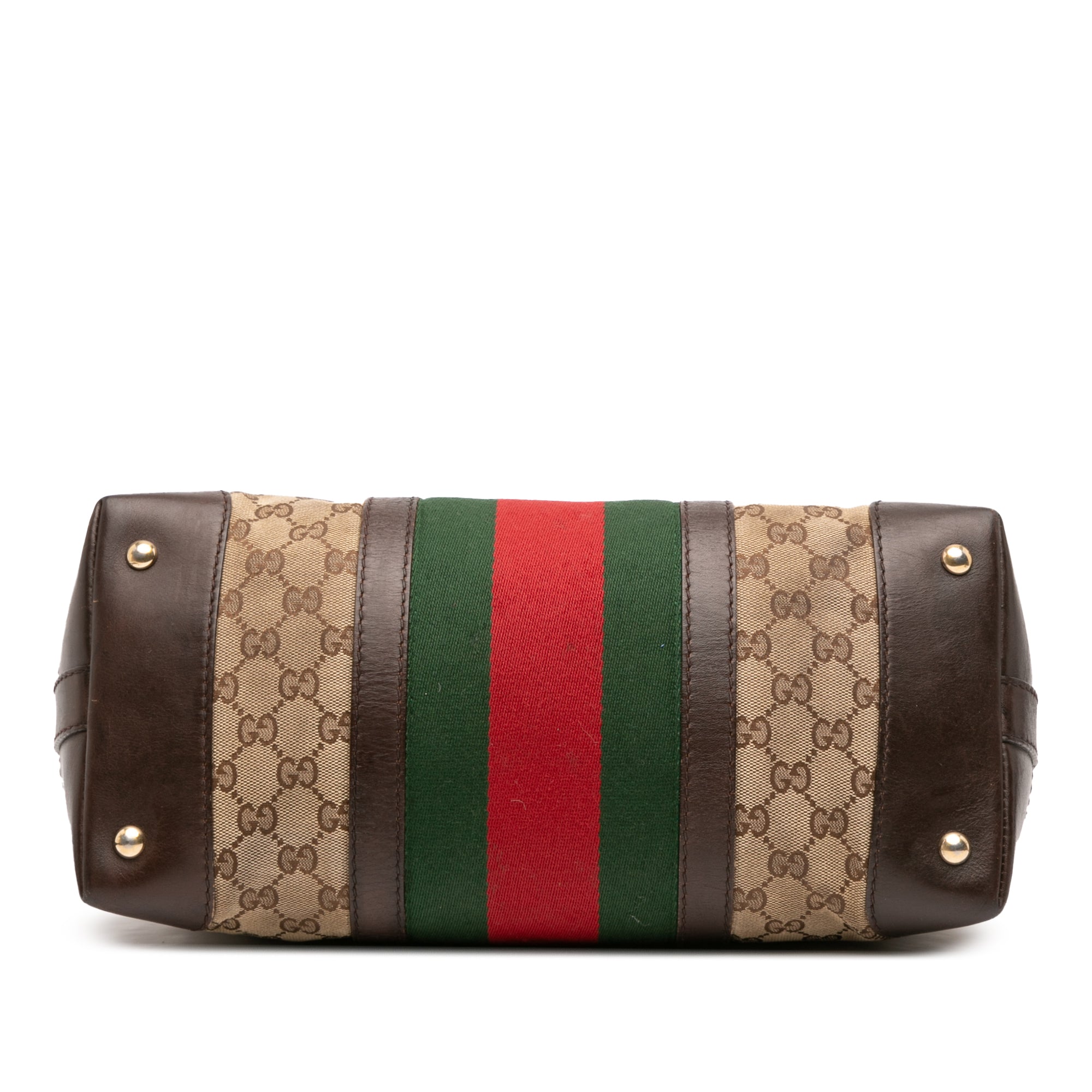 This satchel features a canvas body with leather trim, rolled leather handles, a detachable flat leather strap, a top zip closure, and interior zip and slip pockets. Retail Price: 800.00