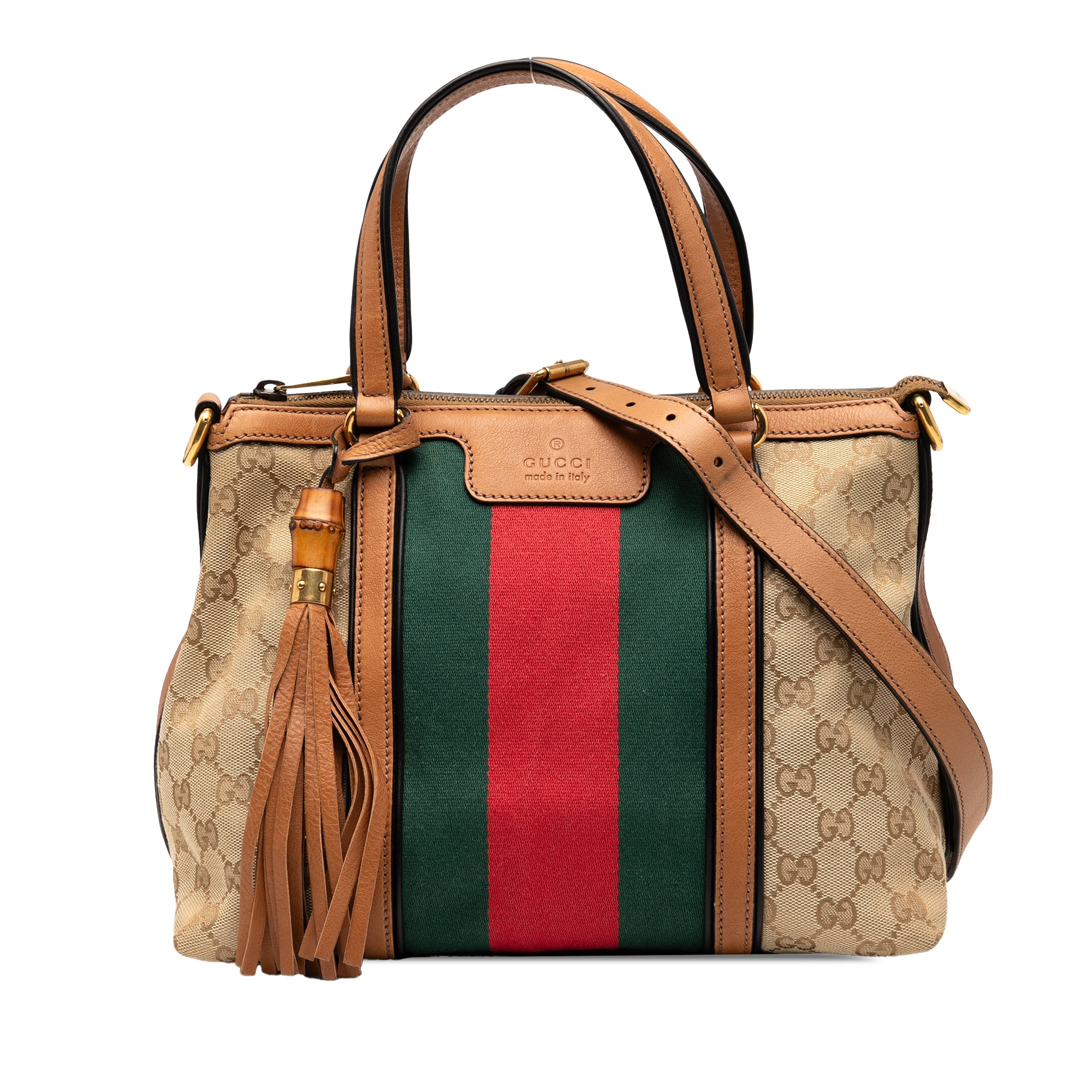This satchel features a canvas body with leather trim and web detail, a leather tassel, flat leather handles, a detachable flat leather shoulder strap, a top zip closure, and interior zip and slip pockets. Retail Price: 1995.00
