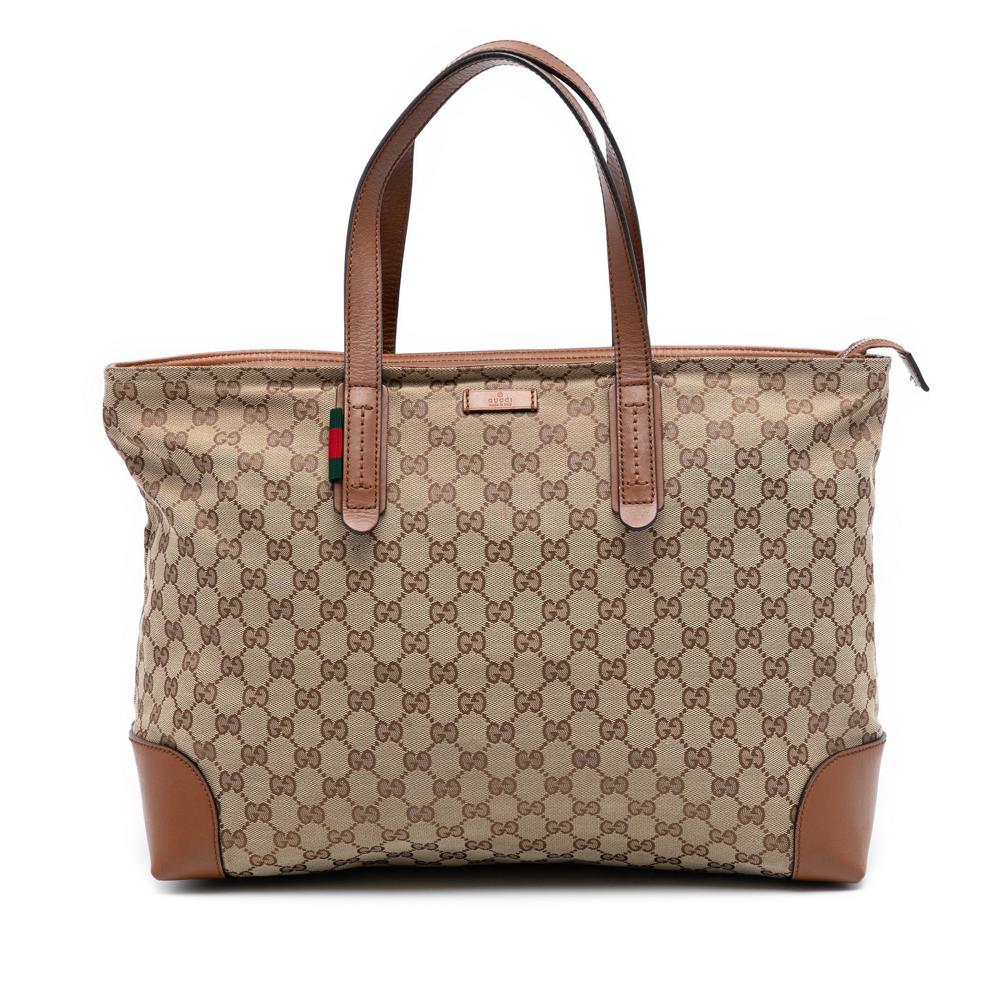 This tote bag features a canvas body with leather trim, flat leather straps, top zip closure, and interior zip and slip pockets. Retail Price: 695.00