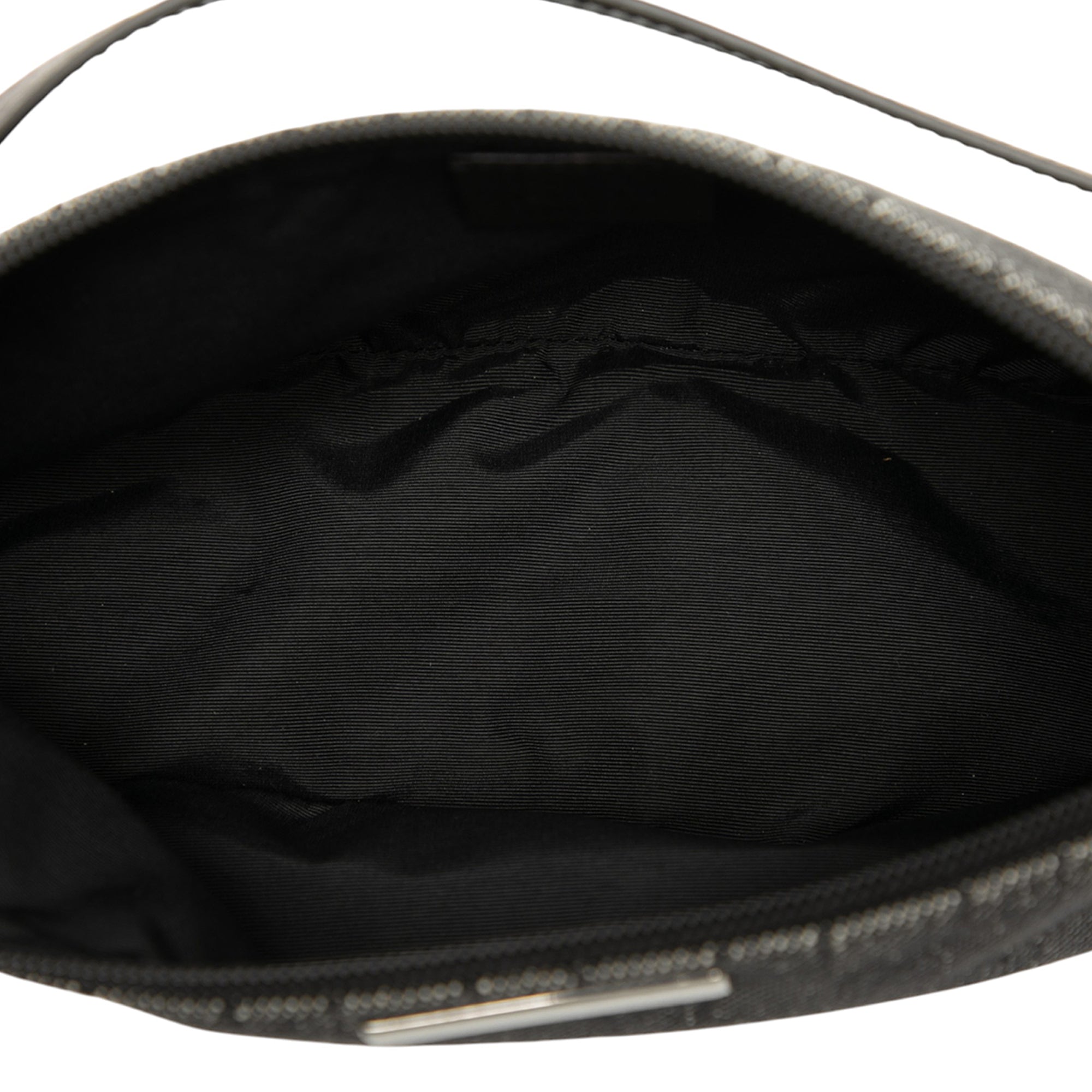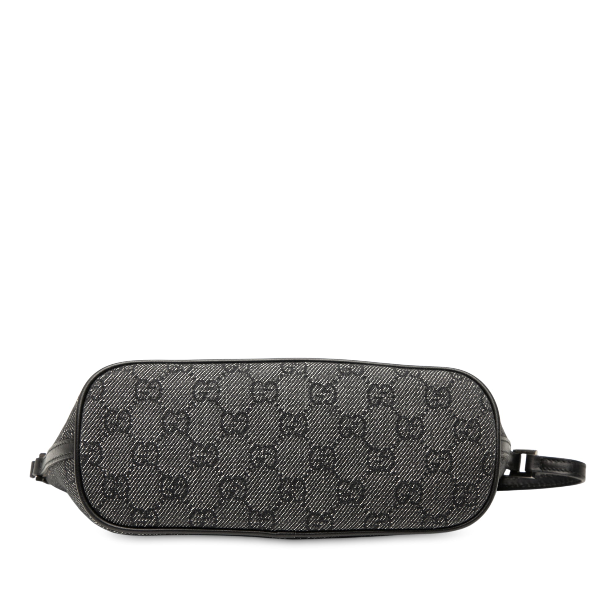 This shoulder bag features a denim body with leather trim, a flat leather strap, and a top zip closure. Retail Price: 740.00