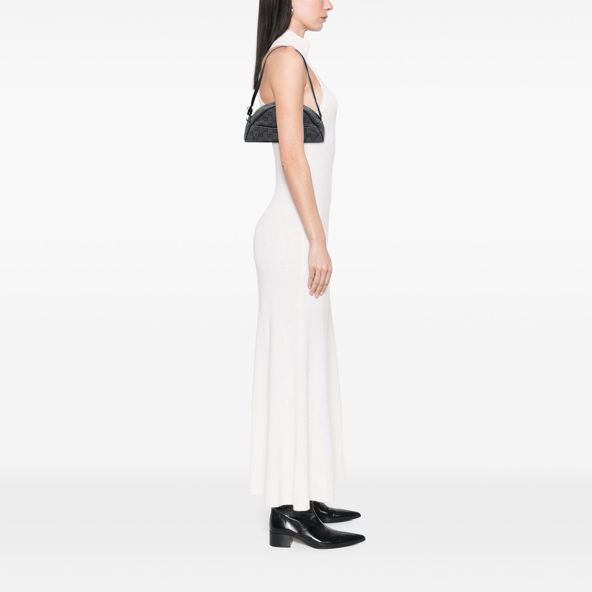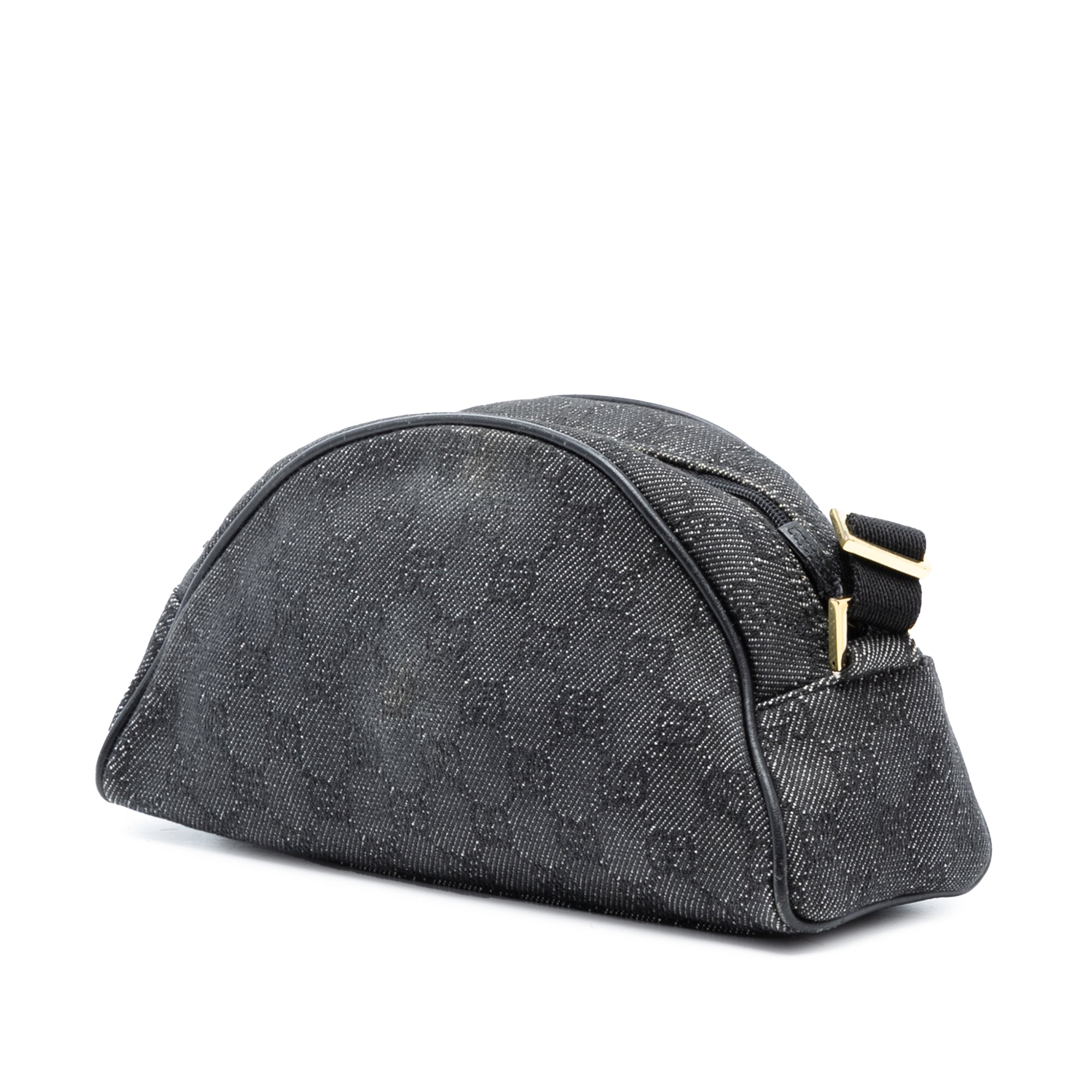 This shoulder bag features a denim body, a flat strap, a top zip closure, and exterior slip pockets. Retail Price: 600.00