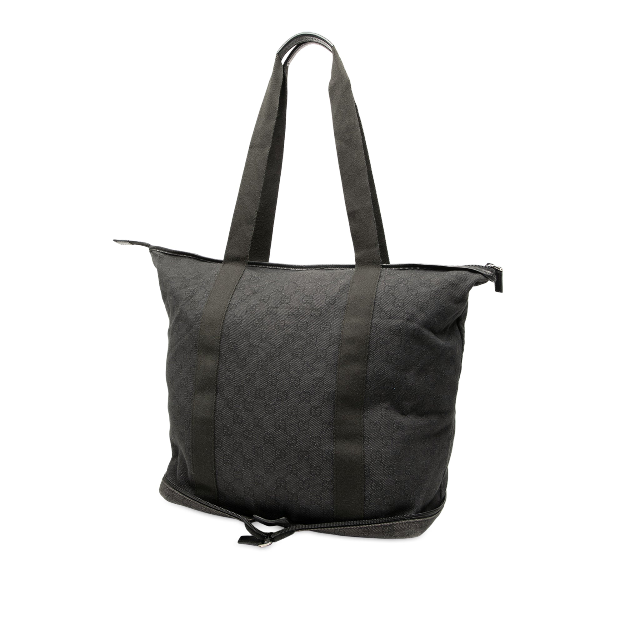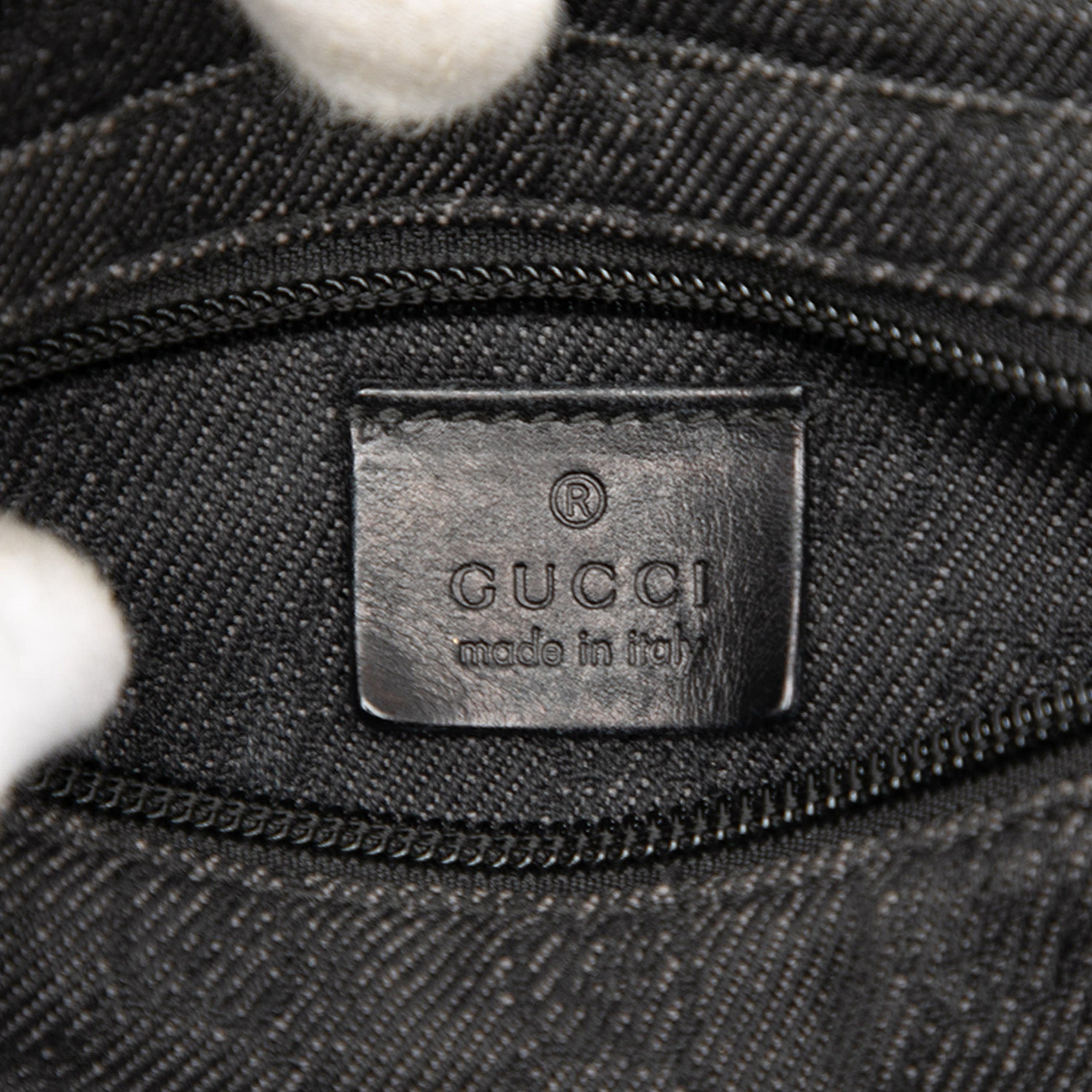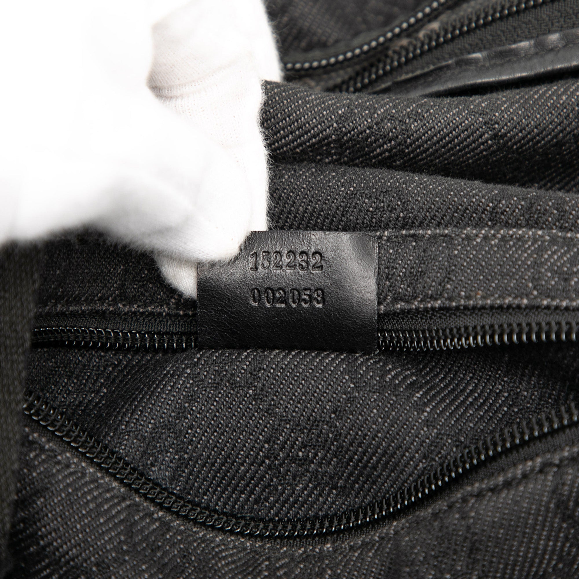 This tote bag features a denim body, flat straps, a top zip closure, and an exterior front zip pocket. Retail Price: 825.00