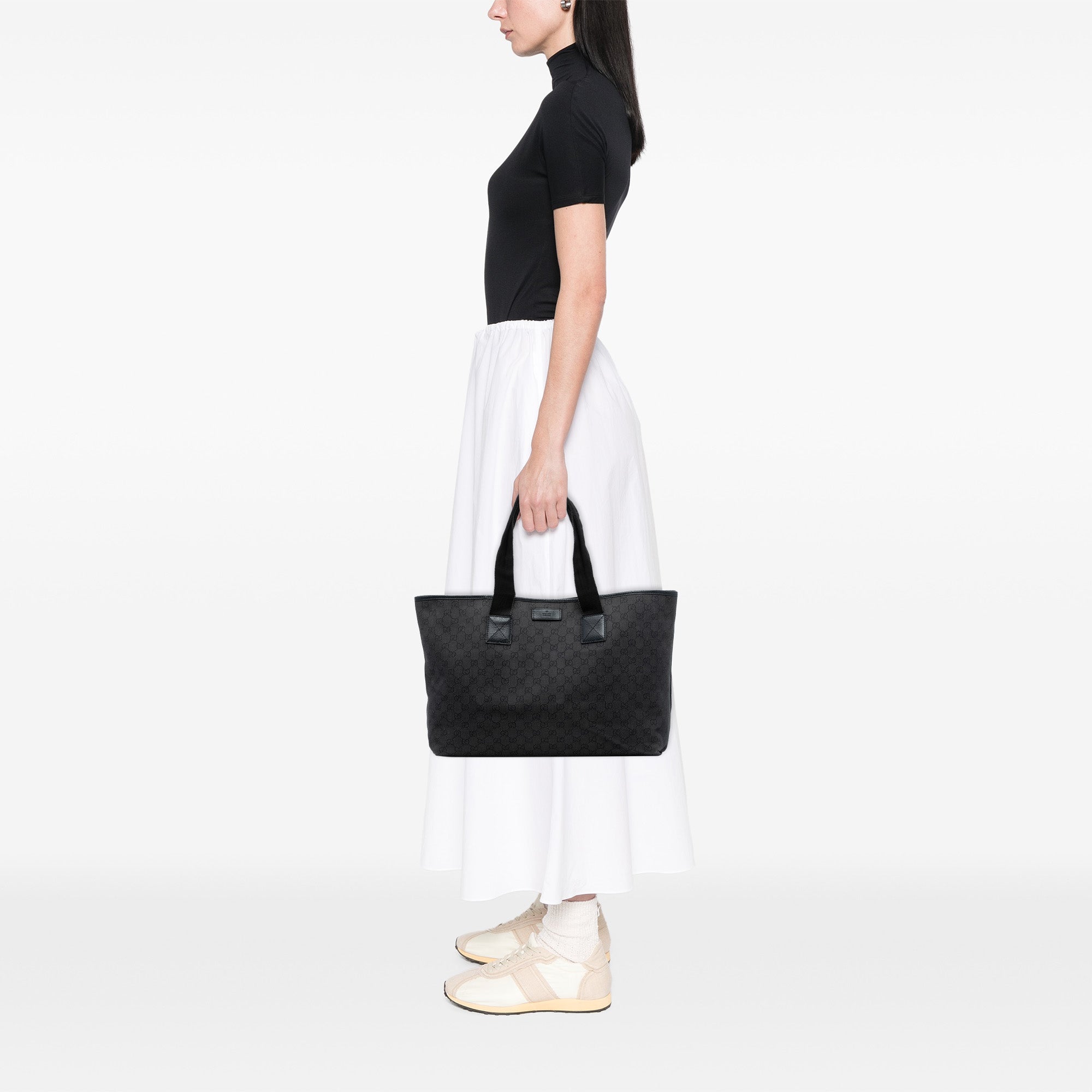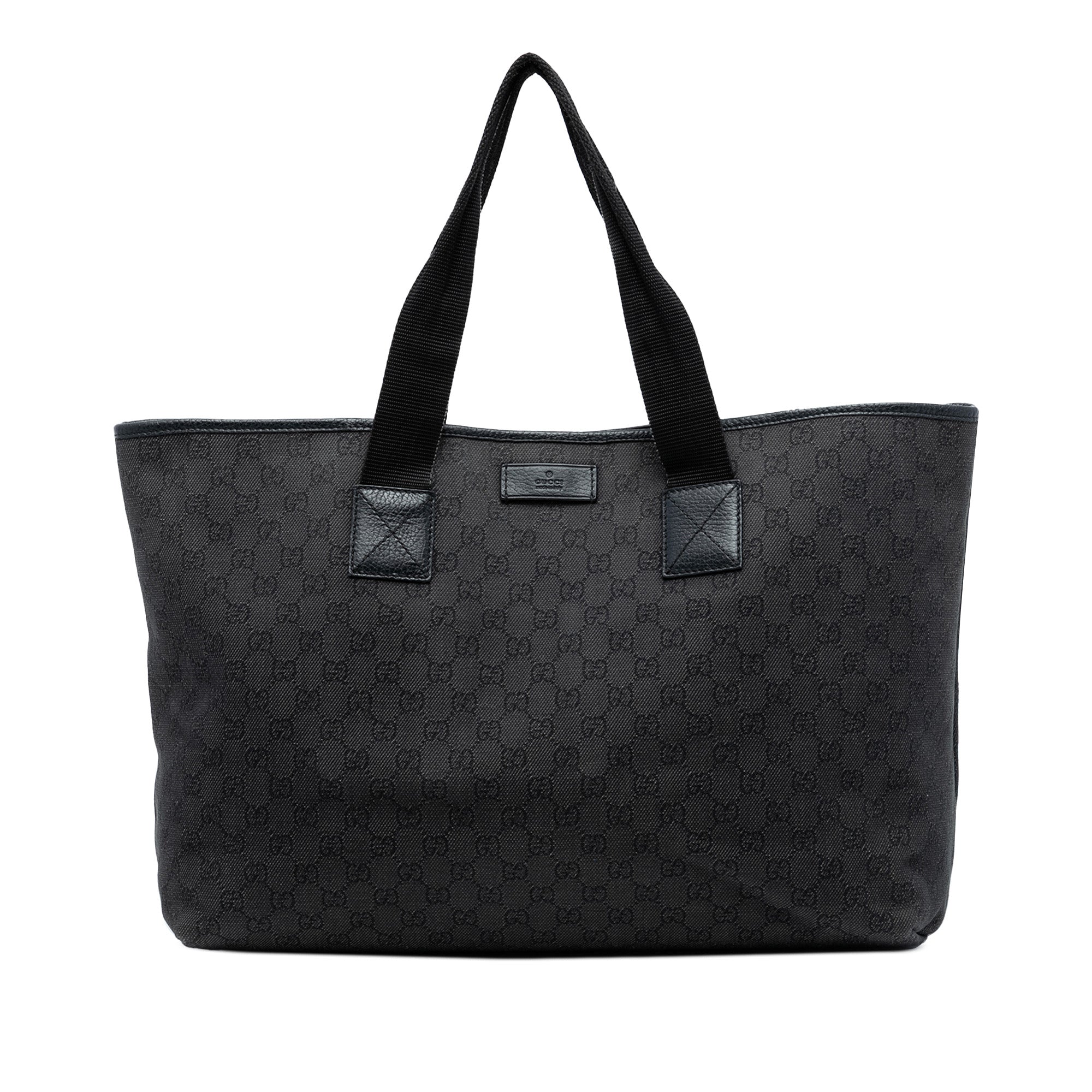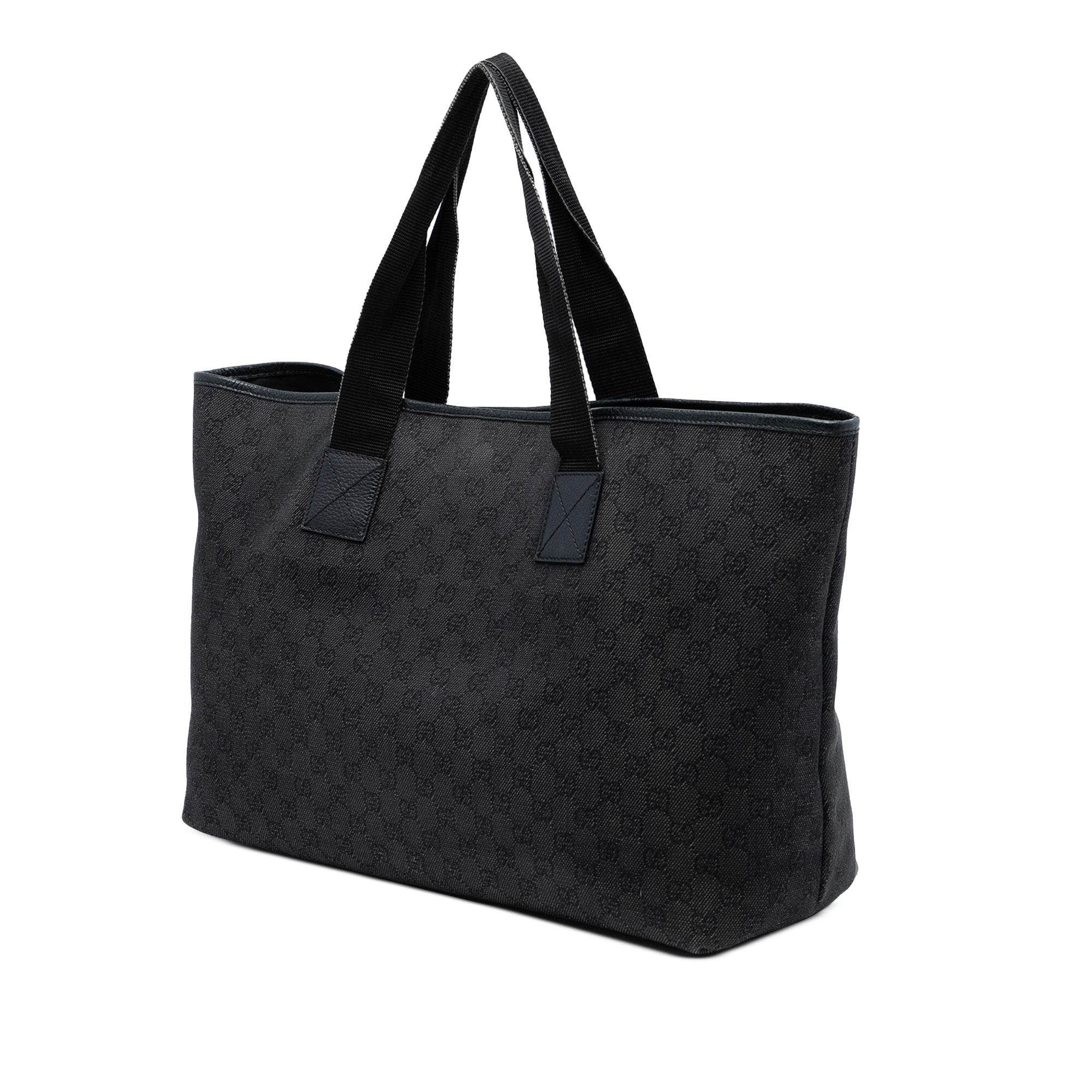 This tote bag features a denim body with leather trim, flat handles, an open top with magnetic closure, and interior zip and slip pockets. Retail Price: 1200.00