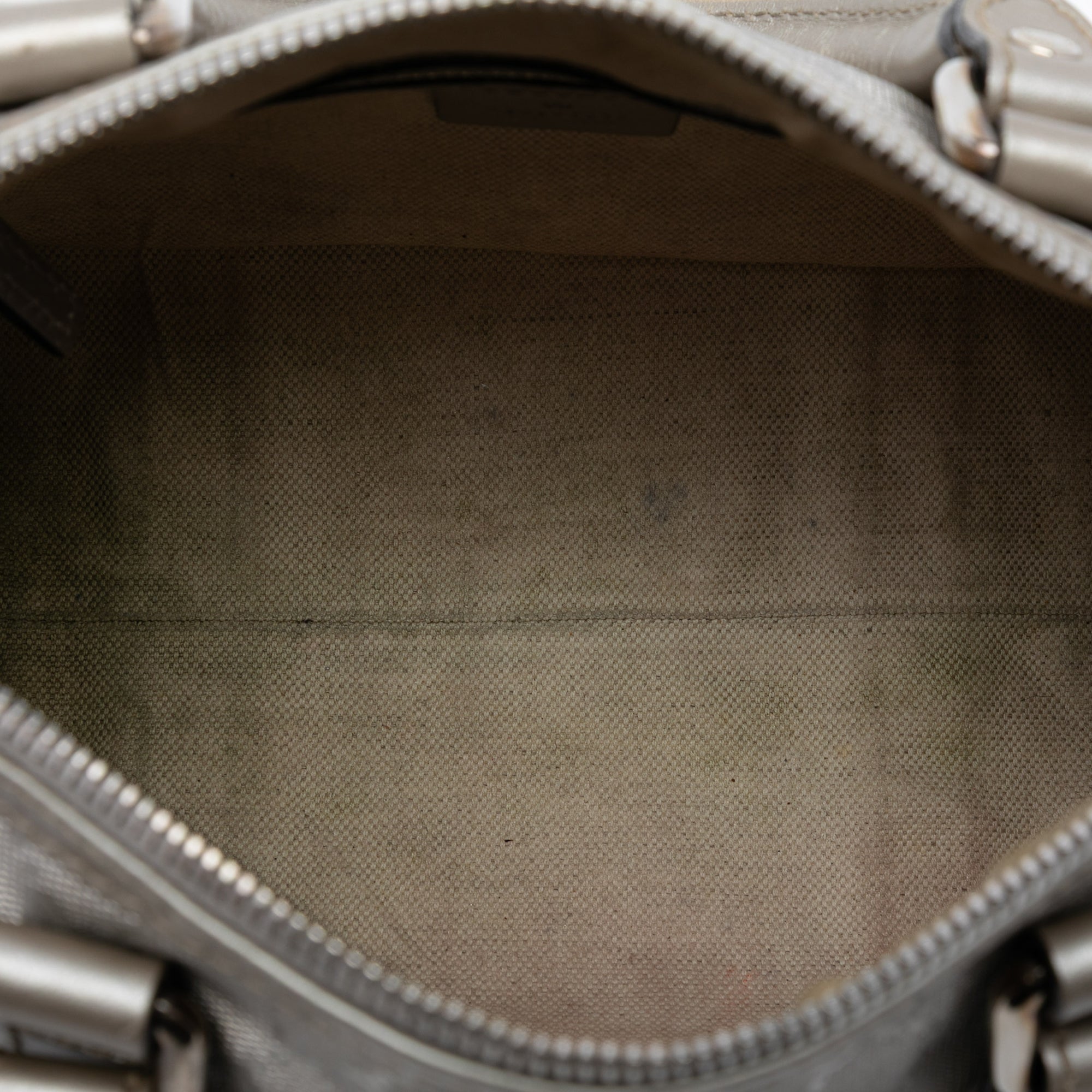 This boston bag features a coated canvas body with leather trim, rolled leather handles, a top zip closure, and an interior slip pocket. Retail Price: 1500.00