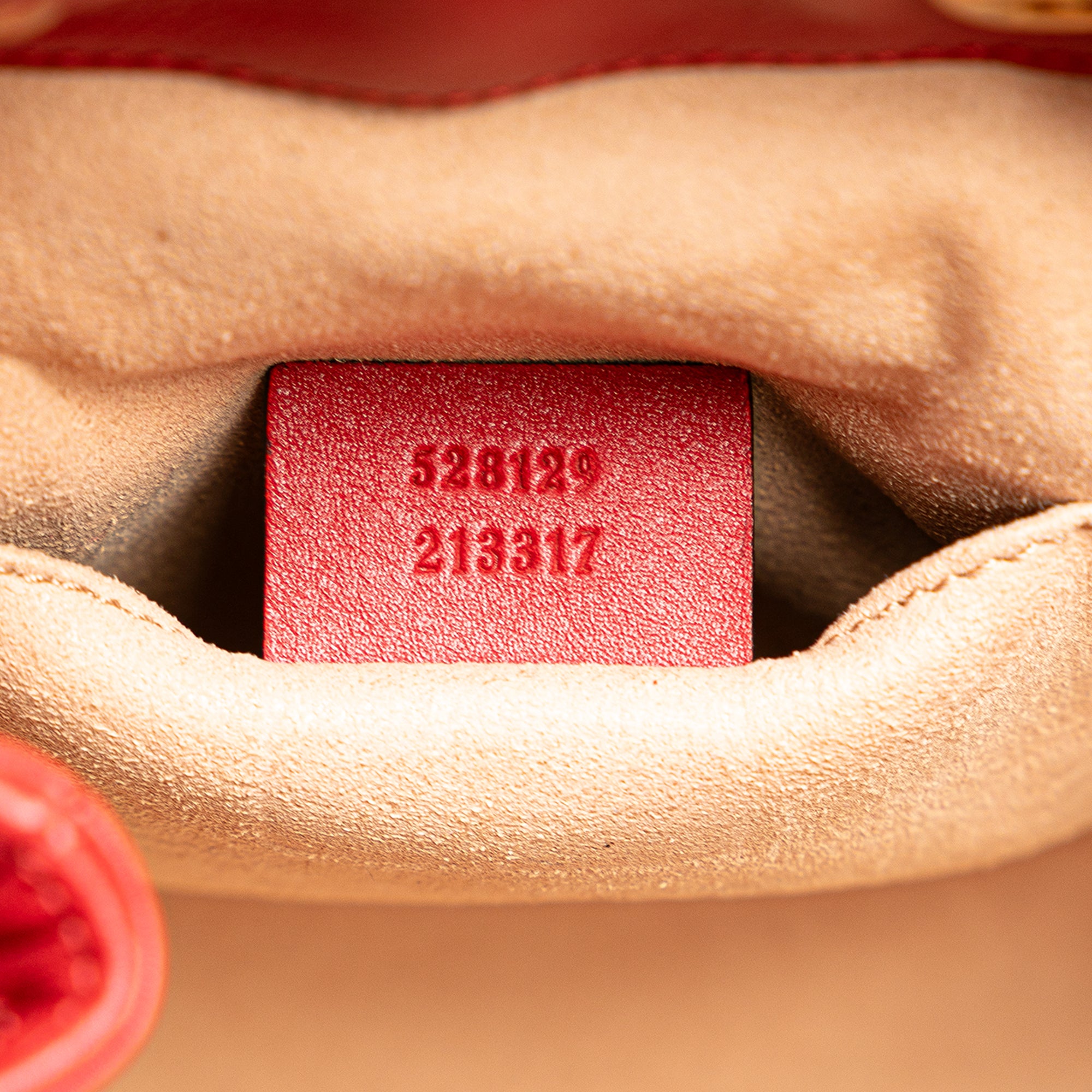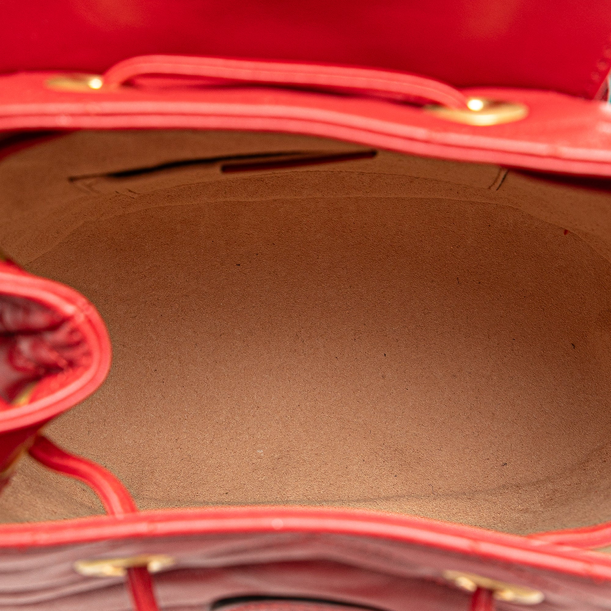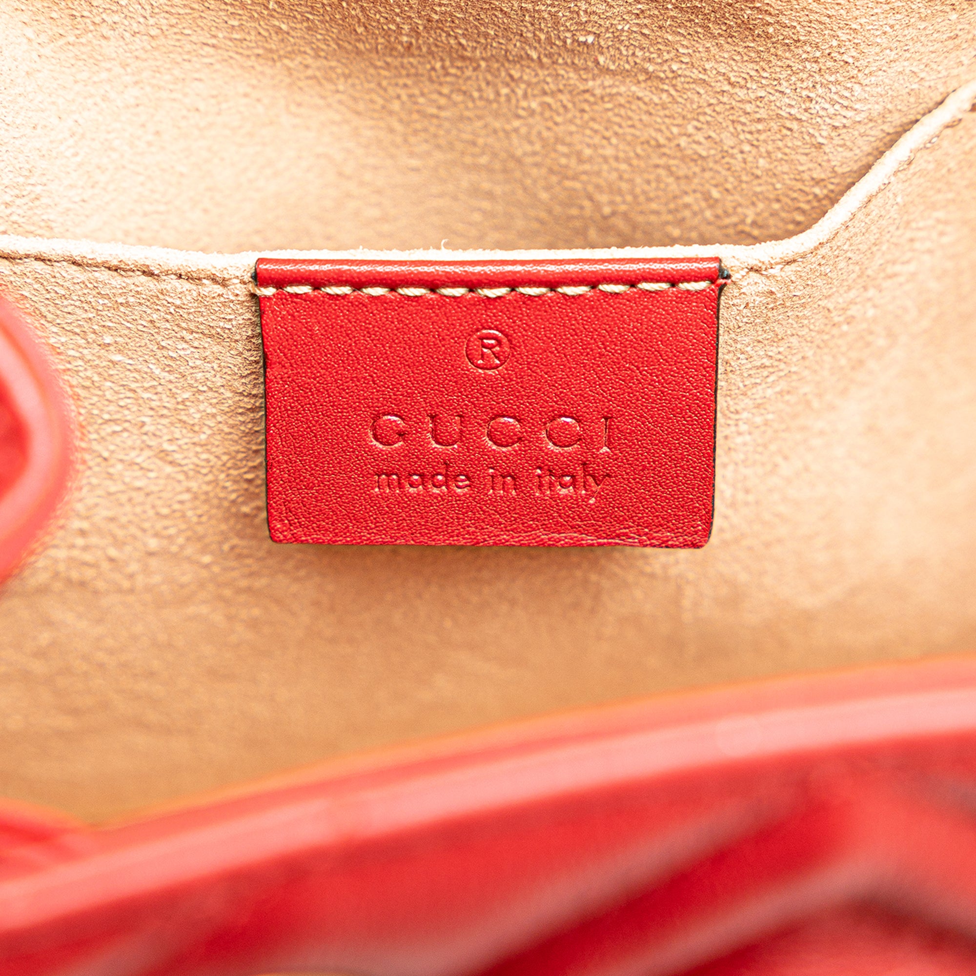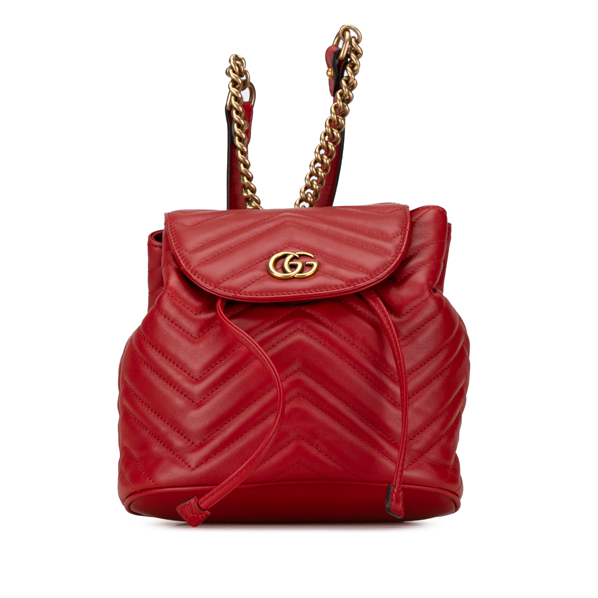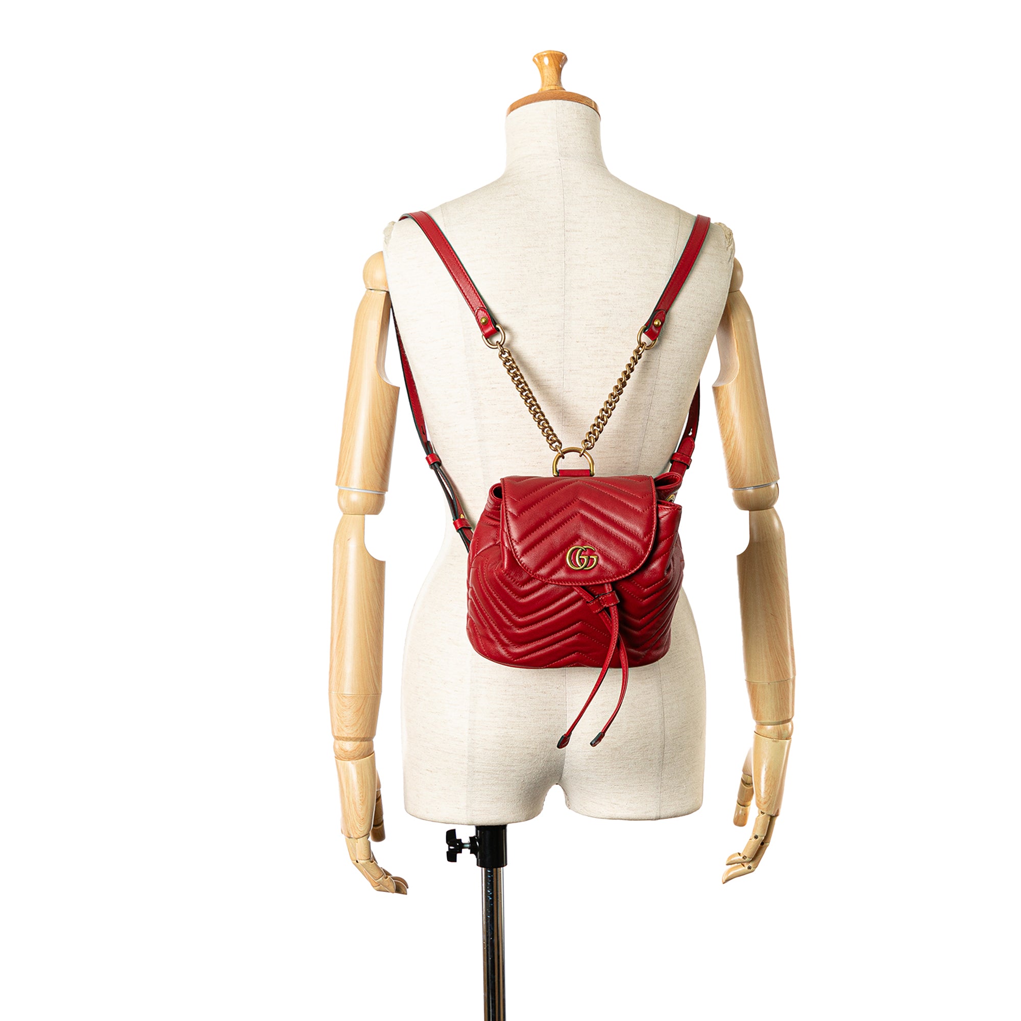 This backpack features a quilted leather body, chain link and flat leather back straps, a top flap with magnetic snap closure, a drawstring closure, and interior slip pockets. Retail Price: 3200.00
