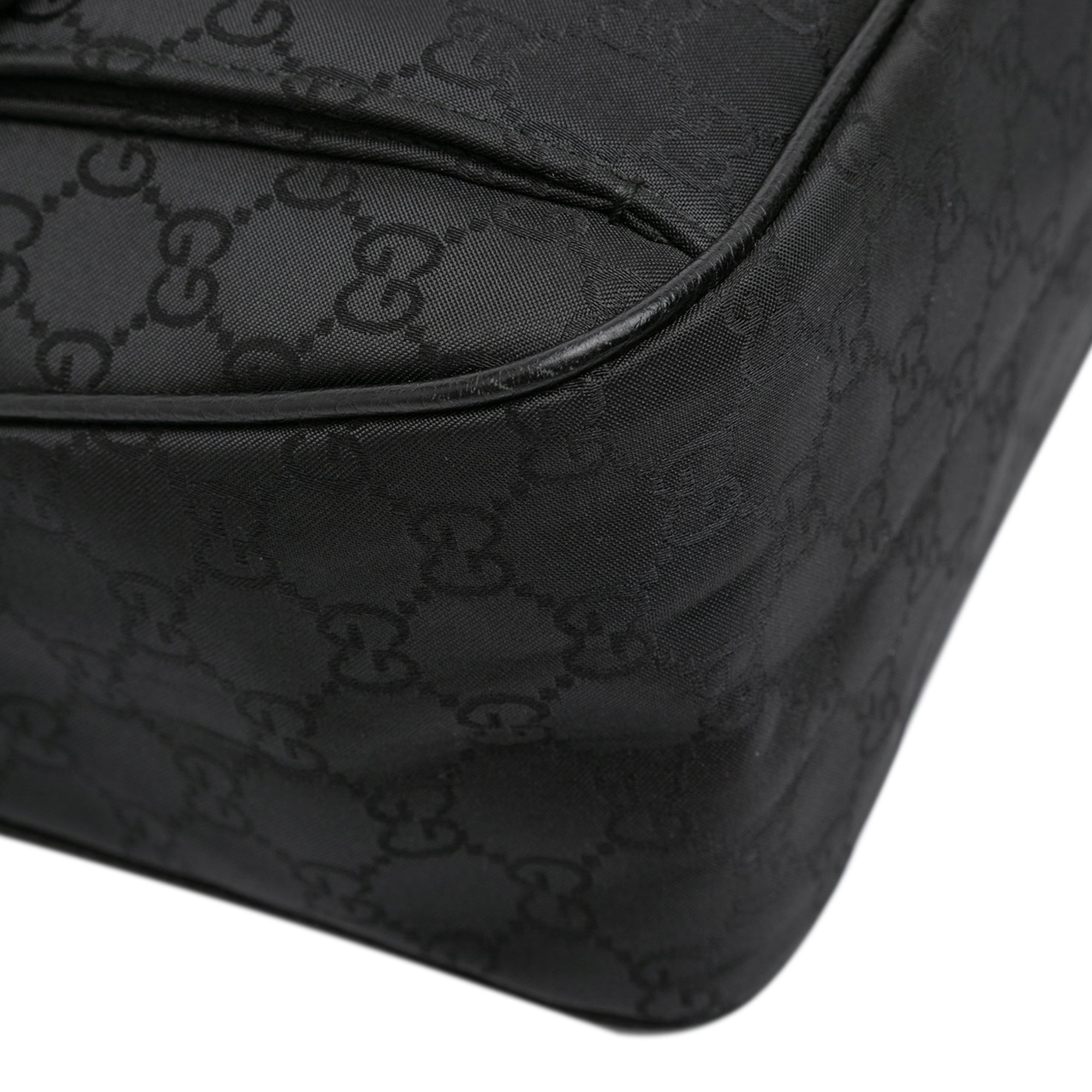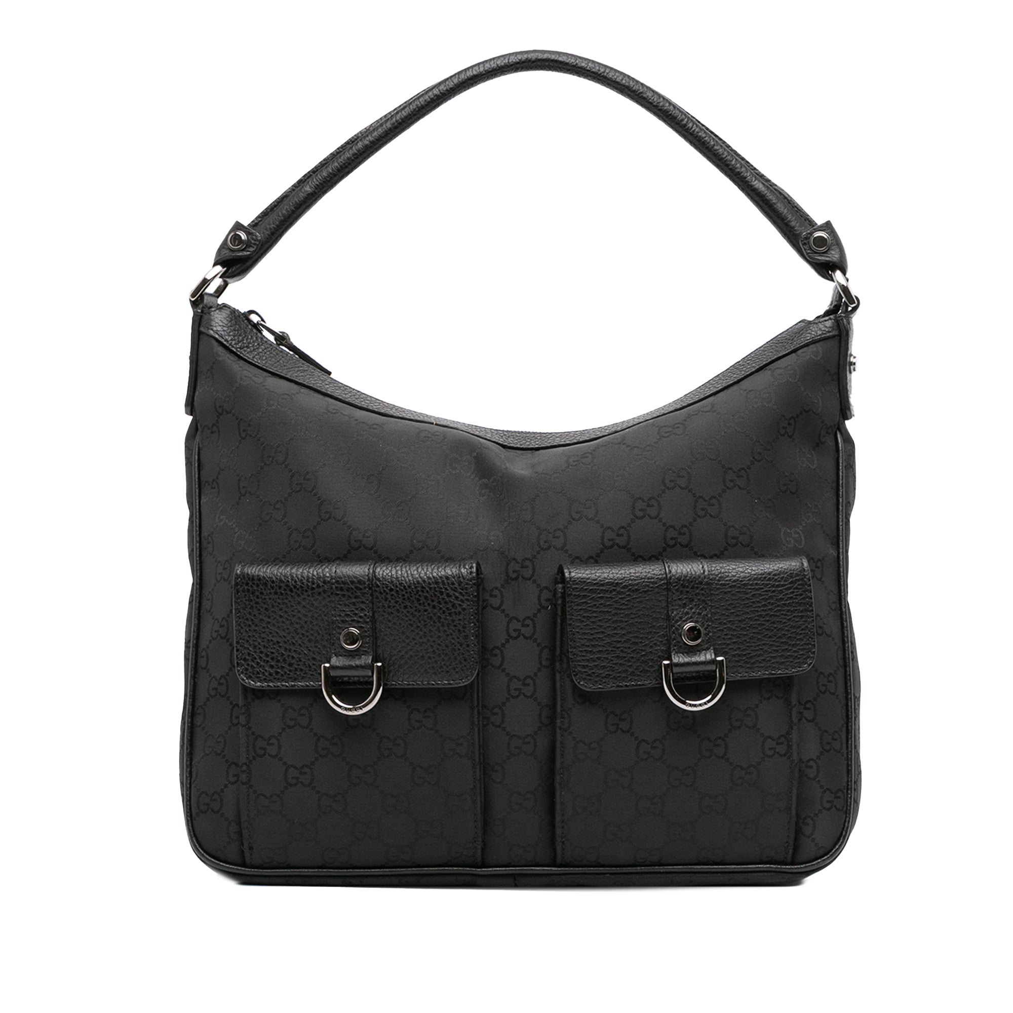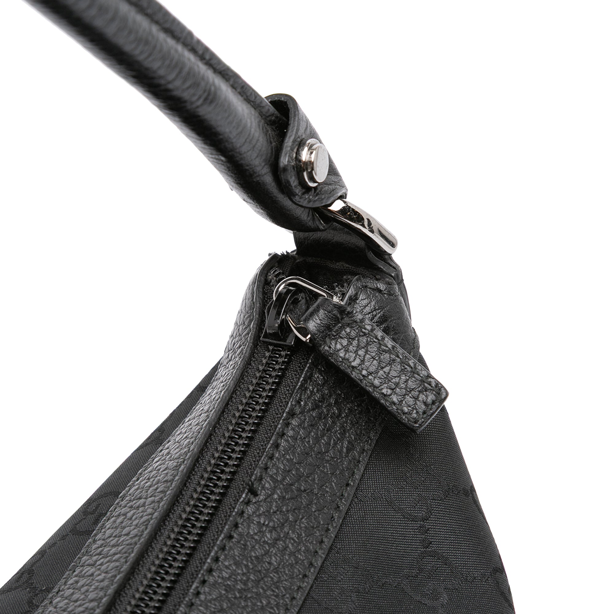 This handbag features a nylon body, rolled leather handle, a top zip closure, exterior front flap pockets, and interior zip and slip pockets. Retail Price: 1100.00