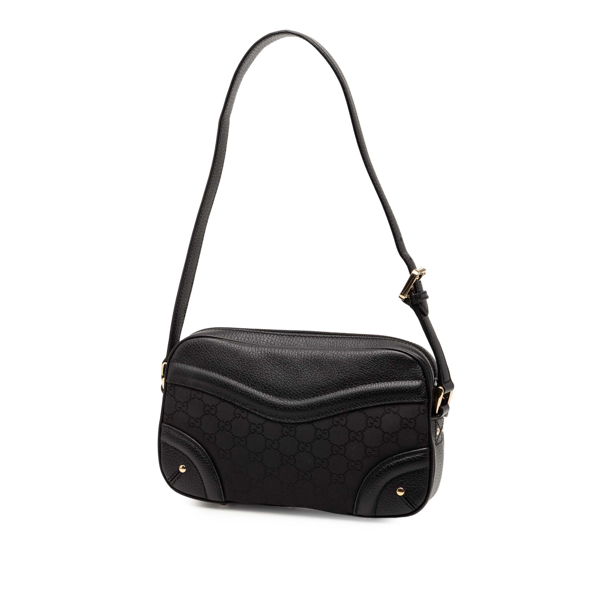 This shoulder bag features a nylon and leather body, a flat leather strap, a top zip closure, and interior zip and slip pockets. Retail Price: 1979.00