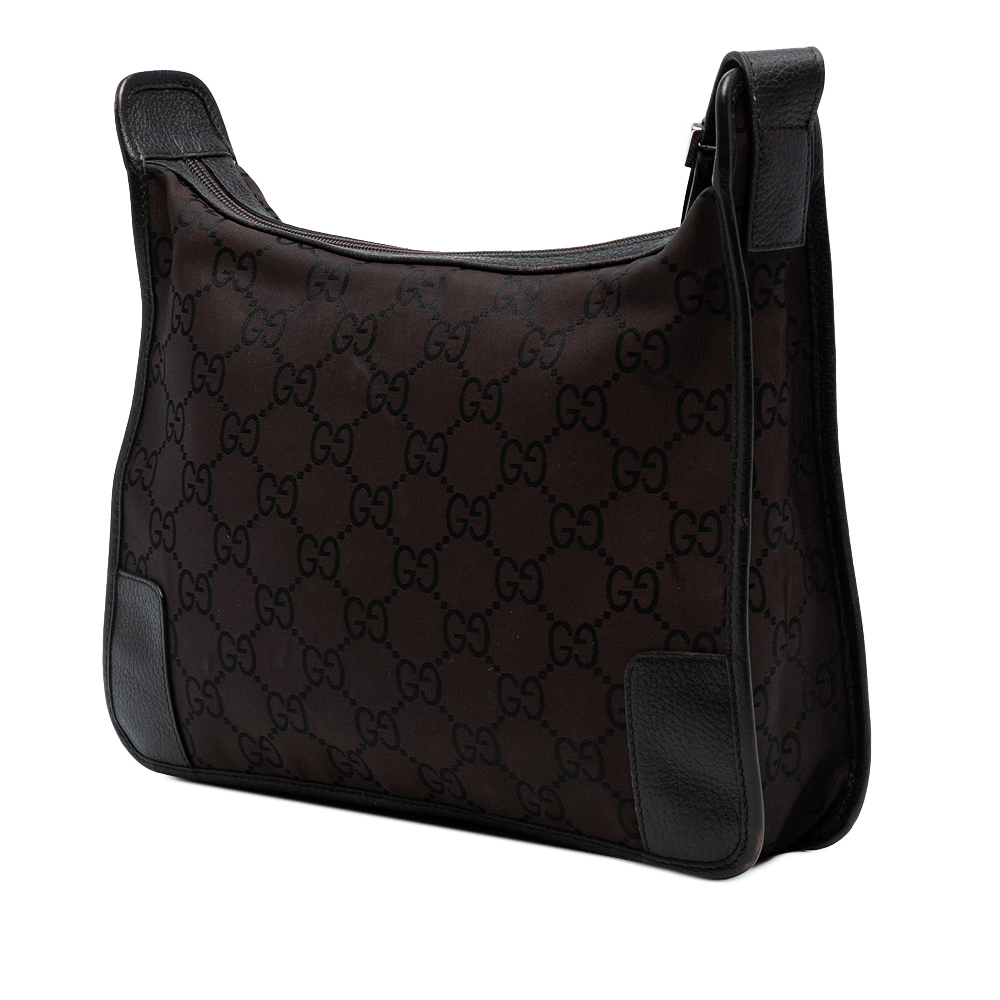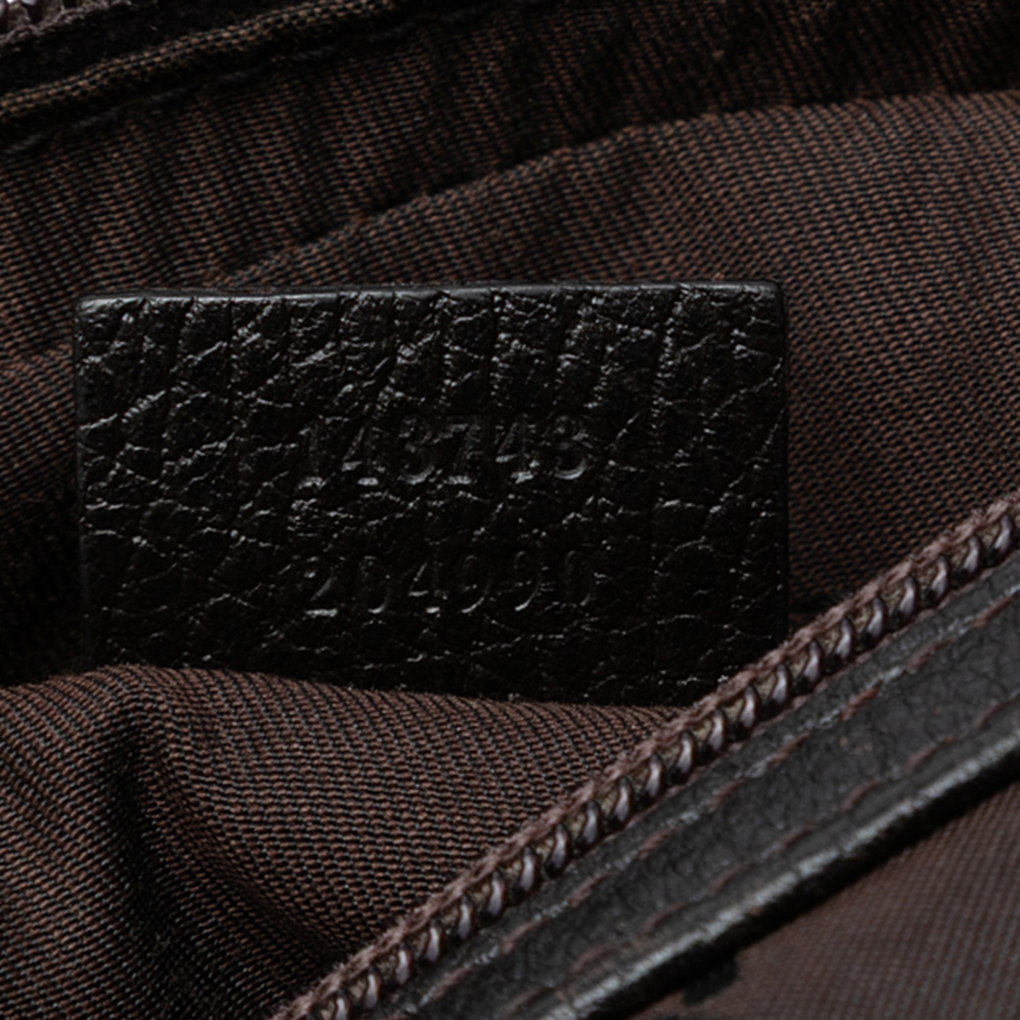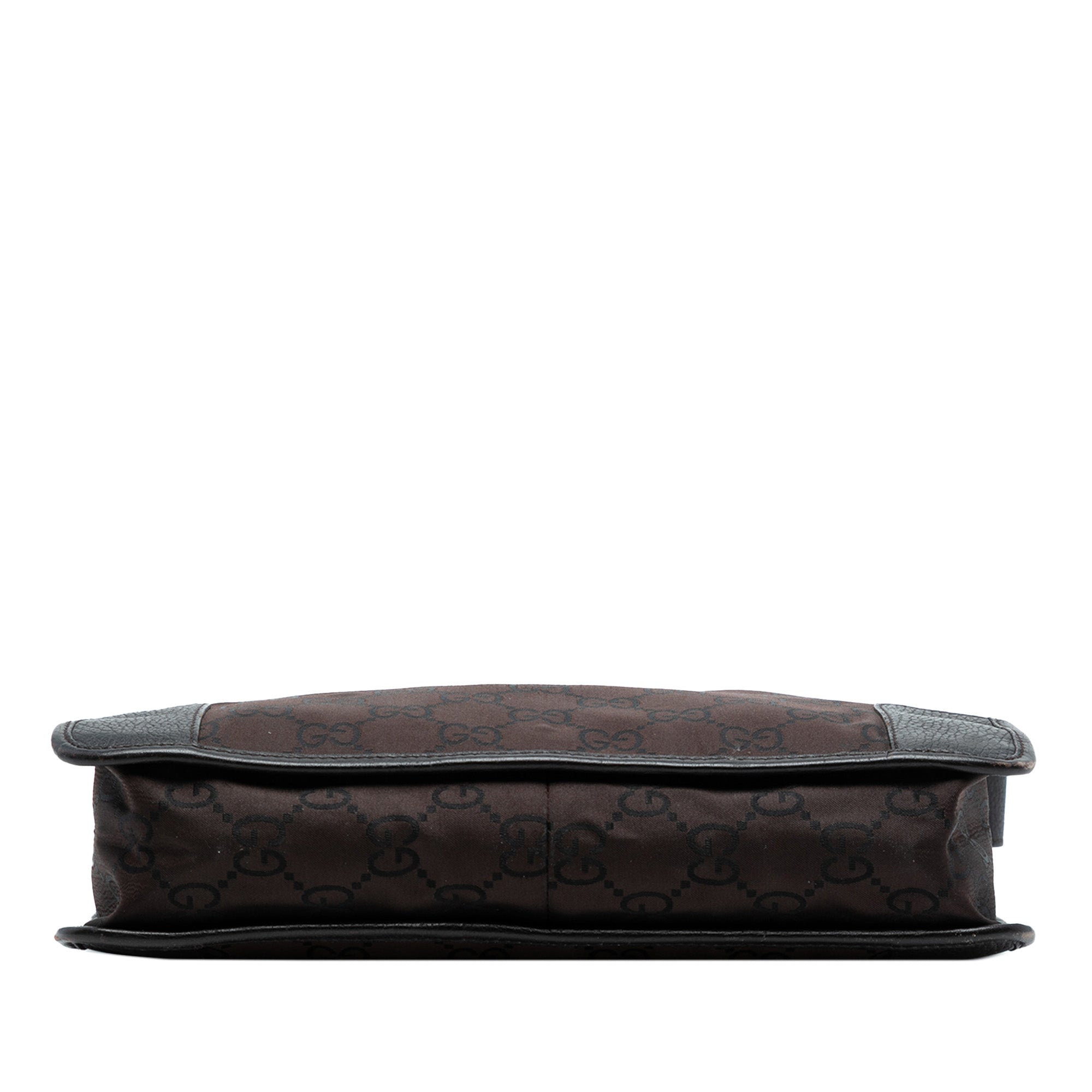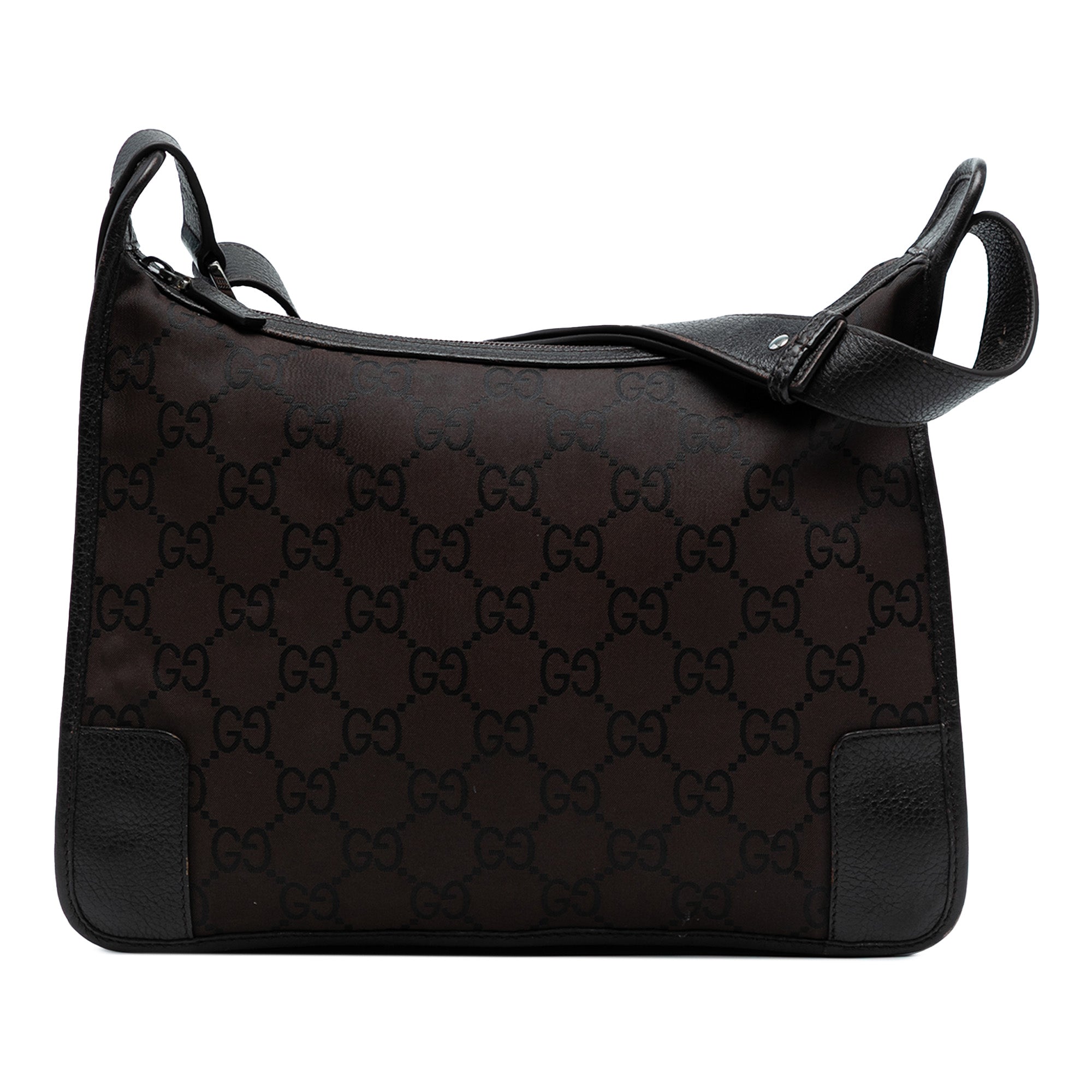 This shoulder bag features a nylon body and leather trim, a flat leather strap, a top zip closure, and an interior zip pocket. Retail Price: 795.00