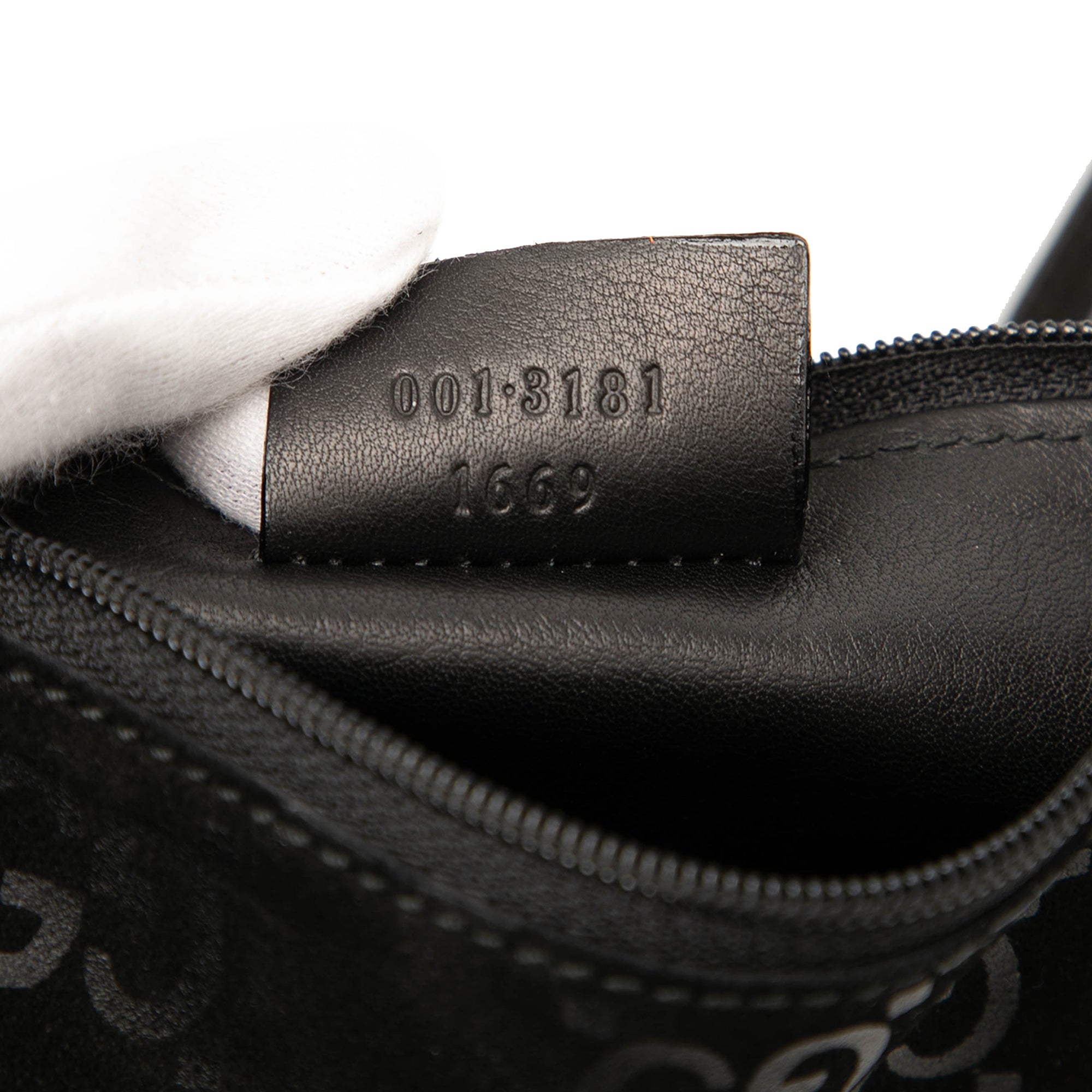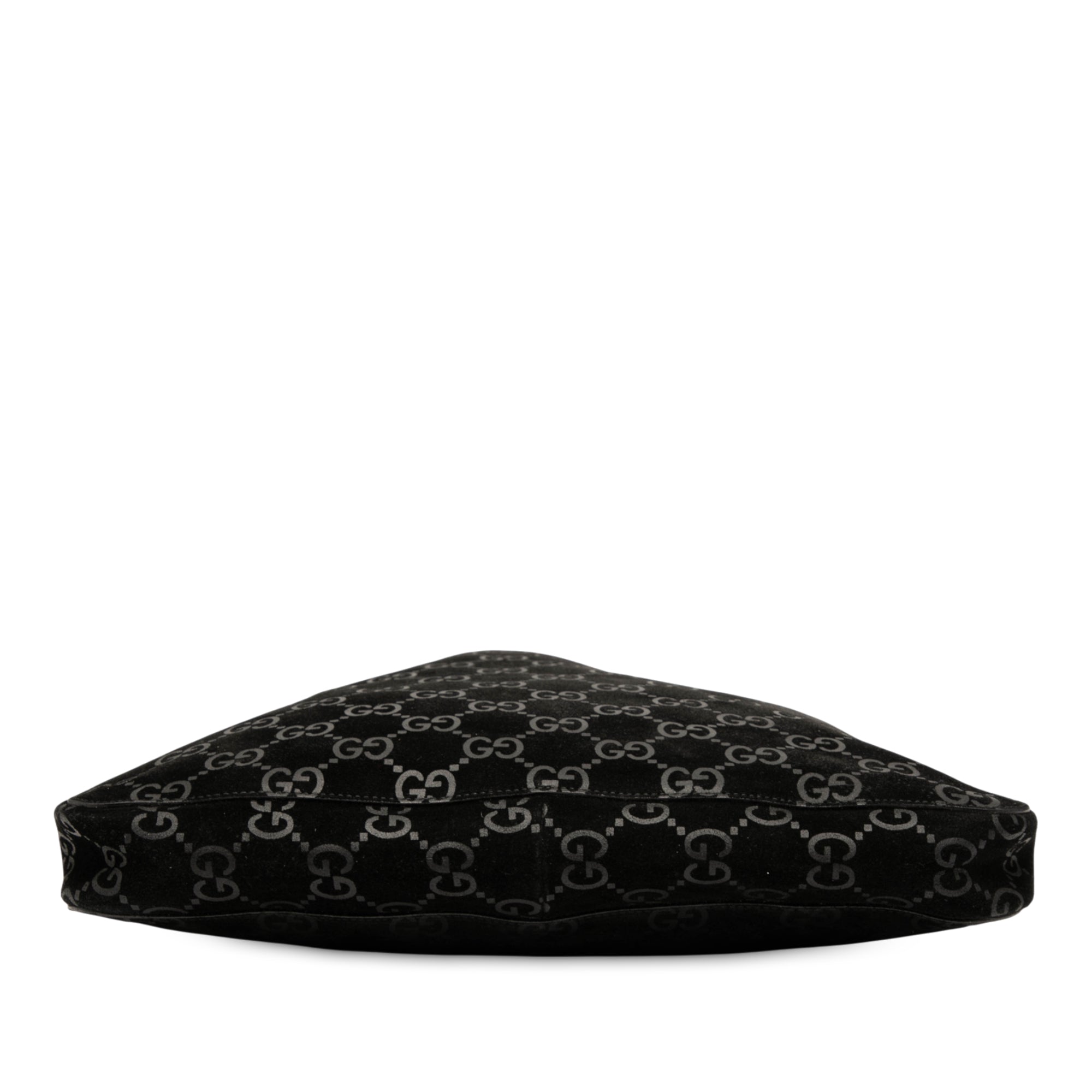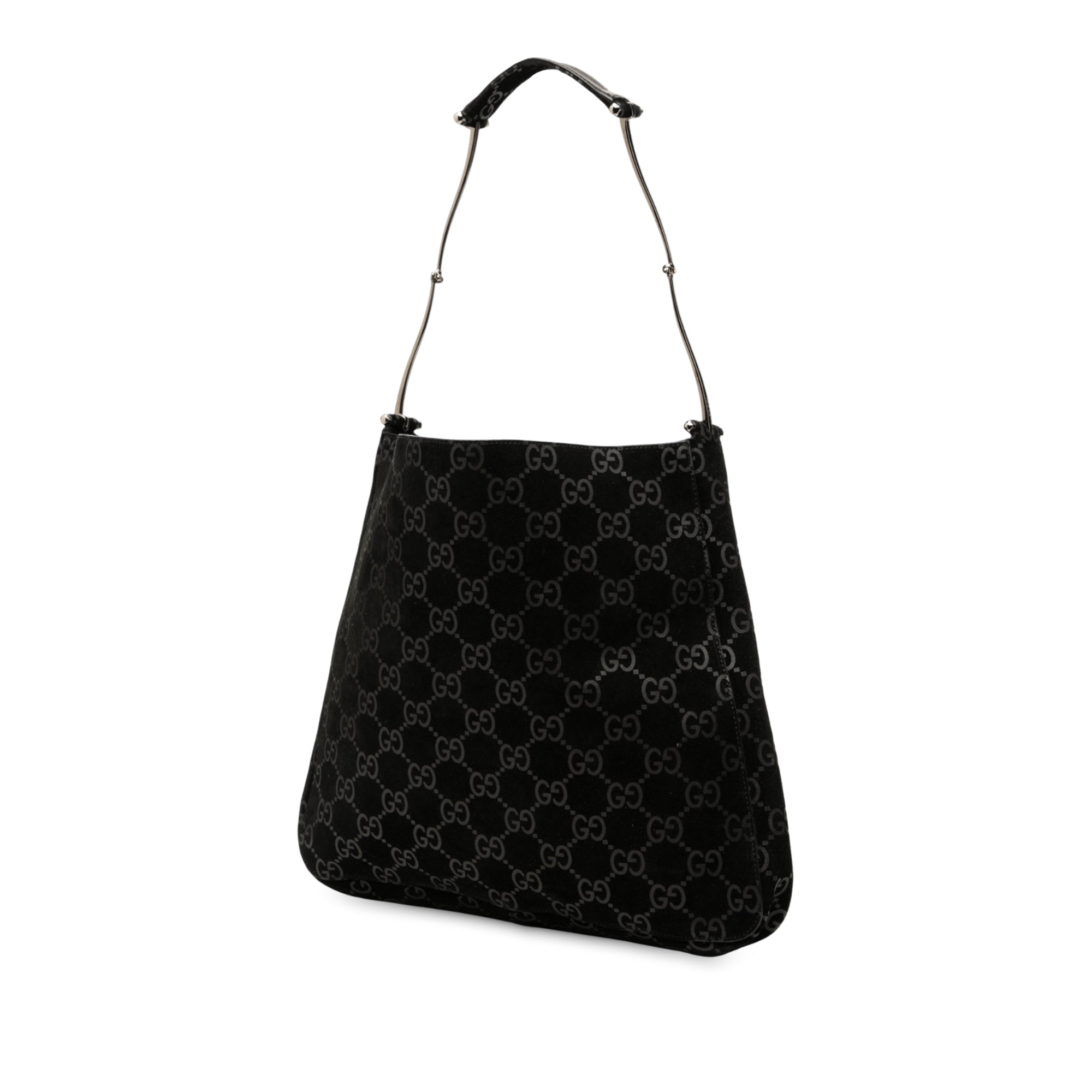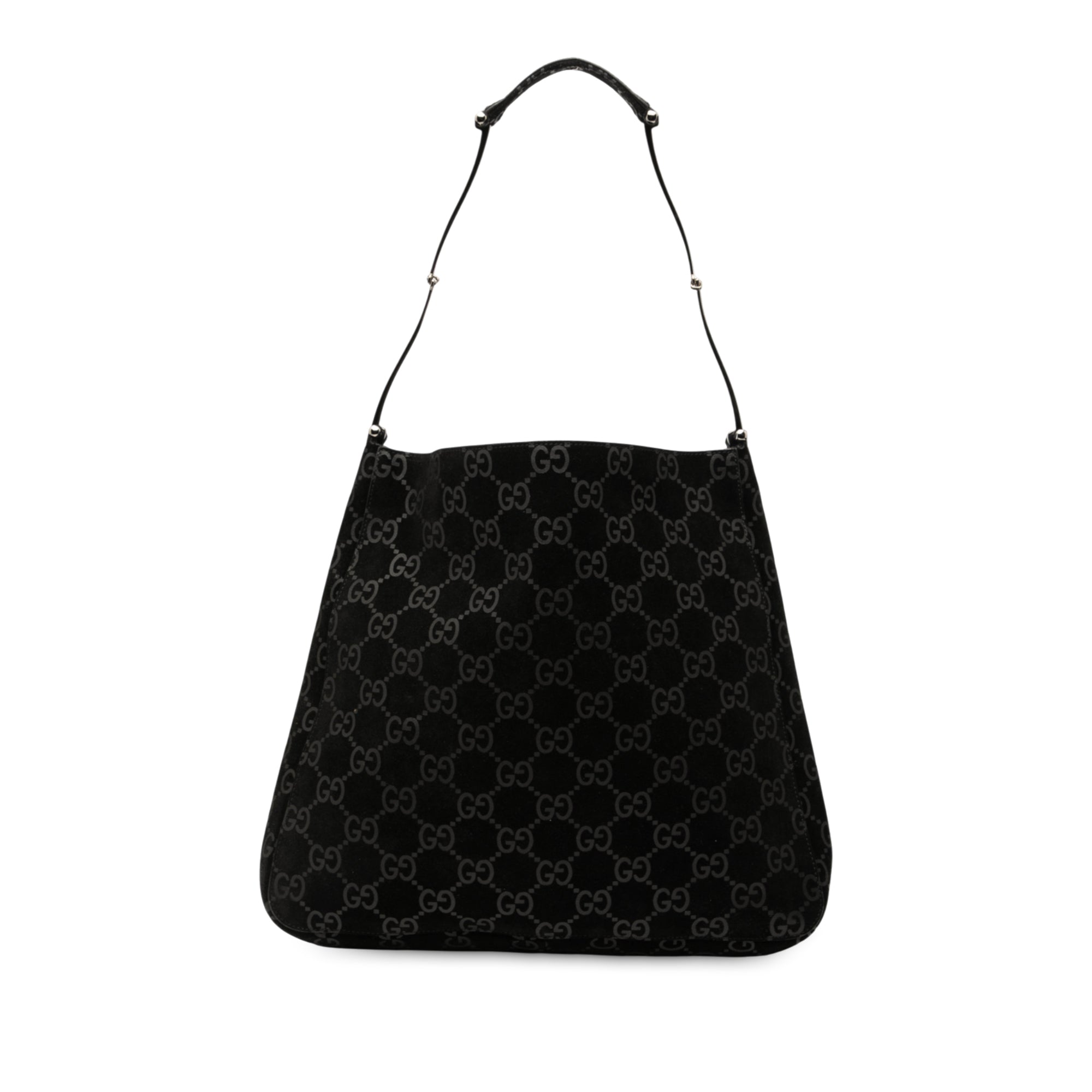 This shoulder bag features a suede leather body, a metal strap with leather guard, an open top with magnetic snap closure, an interior zip pocket, and a pouch inclusion. Retail Price: 700.00