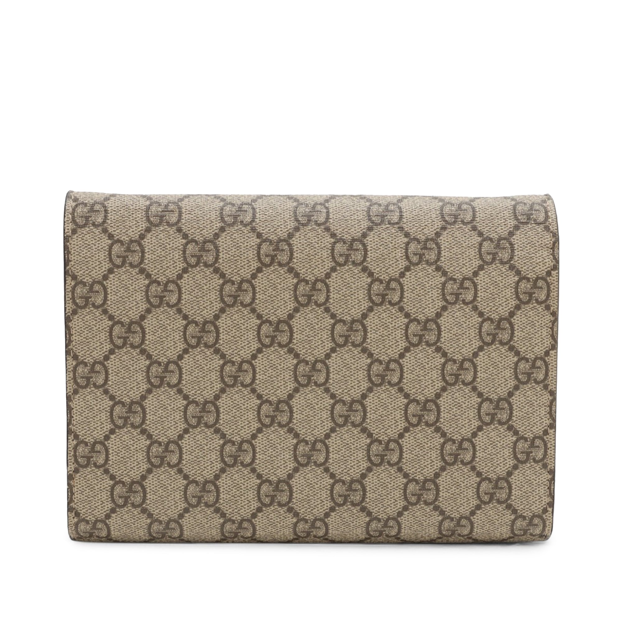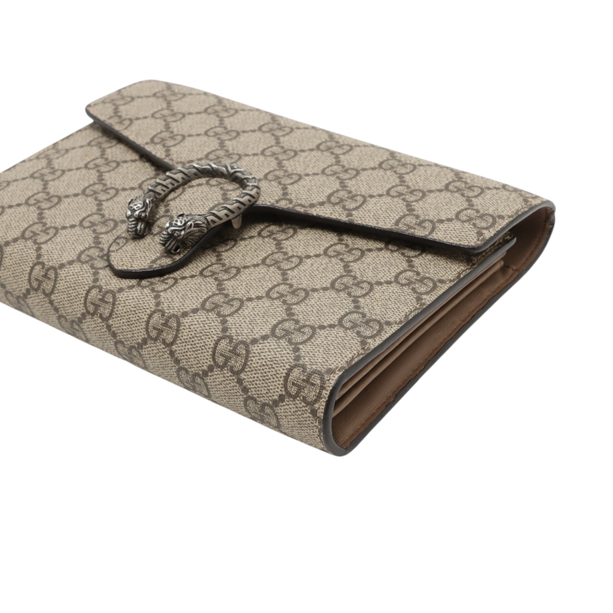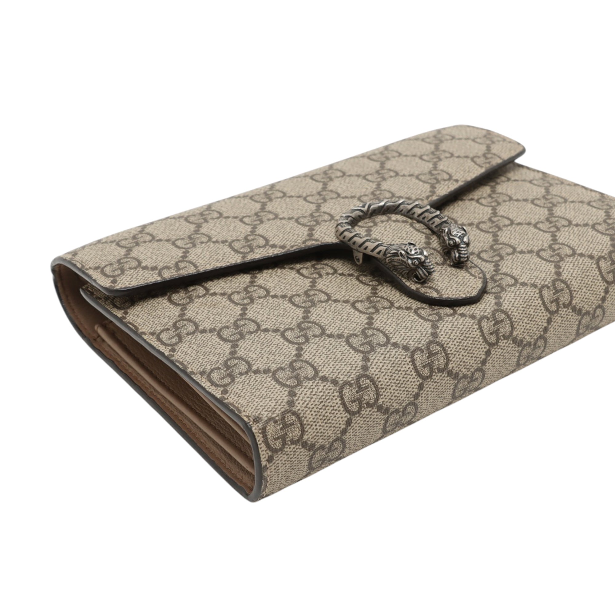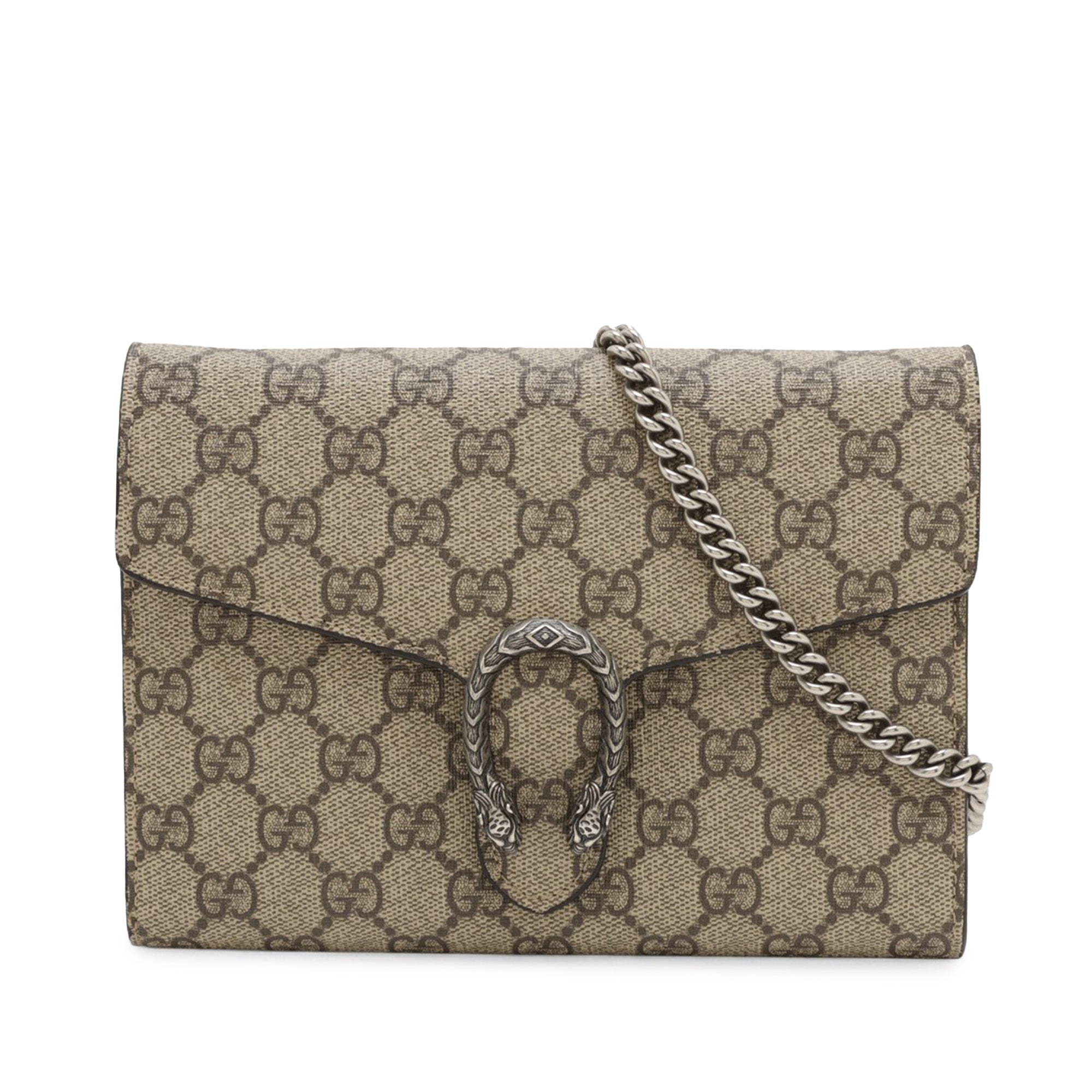 This wallet on chain features a coated canvas body, a detachable silver-tone chain-link strap, a front flap with a snap closure, and interior zip and slip compartments. Retail Price: 1650.00