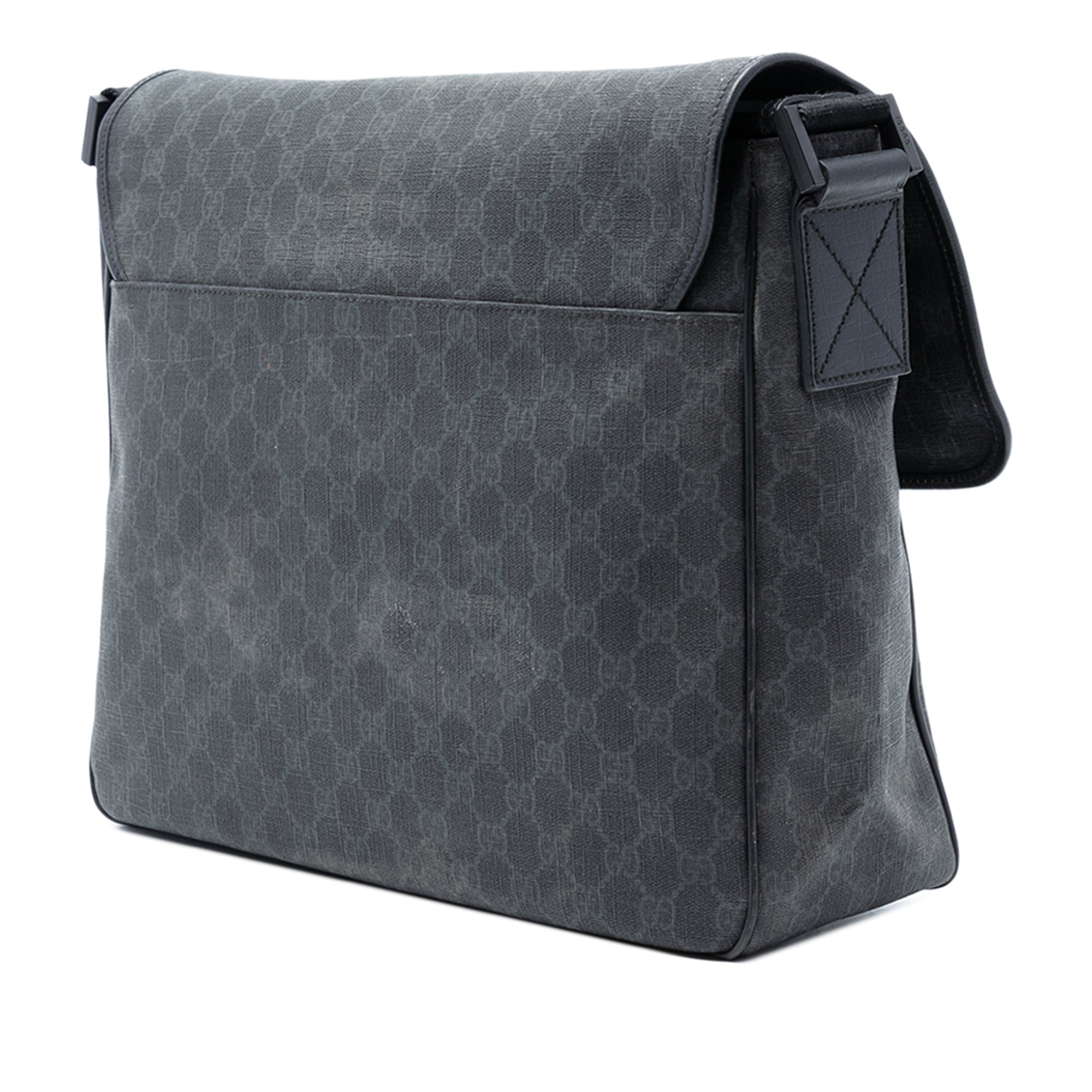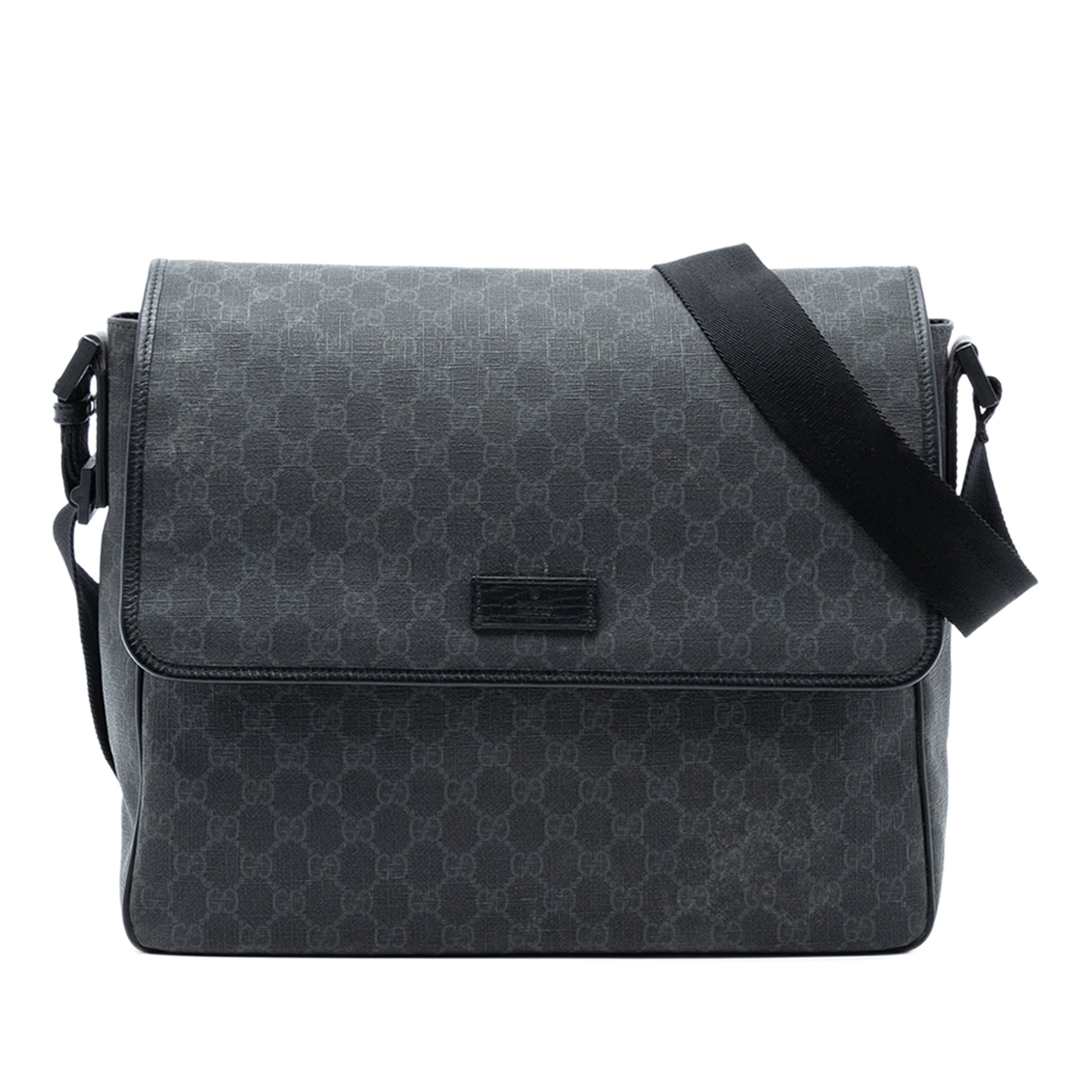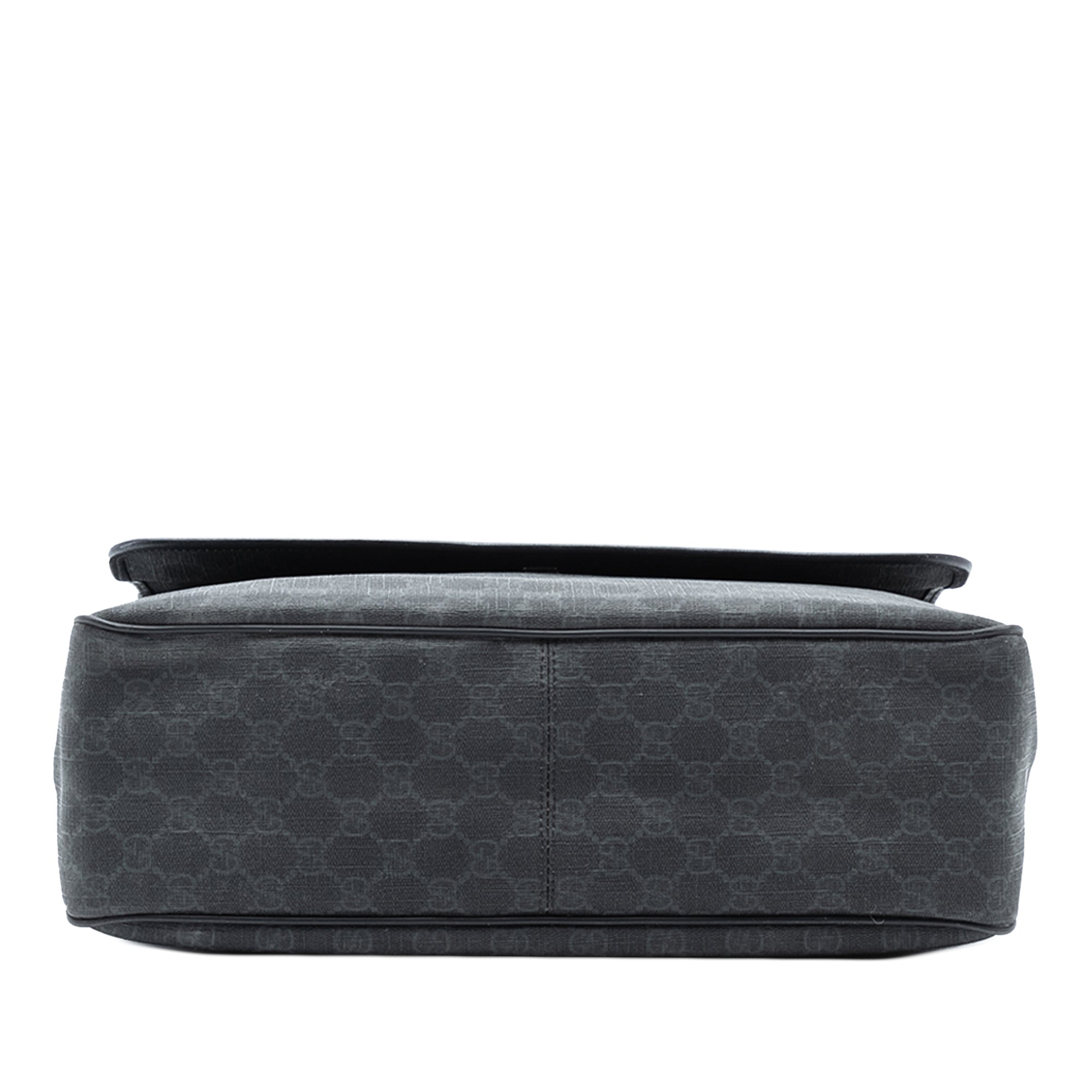 This crossbody bag features a coated canvas body with leather trim, an adjustable flat canvas strap, a front flap with magnetic snap closure, and an interior zip pocket. Retail Price: 1440.00