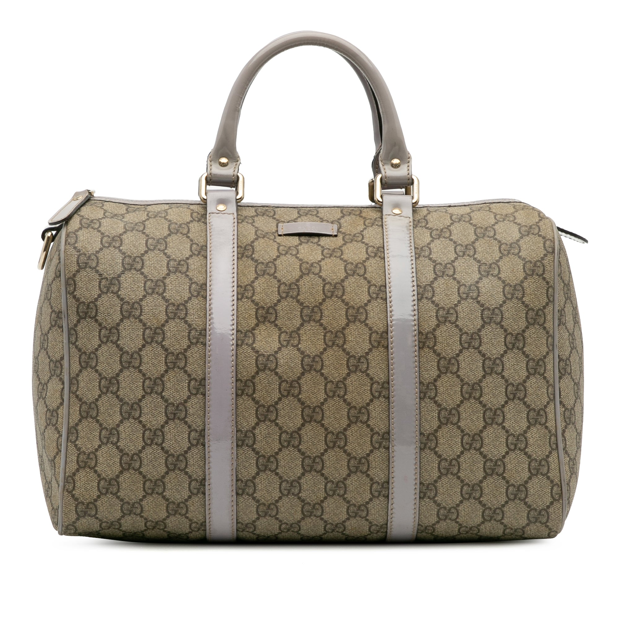 This boston bag features a coated canvas body with leather trim, rolled leather handles, a top zip closure, and an interior slip pocket. Retail Price: 1050.00
