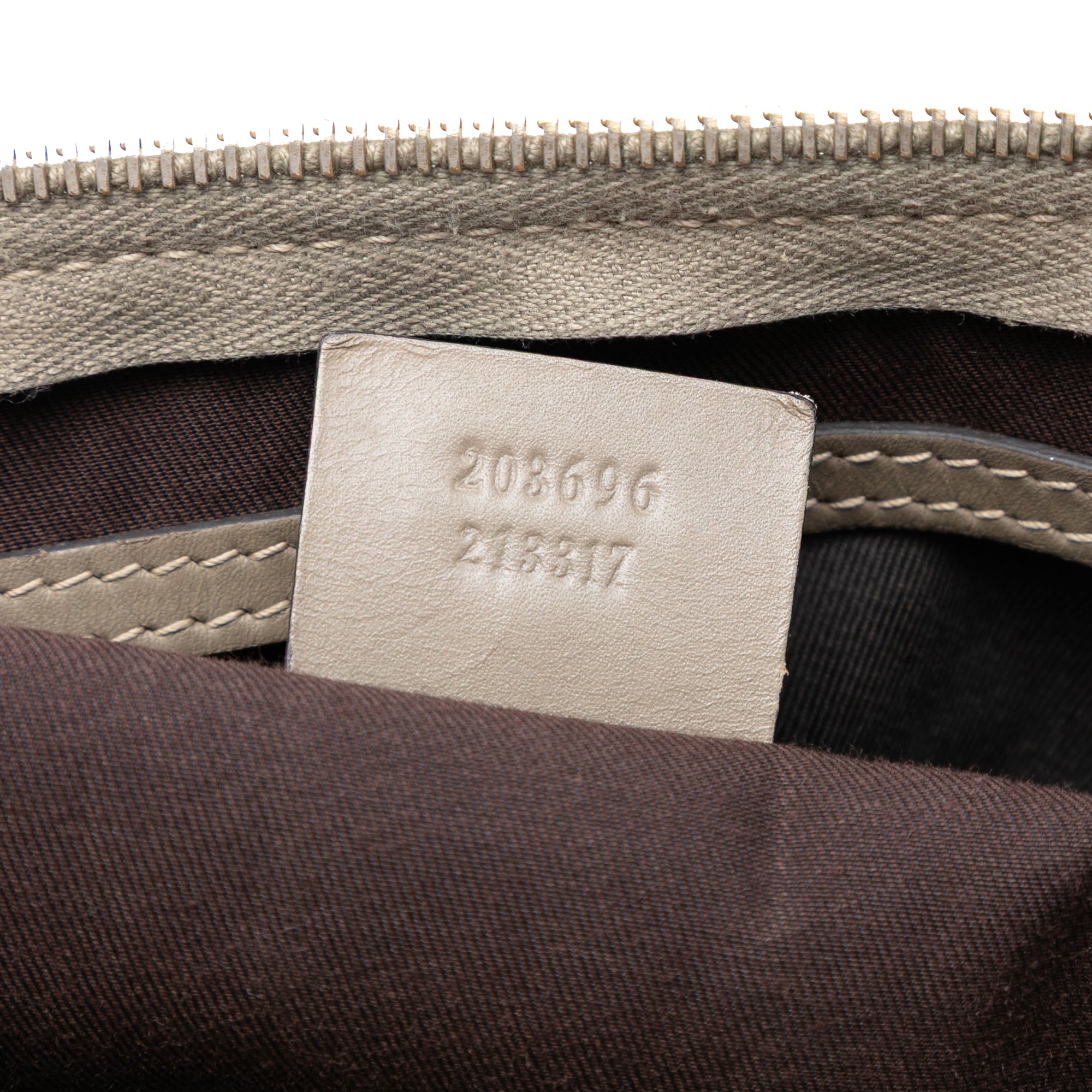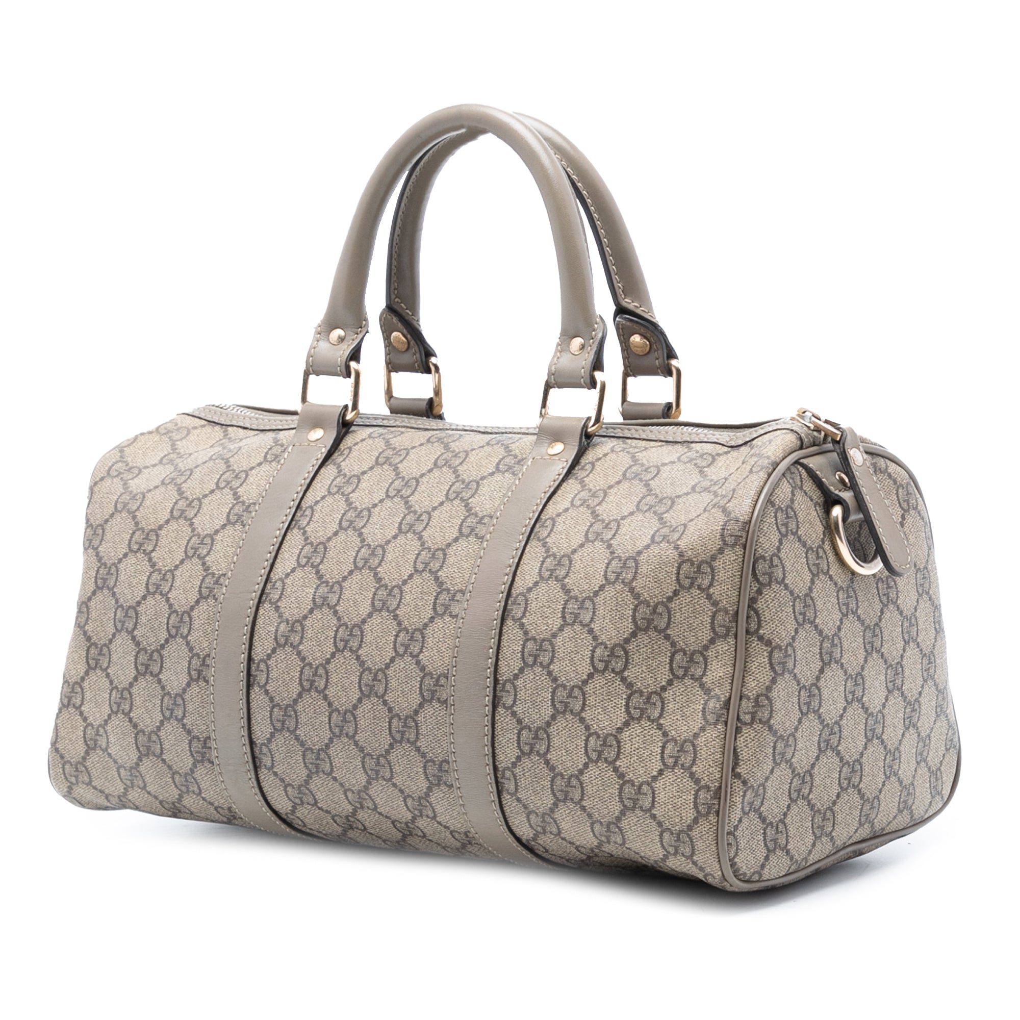 The Joy boston bag features a coated canvas body with leather trim, rolled leather handles, a detachable leather strap, a top zip closure, and an interior slip pocket. Retail Price: 1050.00
