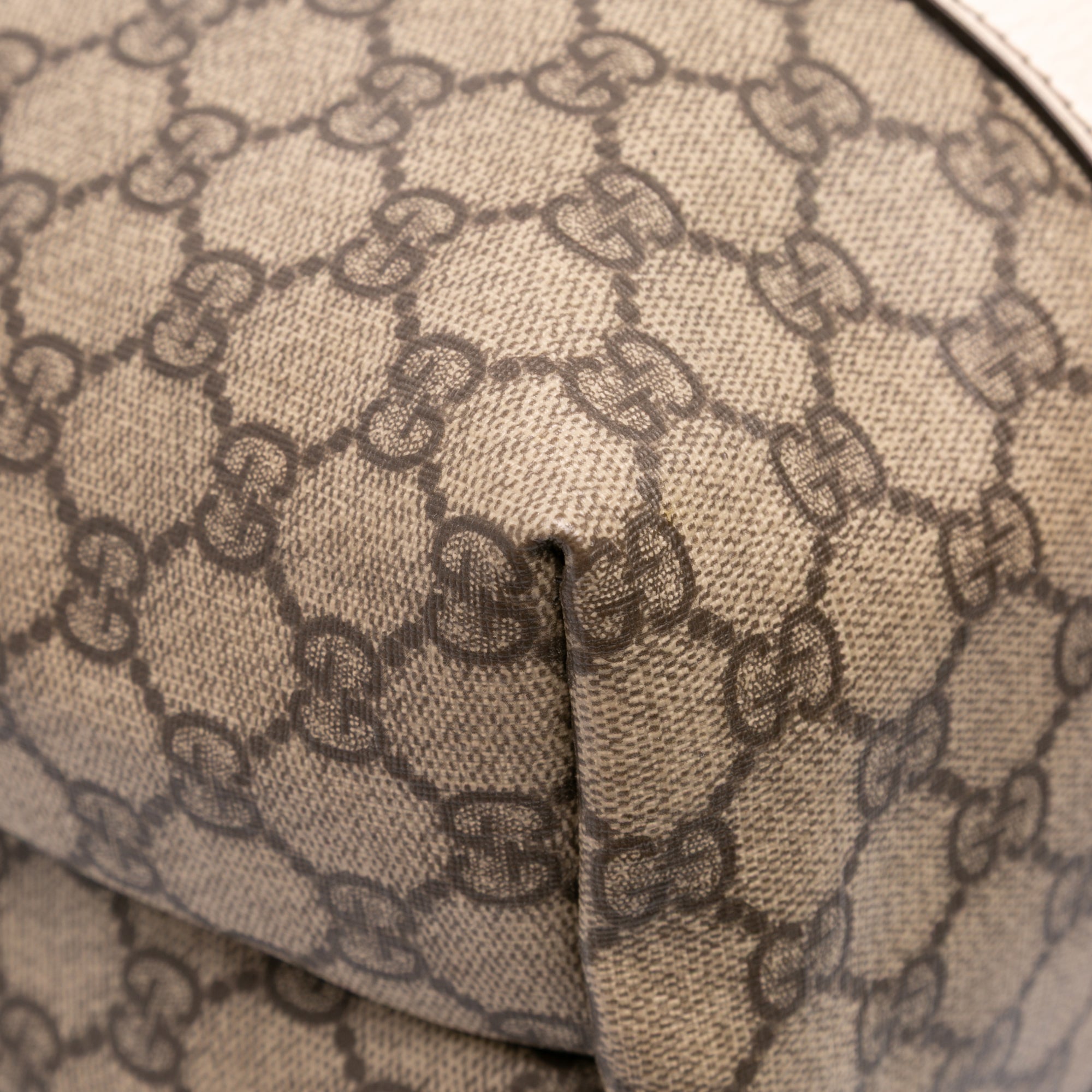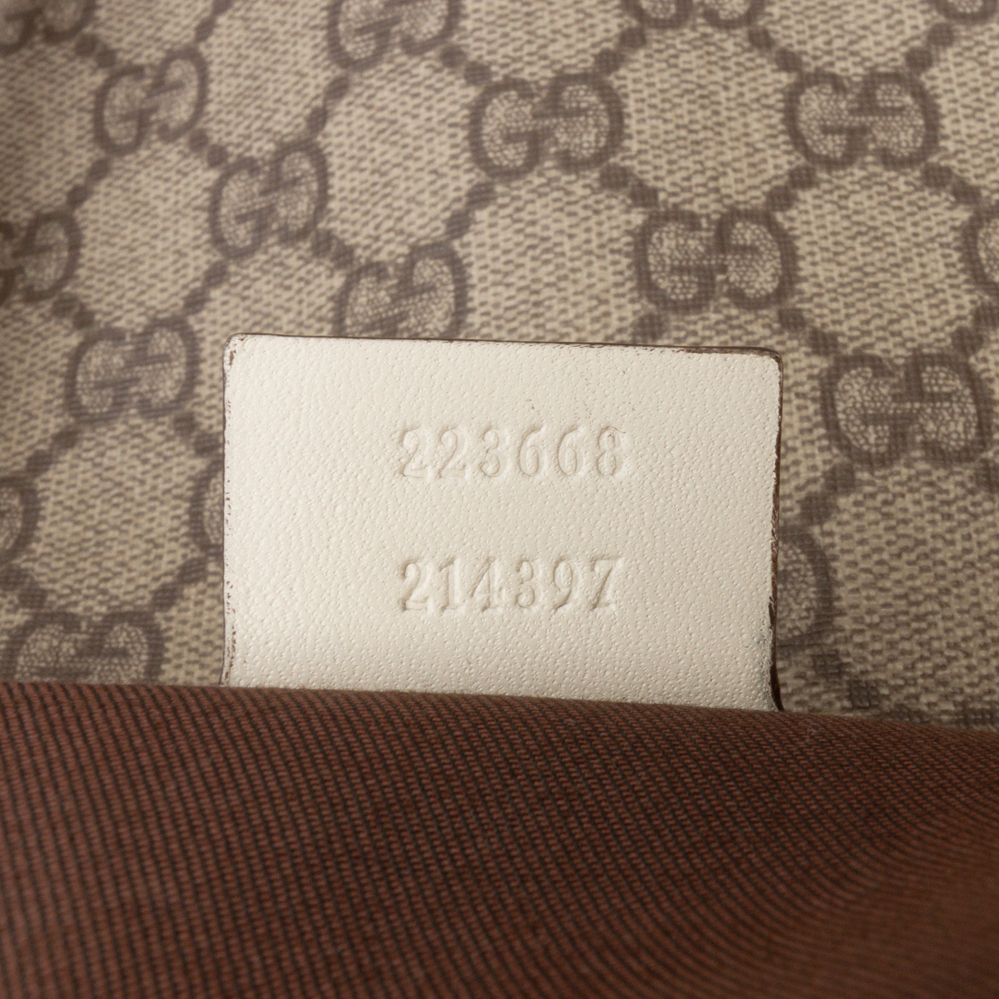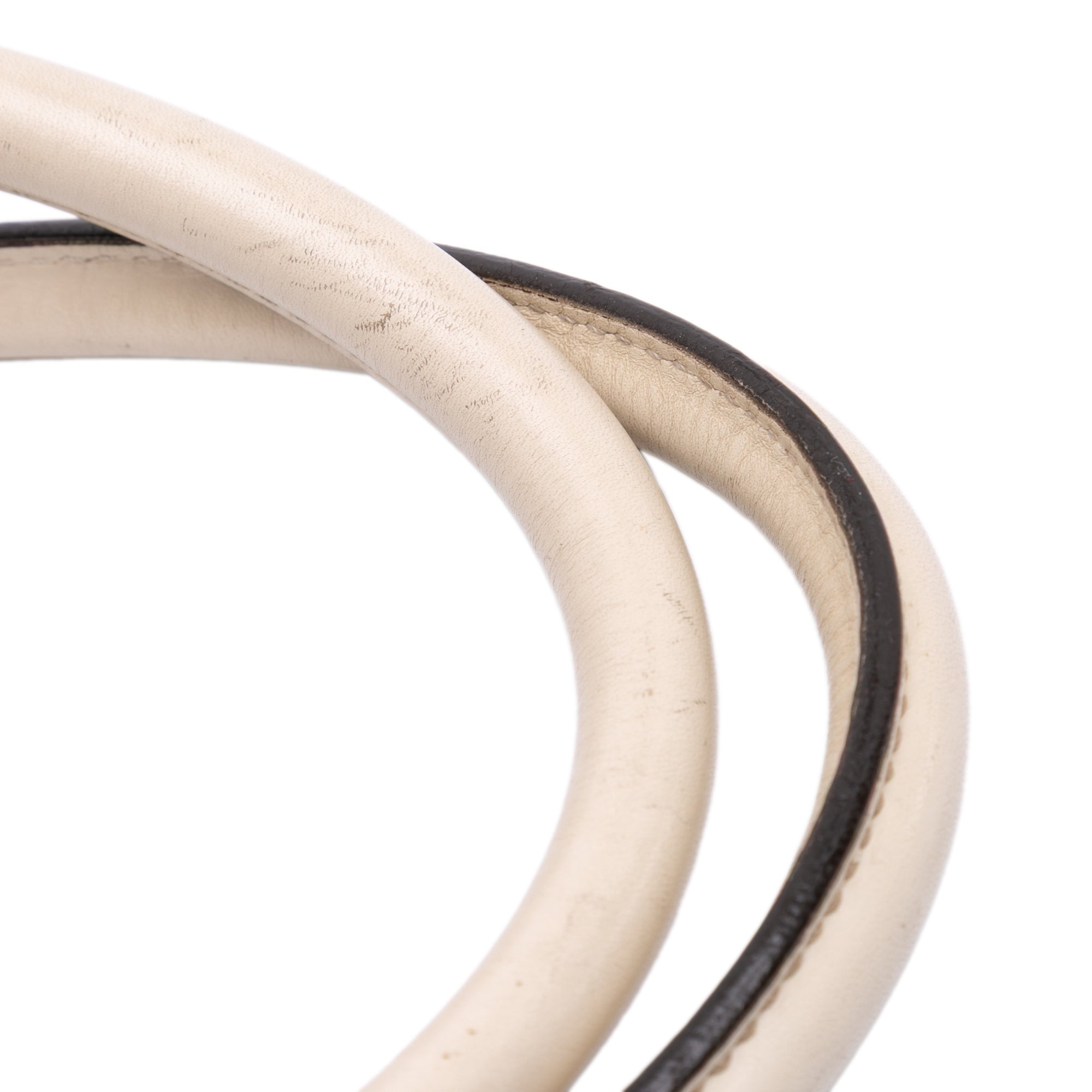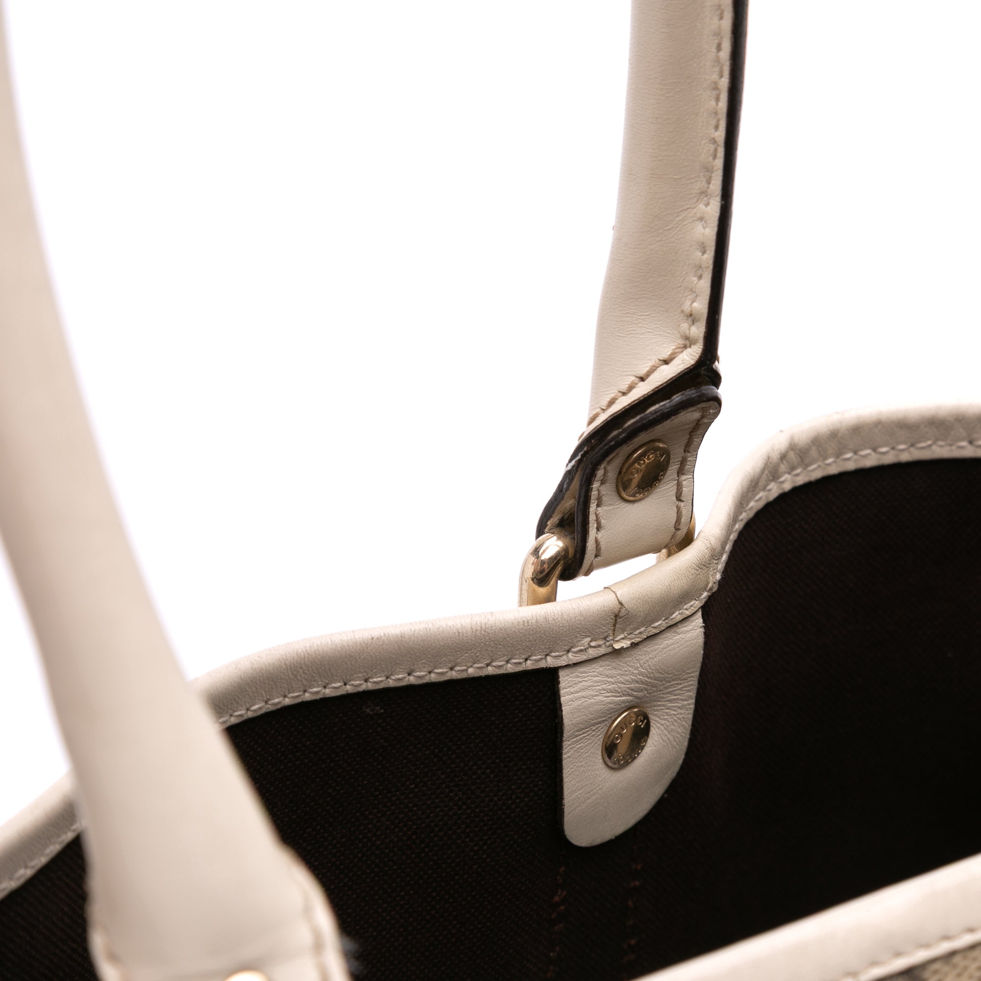 This tote bag features a coated canvas body with leather trim, rolled leather handles, an open top with magnetic snap closure, and an interior zip pocket. Retail Price: 830.00